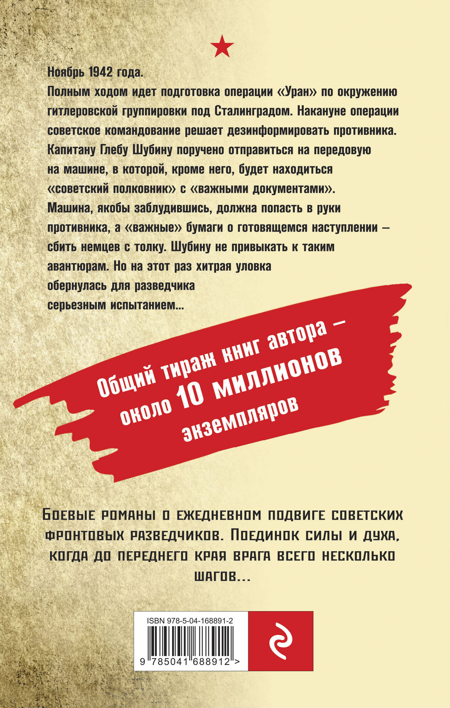 Боевые романы о ежедневном подвиге советских фронтовых разведчиков. Поединок силы и духа, когда до переднего края врага всего несколько шагов. Подробности жестоких боев, о которых не рассказывают даже ветераны - участники тех событий. Ноябрь 1942 года. Полным ходом идет подготовка операции «Уран» по окружению гитлеровской группировки под Сталинградом. Накануне операции советское командование решает дезинформировать противника. Капитану Глебу Шубину поручено отправиться на передовую на машине, в которой, кроме него, будет находиться «советский полковник» с «важными документами». Машина, якобы заблудившись, должна попасть в руки противника, а «важные» бумаги о готовящемся наступлении - сбить немцев с толку. Шубину не привыкать к таким авантюрам. Но на этот раз хитрая уловка обернулась для разведчика серьезным испытанием… Общий тираж книг автора - более 10 миллионов экземпляров.| Издательство | Эксмо |