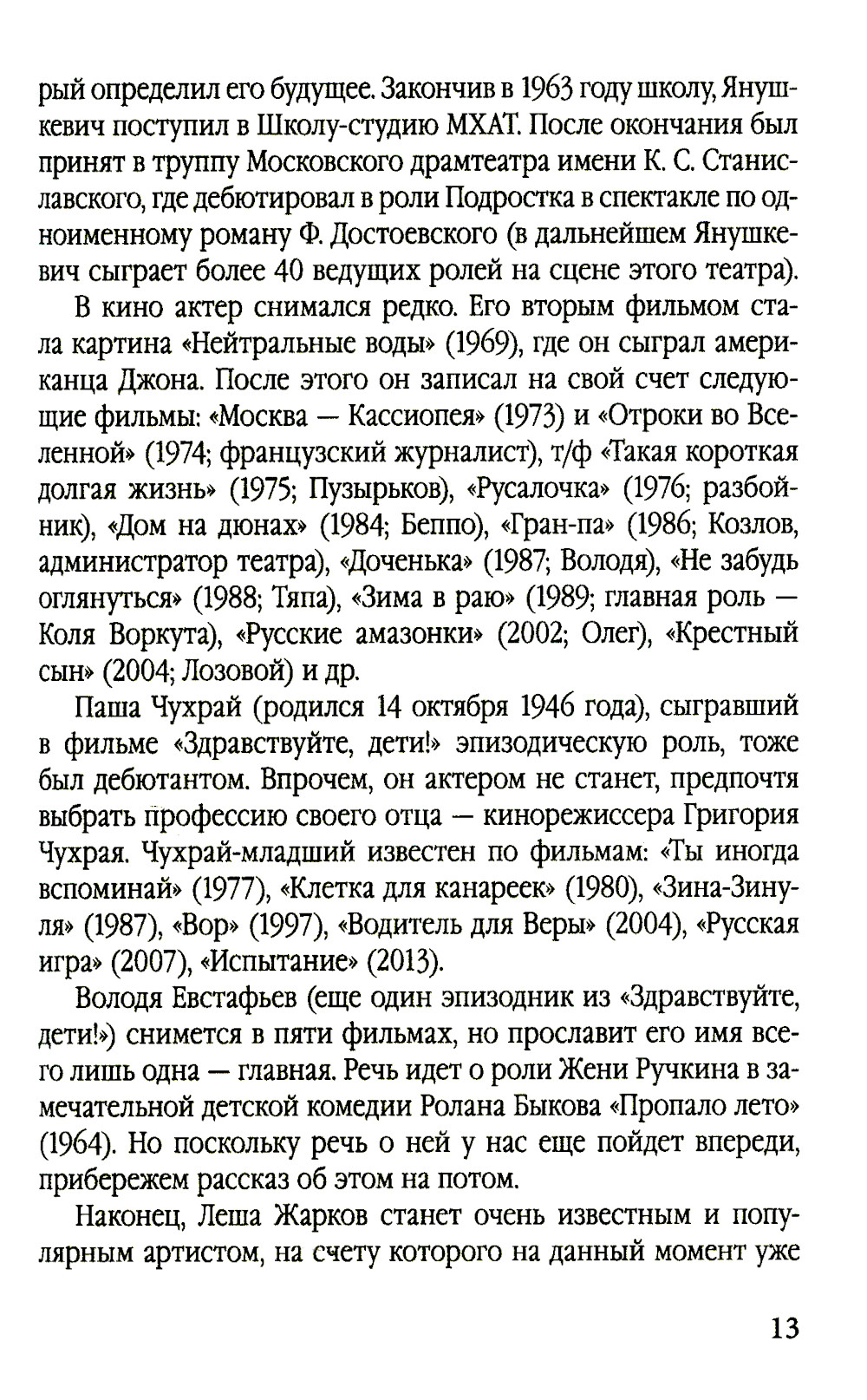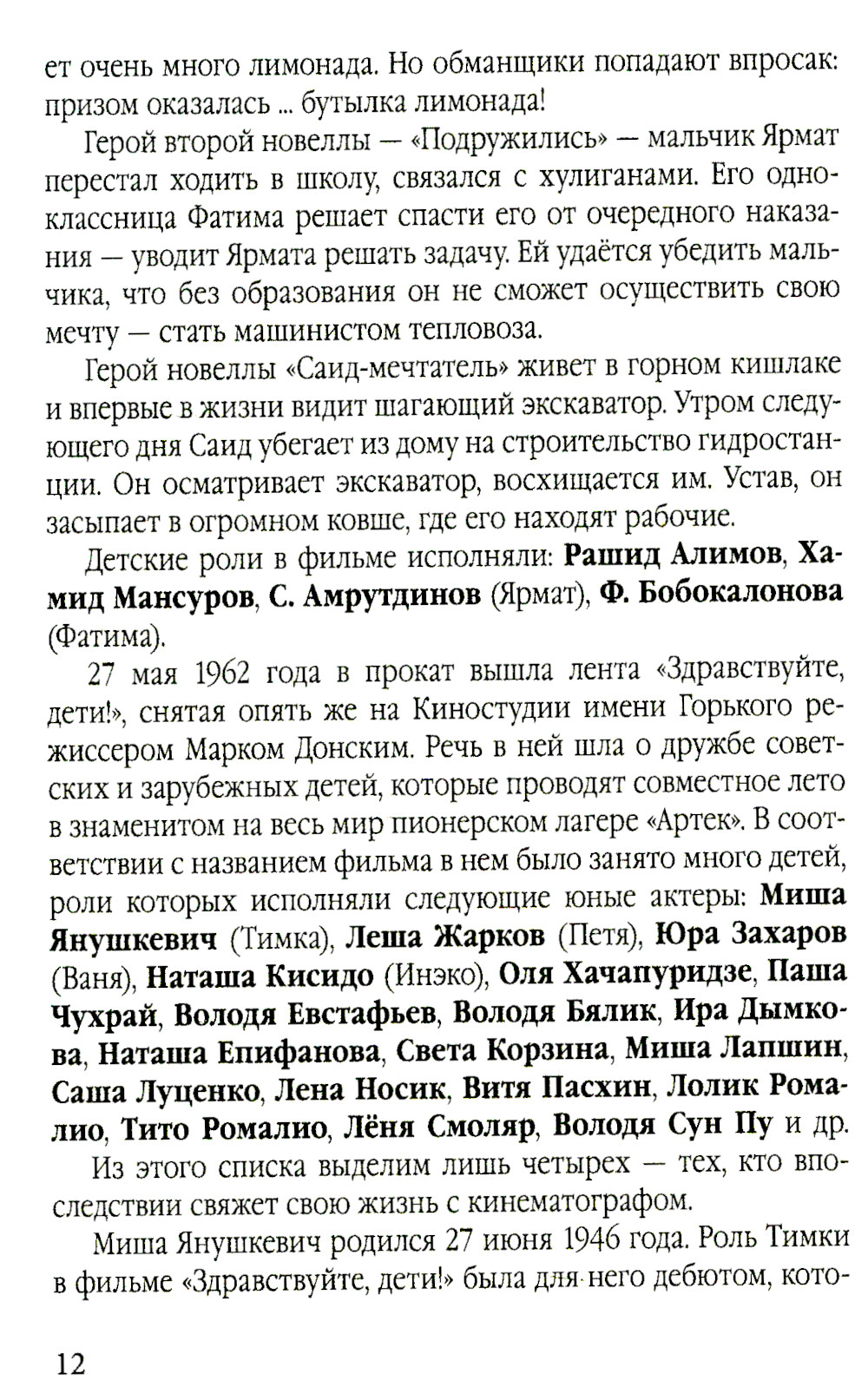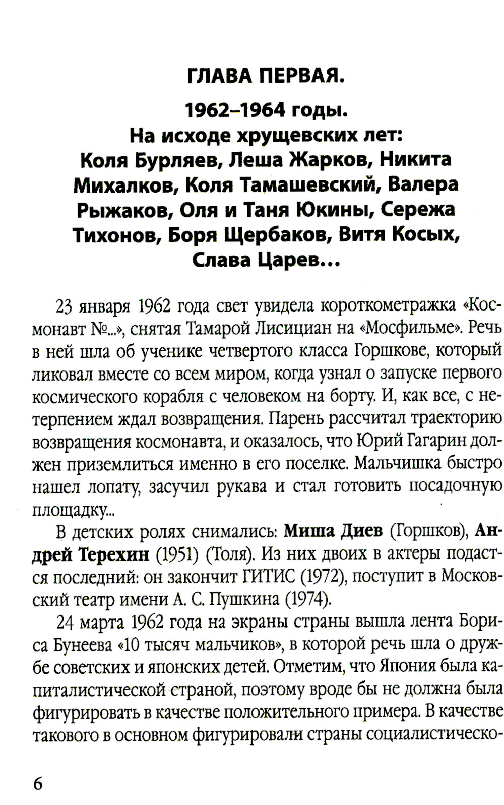 Период 1962-1972 год занимает особое место в истории советского детского кино. Ведь он пришелся на смену двух эпох в культурной жизни Советского Союза. Вместе с отставкой в 1964 году Никиты Хрущева завершилась Оттепель. И начался «развитый социализм» или как его обычно называют - застой. Впервые подробная история советского детского кино и юных звезд, что снимались в этих фильмах. Кто-то из них так и остался исполнителем одной роли, а для кого-то это было начало многолетней карьеры киноактера.| Издательство | Родина |