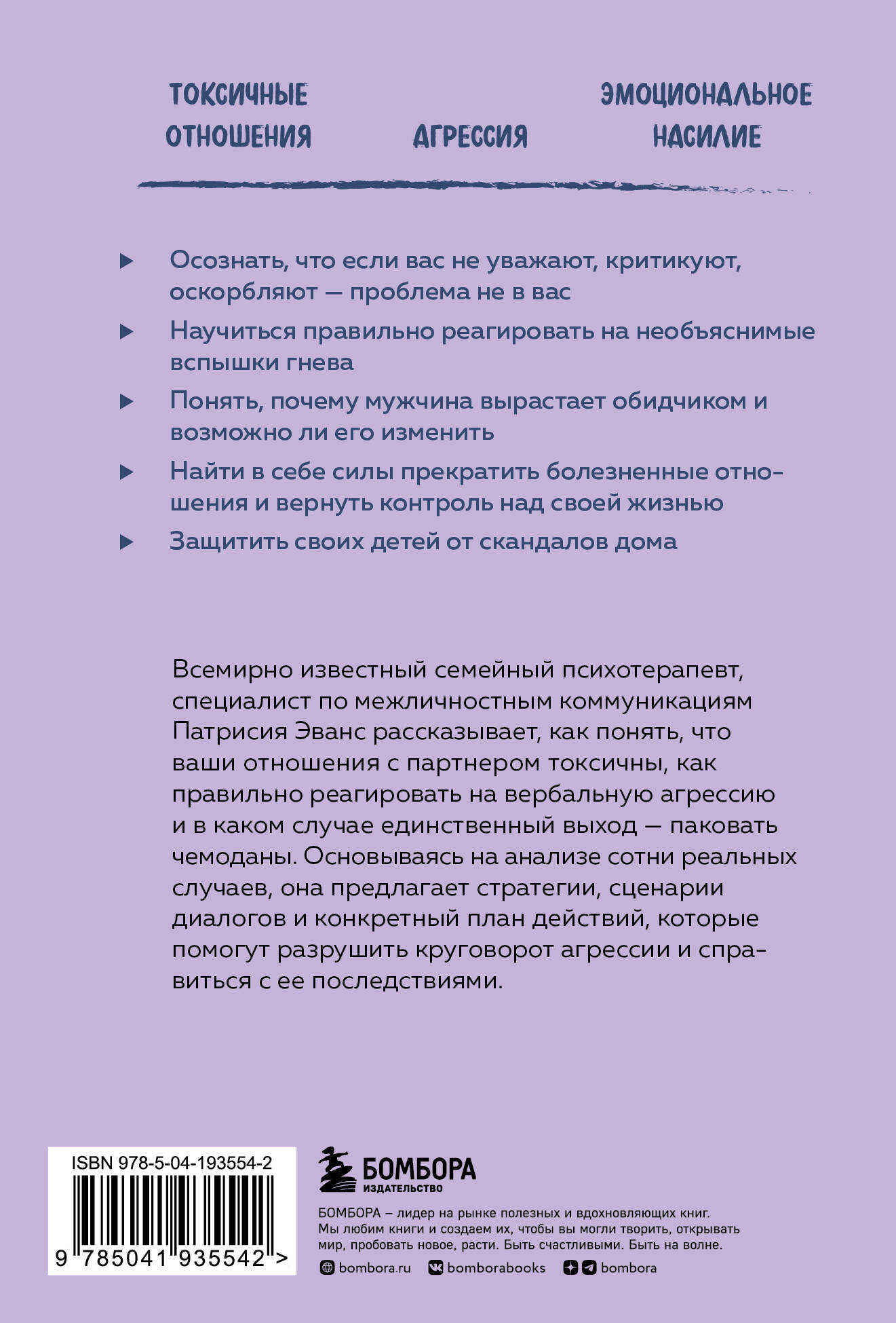 «Многие годами живут в обстановке вербального насилия, но не подозревают, что что-то не так, потому что оскорбления и унижения давно стали частью их жизни». Бестселлер на протяжении 30 лет. 20 переизданий. Продано более 700 000 копий. 600 отзывов на Amazon. ЭТА КНИГА ПОМОЖЕТ ВАМ: 1. Осознать, что если вас не уважают, критикуют, оскорбляют - проблема не в вас, а в обидчике и ваших отношениях. 2. Научиться правильно реагировать на необъяснимые вспышки гнева. 3. Понять, почему мужчина вырастает обидчиком и возможно ли его изменить. 4. Найти в себе силы прекратить болезненные отношения и вернуть контроль над своей жизнью. 5. Защитить своих детей от скандалов дома. Об авторе Патрисия Эванс - всемирно признанный специалист по межличностным коммуникациям. Опираясь на исследования более чем 30 000 случаев вербально агрессивных отношений, она выступает с семинарами и учебными программами в Соединенных Штатах. ОТЗЫВЫ «Эта книга поможет понять, что вы не заслуживаете такого обращения». - Опра Уинфри «Вместо того, чтобы думать, как провести выходные, вы размышляете: "что со мной не так", "почему мне не удается объяснить, чего я хочу" и "может, я его чем-то обидела". Ваши мысли в смятении, а эмоции колеблются от обиды до чувства вины и обратно. Можно ли в такой ситуации вернуть себе самоуважение и уверенность? Как ни странно, ответ "да". Первый шаг - ясно осознать, что происходит. Мы часто не замечаем враждебности партнера, придумывая за него причины для такого поведения. Журналист, исследователь словесной агрессии, автор нескольких книг на эту тему Патрисия Эванс предлагает действенные способы противостоять нападкам и сохранять свои личные границы. А стоит ли продолжать отношения, вы решите сами». - Ольга Сульчинская, шеф-редактор PSYCHOLOGIES| Издательство | ООО "Издательство "Эксмо" |