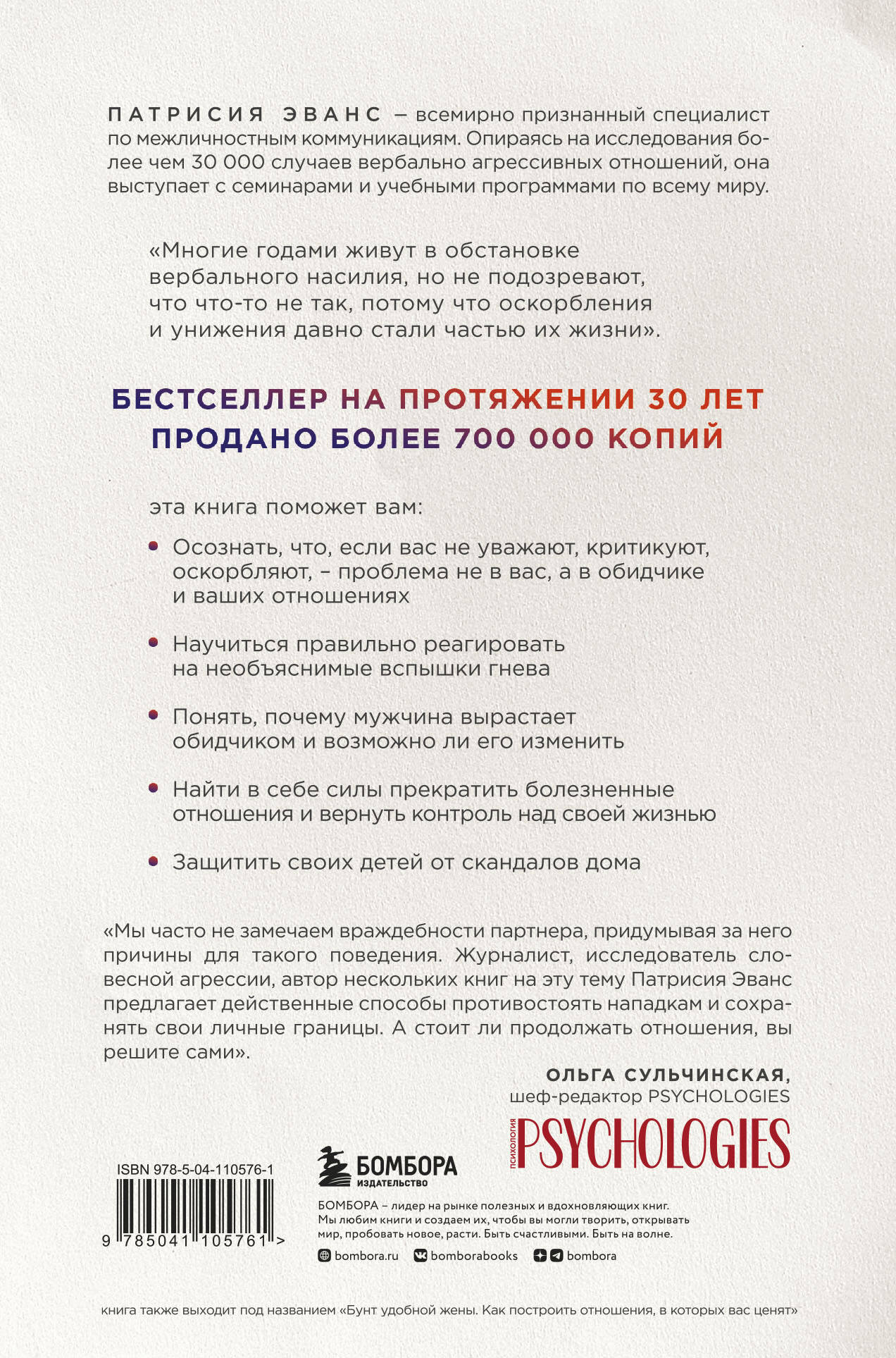 «Многие годами живут в обстановке вербального насилия, но не подозревают, что что-то не так, потому что оскорбления и унижения давно стали частью их жизни». Бестселлер на протяжении 30 лет. 20 переизданий. Продано более 700 000 копий. 600 отзывов на Amazon.com. ЭТА КНИГА ПОМОЖЕТ ВАМ: 1. Осознать, что если вас не уважают, критикуют, оскорбляют - проблема не в вас, а в обидчике и ваших отношениях. 2. Научиться правильно реагировать на необъяснимые вспышки гнева. 3. Понять, почему мужчина вырастает обидчиком и возможно ли его изменить. 4. Найти в себе силы прекратить болезненные отношения и вернуть контроль над своей жизнью. 5. Защитить своих детей от скандалов дома. Об авторе Патрисия Эванс - всемирно признанный специалист по межличностным коммуникациям. Опираясь на исследования более чем 30 000 случаев вербально агрессивных отношений, она выступает с семинарами и учебными программами по всей стране. Живет в Северной Калифорнии, с ней можно связаться через ее веб-сайт VerbalAbuse.com. ОТЗЫВЫ «Эта книга поможет понять, что вы не заслуживаете такого обращения». - Опра Уинфри «Вместо того, чтобы думать, как провести выходные, вы размышляете: "что со мной не так", "почему мне не удается объяснить, чего я хочу" и "может, я его чем-то обидела". Ваши мысли в смятении, а эмоции колеблются от обиды до чувства вины и обратно. Можно ли в такой ситуации вернуть себе самоуважение и уверенность? Как ни странно, ответ "да". Первый шаг - ясно осознать, что происходит. Мы часто не замечаем враждебности партнера, придумывая за него причины для такого поведения. Журналист, исследователь словесной агрессии, автор нескольких книг на эту тему Патрисия Эванс предлагает действенные способы противостоять нападкам и сохранять свои личные границы. А стоит ли продолжать отношения, вы решите сами». - Ольга Сульчинская, шеф-редактор PSYCHOLOGIES.| Издательство | ООО "Издательство "Эксмо" |