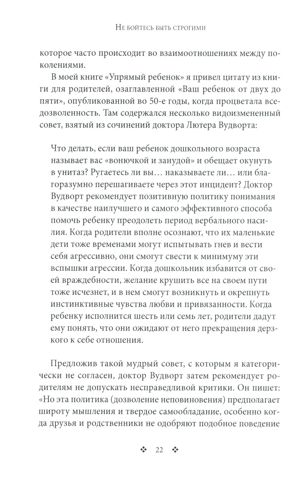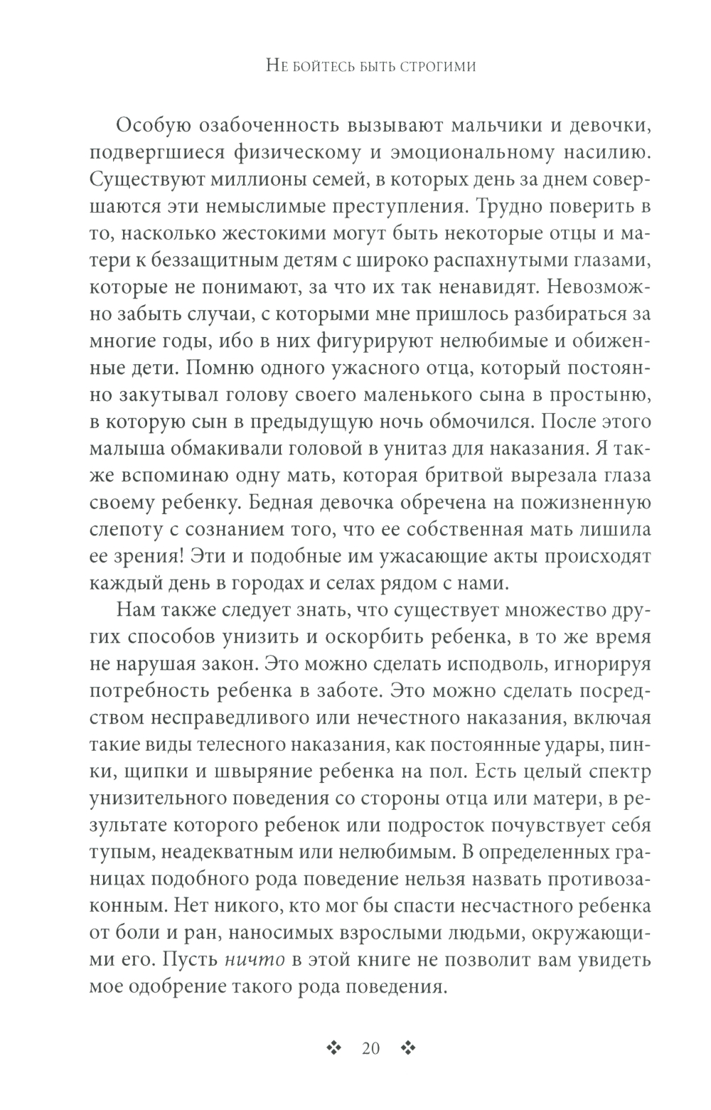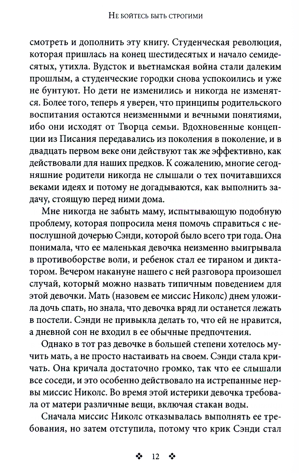 Многие сегодняшние родители выросли, не видя перед собой ролевой модели. У них нет четкого понимания того, что значит быть хорошей матерью или отцом. Одни пострадали от разного рода насилия в детстве, других либо не воспитывали, либо ни в чем не ограничивали. Как теперь им воспитывать своих сыновей и дочерей с пониманием и уверенностью? Разные «эксперты» часто давали неверные, противоречивые или неработающие советы. Куда можно обратиться современному поколению родителей за надежным и разумным руководством в деле воспитания детей? Доктор Джеймс Добсон в книге «Не бойтесь быть строгими» предоставил нам исключительно практичный и убедительный источник информации для современных отцов и матерей. Это пересмотренное и дополненное издание прежней, ставшей классической работы, которая более двух десятков лет назад помогла миллионам родителей выполнить это трудное дело. В этой новой книге доктор Добсон предлагает не только советы по воспитанию мальчиков и девочек. Он подготовил игровой план, целую философию по воспитанию подрастающего поколения. Эта философия поможет родителям понять своих детей и научиться справляться с постоянными задачами и проблемами по мере их возникновения. Подход доктора Добсона к воспитанию детей стоит на твердом основании традиционной иудео-христианской системы ценностей, возникшей две и более тысяч лет назад. Попросту говоря, здоровые и счастливые дети, как правило, вырастают в семьях, где родители нашли золотую середину между любовью и контролем. Но если баланс нарушается в одну или другую сторону, то в жизни детей, судьбы которых вверены в наши руки, возникают проблемы. Как говорит Добсон: «Когда ребенок спрашивает, кто отвечает за ту или иную ситуацию, ответьте ему. Когда он спрашивает, кто любит его, обнимите его и окружите любовью и вниманием. Проявляйте к нему уважение и ждите к себе такого же отношения. И тогда вы начнете радоваться сладким плодам компетентного исполнения родительского долга».| Издательство | ИД Христофор |