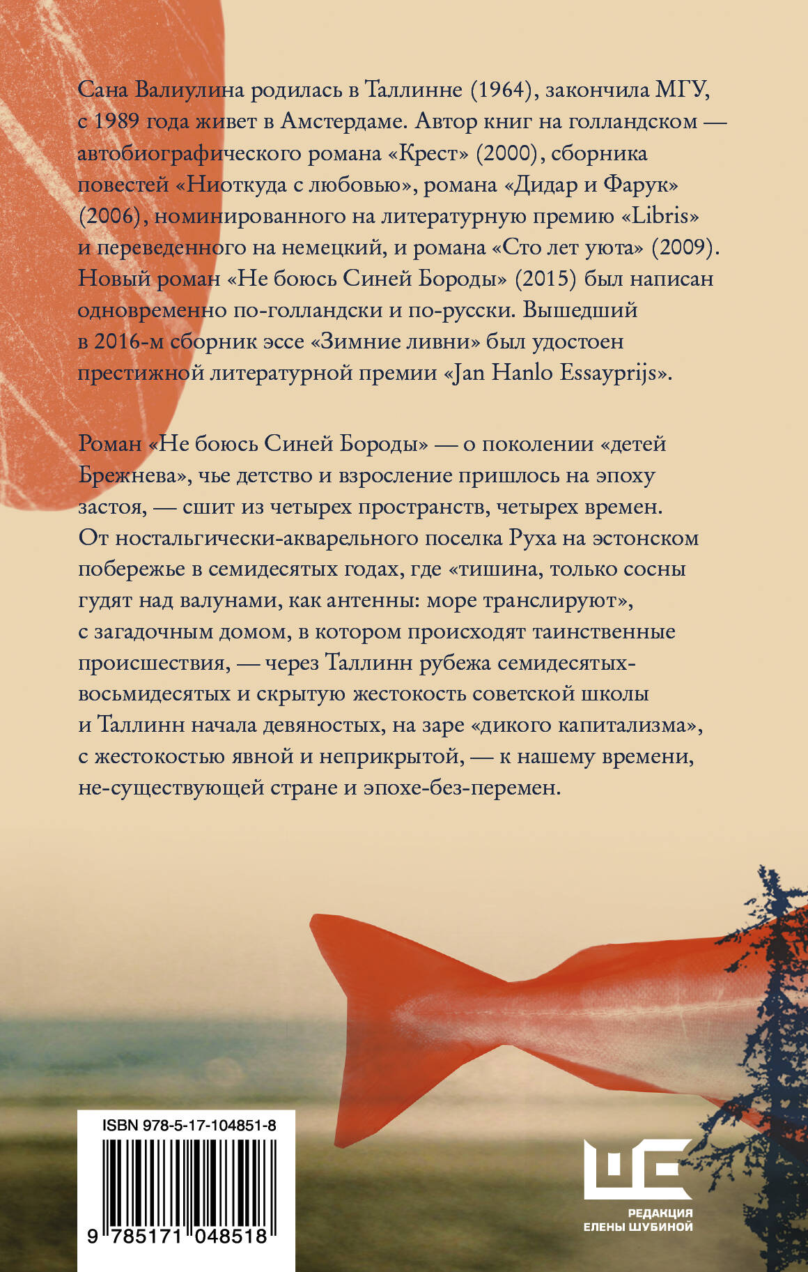 Сана Валиулина родилась в Таллинне (1964), закончила МГУ, с 1989 года живет в Амстердаме. Автор книг на голландском - автобиографического романа "Крест" (2000), сборника повестей "Ниоткуда с любовью", романа "Дидар и Фарук" (2006), номинированного на литературную премию "Libris" и переведенного на немецкий, и романа "Сто лет уюта" (2009). Новый роман "Не боюсь Синей Бороды" (2015) был написан одновременно по-голландски и по-русски. Вышедший в 2016-м сборник эссе "Зимние ливни" был удостоен престижной литературной премии "Jan Hanlo Essayprijs". Роман "Не боюсь Синей Бороды" - о поколении "детей Брежнева", чье детство и взросление пришлось на эпоху застоя, - сшит из четырех пространств, четырех времен. От ностальгически-акварельного поселка Руха на эстонском побережье в семидесятых годах, где "тишина, только сосны гудят над валунами, как антенны: море транслируют", с загадочным домом, в котором происходят таинственные происшествия, - через Таллинн рубежа семидесятых-восьмидесятых и скрытую жестокость советской школы и Таллинн начала девяностых, на заре "дикого капитализма", с жестокостью явной и неприкрытой, - к нашему времени, не-существующей стране и эпохе-без-перемен.| Издательство | ИЗДАТЕЛЬСТВО "АСТ" |