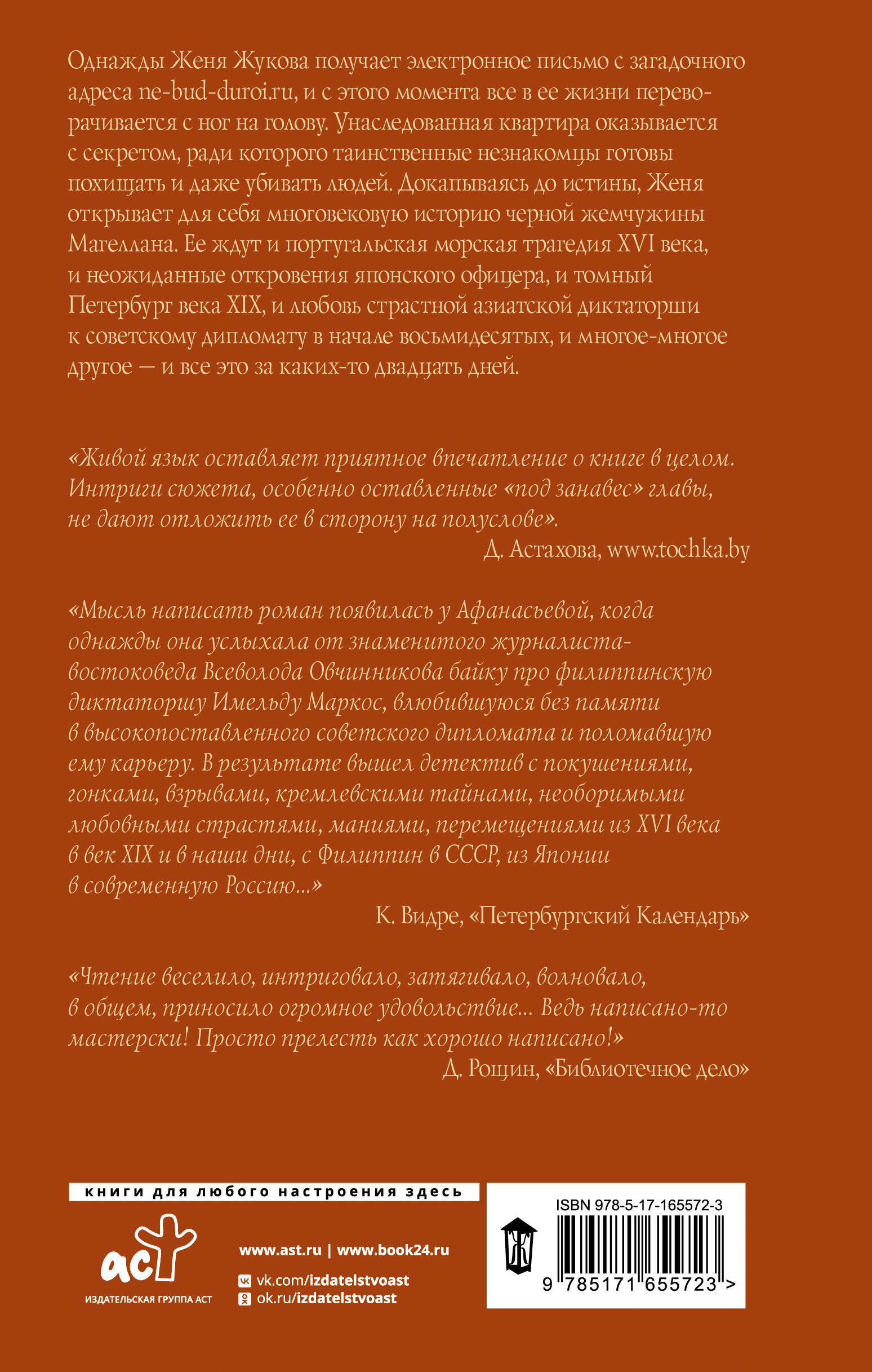 Однажды Женя Жукова получает электронное письмо с загадочного адреса ne-bud-duroi.ru, и с этого момента все в ее жизни переворачивается с ног на голову. Унаследованная квартира оказывается с секретом, ради которого таинственные незнакомцы готовы похищать и даже убивать людей. Докапываясь до истины, Женя открывает для себя многовековую историю черной жемчужины Магеллана. Ее ждут и португальская морская трагедия XVI века, и неожиданные откровения японского офицера, и томный Петербург века XIX, и любовь страстной азиатской диктаторши к советскому дипломату в начале восьмидесятых, и многое-многое другое - и все это за каких-то двадцать дней.| Издательство | Издательство "АСТ" |