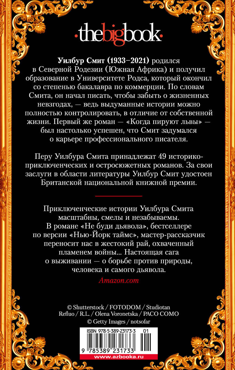 Уилбур Смит (1933-2021) родился в Северной Родезии (Южная Африка) и получил образование в Университете Родса, который окончил со степенью бакалавра по коммерции. По словам Смита, он начал писать, чтобы забыть о жизненных невзгодах, - ведь выдуманные истории можно полностью контролировать, в отличие от собственной жизни. Первый же роман - "Когда пируют львы" - был настолько успешен, что Смит задумался о карьере профессионального писателя. Его перу принадлежат 49 историко-приключенческих и остросюжетных романов. За свои заслуги в области литературы Уилбур Смит удостоен Британской национальной книжной премии. Однажды судьба свела этих двоих в Занзибаре, и с этого момента старый пройдоха Флинн и простодушный Себастьян стали браконьерствовать на территории германских колоний Африки. Считая себя неуязвимыми, они совершают ограбление резиденции кайзеровского наместника. Кто мог подумать, что после этого для них разверзнутся врата ада и ничто в их жизни уже не будет прежним?..| Издательство | Азбука-Аттикус Издат.группа ООО |