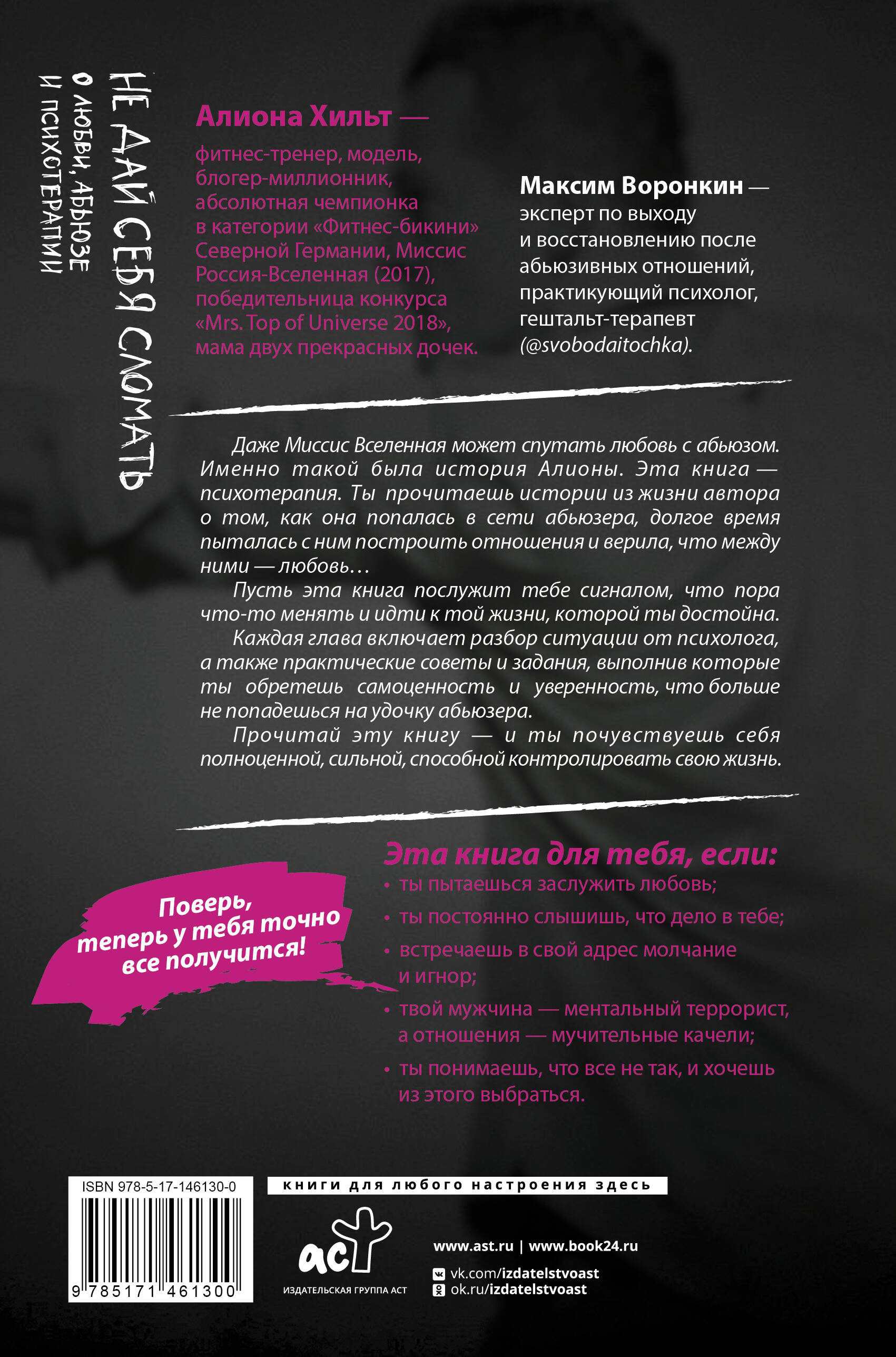 Алиона Хильт - фитнес-тренер, модель, блогер-миллионник, абсолютная чемпионка в категории "Фитнес-бикини" Северной Германии, Миссис Россия-Вселенная (2017), победительница конкурса "Mrs. Top of Universe 2018", мама двух прекрасных дочек. Даже Миссис Вселенная может спутать любовь с абьюзом. Именно такой была история Алионы. Эта книга - психотерапия. Ты прочитаешь истории из жизни автора о том, как она попалась в сети абьюзера, долгое время пыталась с ним построить отношения и верила, что между ними - любовь… Пусть книга "Не дай себя сломать: о любви, абьюзе и психотерапии" послужит тебе сигналом, что пора что-то менять и идти к той жизни, которой ты достойна. Каждая глава включает разбор ситуации от психолога Максима Воронкина, а также советы и задания, выполнив которые ты обретешь самоценность и уверенность, что больше не попадешься на удочку абьюзера. Прочитай эту книгу - и ты почувствуешь себя полноценной, сильной, способной контролировать свою жизнь. Книга "Не дай себя сломать: о любви, абьюзе и психотерапии" для тебя, если: • ты пытаешься заслужить любовь; • ты постоянно слышишь, что дело в тебе; • встречаешь в свой адрес молчание и игнор; • твой мужчина - ментальный террорист, а отношения - мучительные качели; • ты понимаешь, что все не так, и хочешь из этого выбраться.| Издательство | ИЗДАТЕЛЬСТВО "АСТ" |