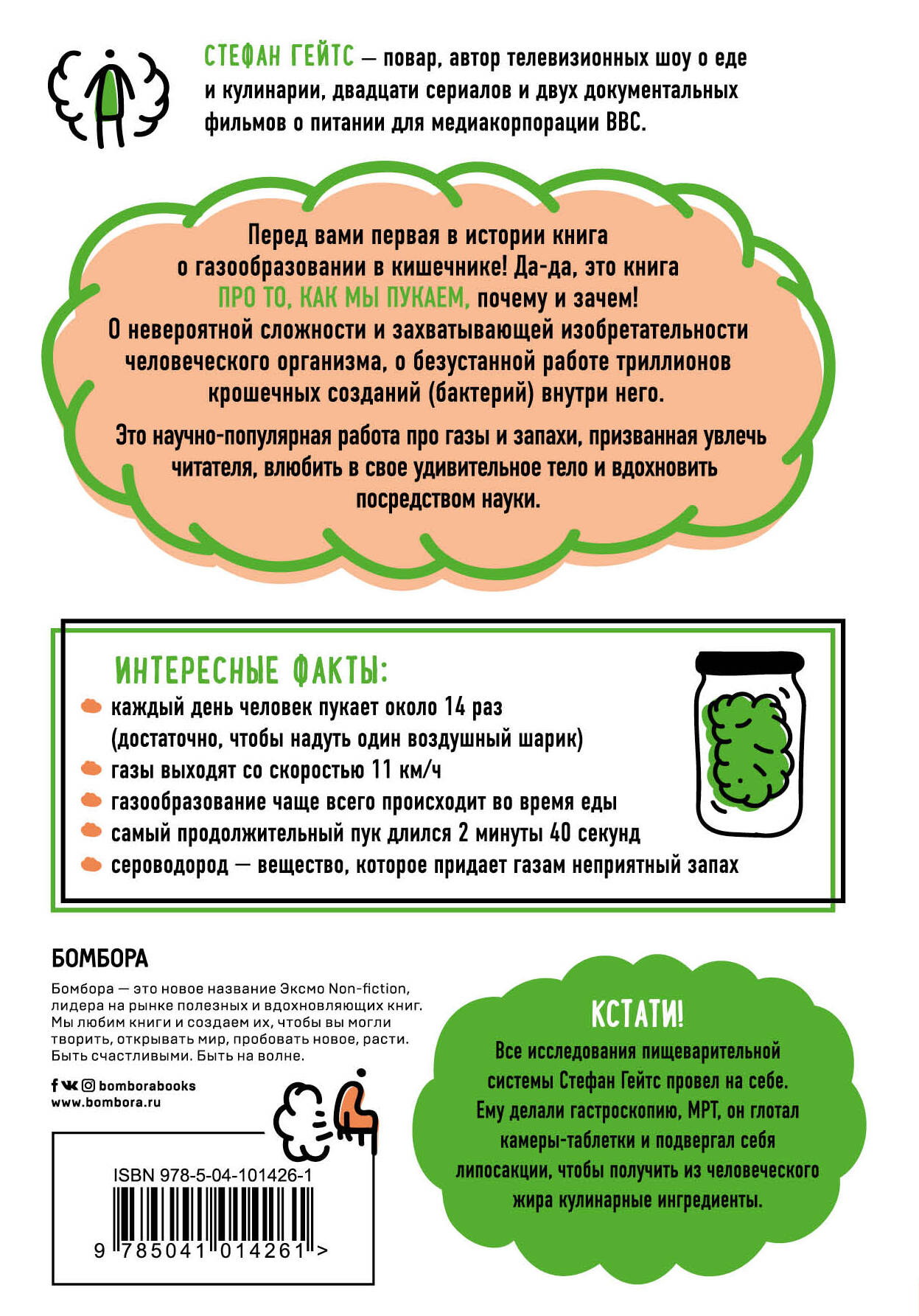 Об авторе: Стефан Гейтс - британский телеведущий, автор телевизионных шоу о еде, кулинарии и науке. Он представил более 20 сериалов о питании, в основном для BBC, снял два документальных фильма, а также выступает на фестивалях науки и еды. О чем книга: В данной книге автор, Стефан Гейтс, подробно рассказывает, как устроен пищеварительный процесс, и занимательно описывает все этапы пищеварения: пережевывание - механическое расщепление пищи; ферментативное расщепление слюной; проглатывание пищи через пищевод; а также прохождение пищи через желудок, тонкий и толстый кишечник, прямую кишку и анус. Гейтс описывает разные типы исследований желудочно-кишечного тракта, демонстрируя их плюсы и минусы: гастроскопия, гастроскопия с камерой-таблеткой и трансназальная гастроскопия. Автор детально рассматривает состав испускаемого человеком газа, рассказывает о процессе ферментации или метаболизма. Стефан Гейтс перечисляет еду, которая усиливает газообразование: топинамбур, бобы, репчатый лук, чеснок и лук-порей, овощи семейства крестоцветных, цельные злаки, фрукты и т. д., а также приводит забавные рецепты блюд, способствующих революции в кишечнике. Автор настаивает, что испускание газов - совершенно естественное явление, нормальная функция пищеварительной системы, и считает, что в процессе люди должны лишь гордиться, что съели много полезной для здоровья клетчатки. Особенности книги: Все исследования пищеварительной системы Стефан Гейтс провел на себе. Ему делали гастроскопию, МРТ, он глотал камеры-таблетки и подвергал себя липосакции, чтобы получить из человеческого жира кулинарные ингредиенты. Отзыв специалиста: «Книга очень позитивная, задорная, местами на грани фола, но при этом с неплохим объемом грамотной информации о физиологии человека! И незаметно, будто читая между делом колонку с анекдотами, между улыбкой, смешками и откровенным хохотом, моментами неловкости и смущения, читатель узнает все тонкости удивительного процесса "газообразования" в человеческом организме!» - Певцова Анастасия, врач акушер-гинеколог, перинатальный психолог| Издательство | ООО "Издательство "Эксмо" |