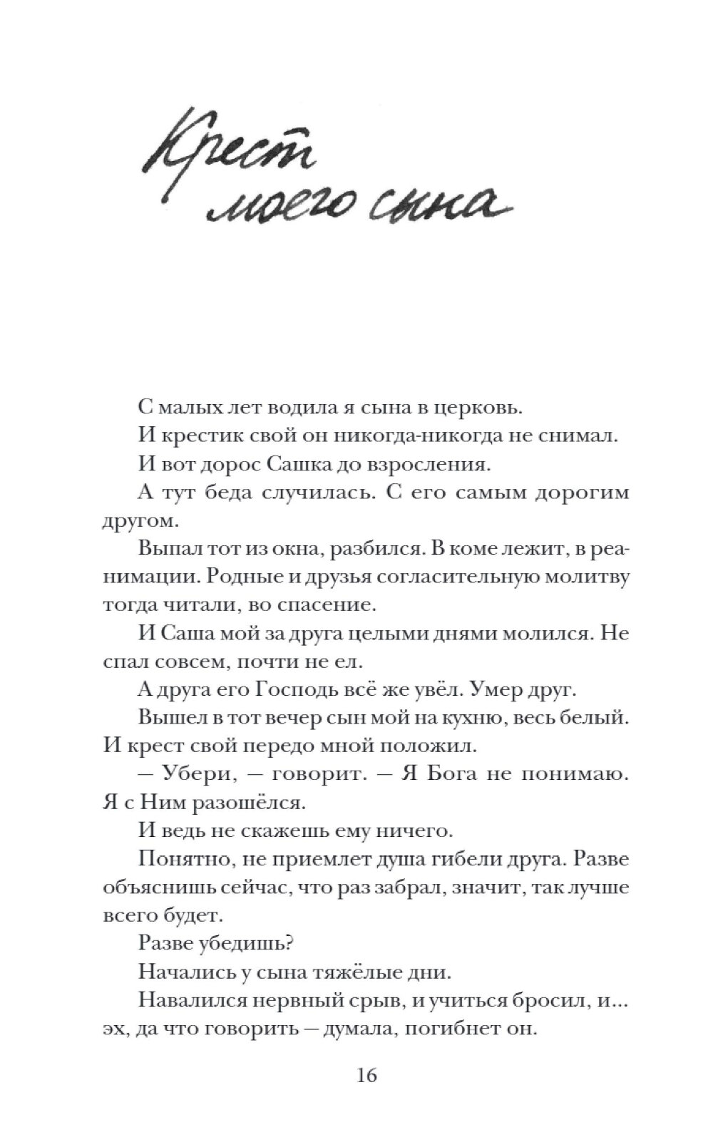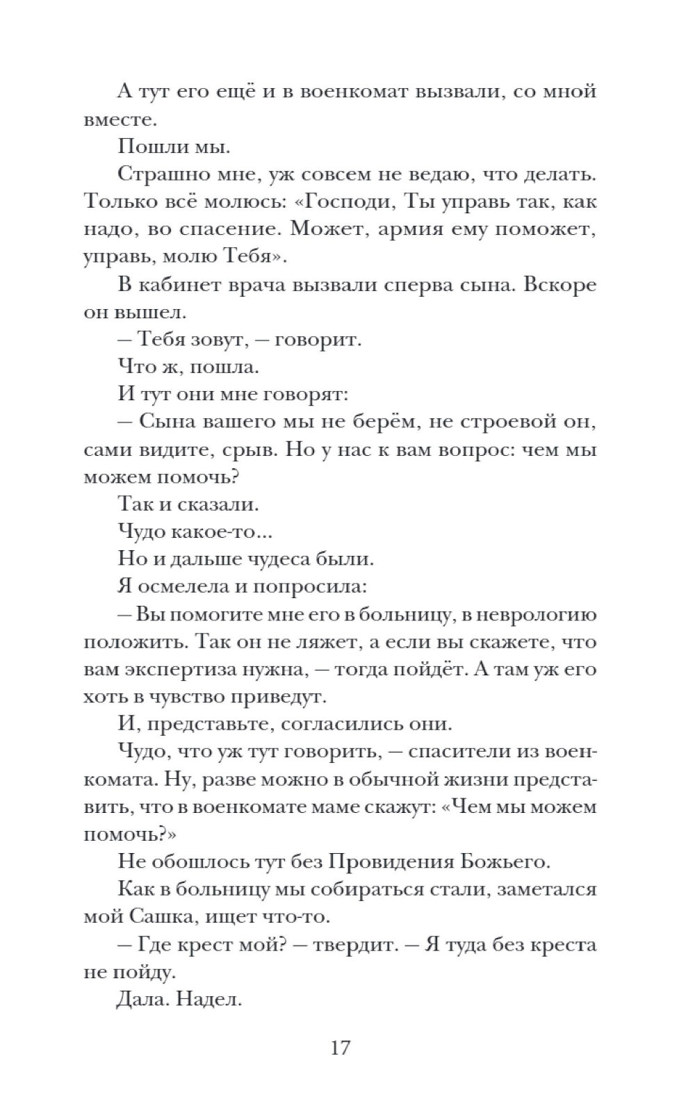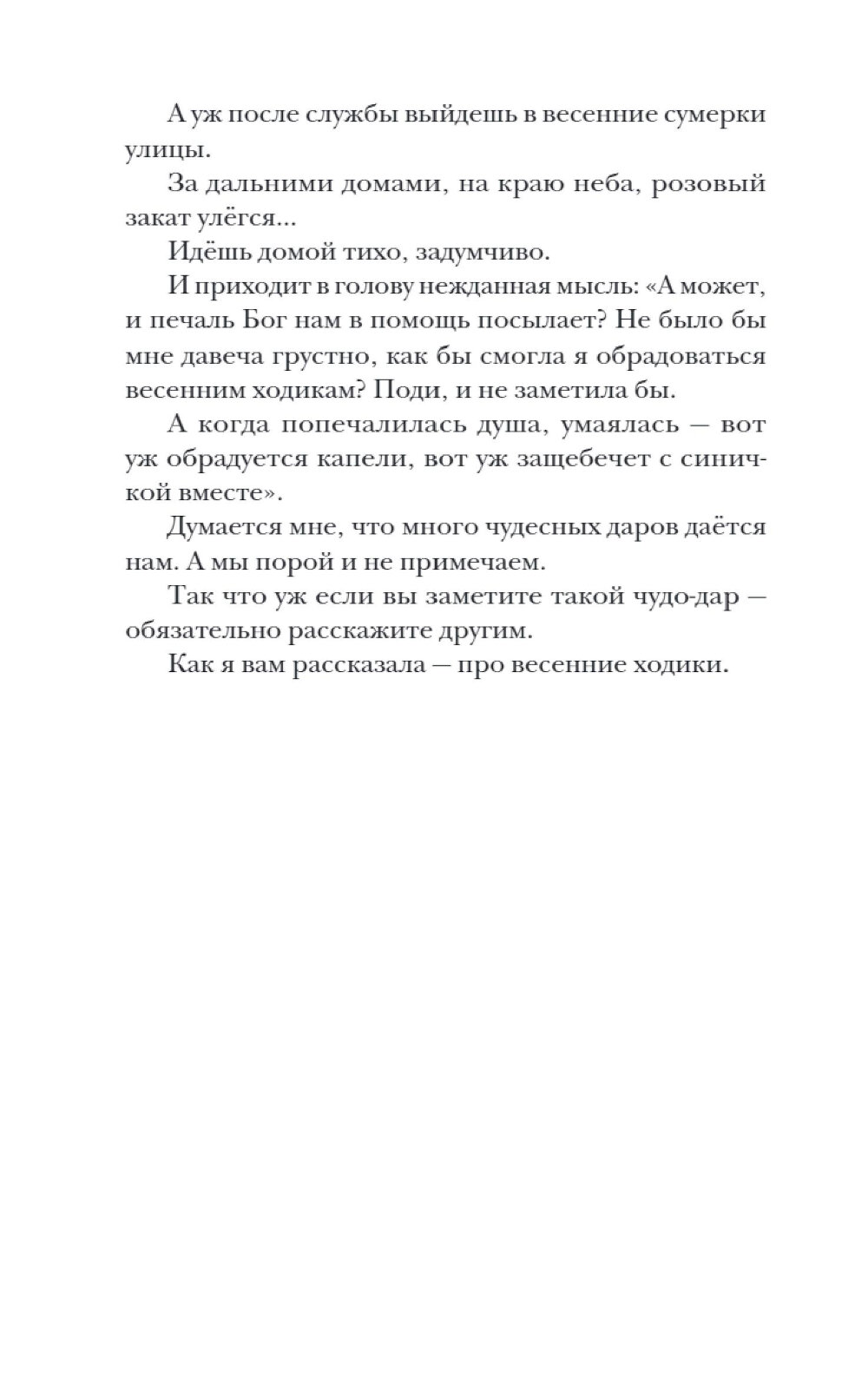 Сборник художественно-публицистических эссе, прозвучавших на радио «Вера». Автор размышляет о том, что, даже веря в Бога, мы забываем о доверии Ему, пишет о своем опыте, о радости доверия. И именно доверию посвящены многие жизненные истории этой книги. Тут затронуты вопросы, важные для каждого человека: что такое совесть, отношения с ближними, любовь к Родине и семье. Главный тезис книги: не пытайтесь управлять событиями, над которыми не властны, - не держите небо, просто доверьтесь Богу. И, рассказывая читателю реальные случаи из жизни, автор не поучает, а честно говорит, что сам учится доверию. Тон книги покоряет с первых строк, вызывает интерес, жажду чтения дальше и дальше и сожаление, когда такая задушевная беседа оканчивается.| Издательство | Изд. НИКЕЯ |