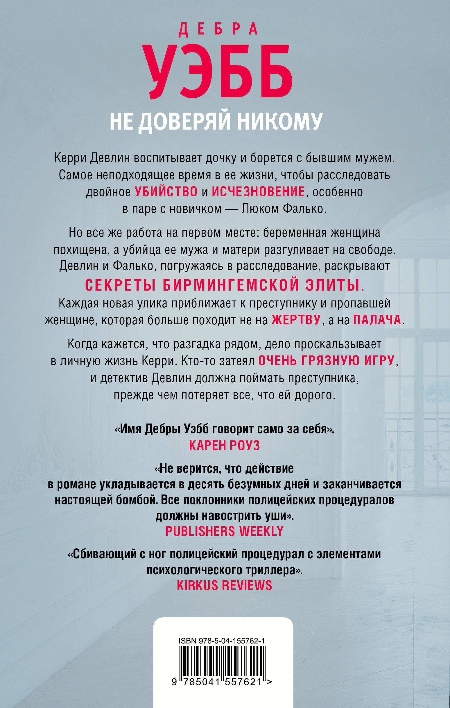 Что получилось бы, если бы «Исчезнувшая» встретилась с «Зовом кукушки»? Великолепный роман в духе классических полицейских процедуралов. Фанаты Роберта Гэлбрейта и Гиллиан Флинн однозначно обрадуются появлению этой книги. Здесь есть всё, что необходимо для отличного детектива: динамичное расследование, обаятельный дуэт полицейских и знакомая атмосфера маленького городка, где все, казалось бы, знают друг о друге всё... Кроме самых страшных тайн. Керри Девлин воспитывает дочку и борется с бывшим мужем. Самое неподходящее время в ее жизни, чтобы расследовать двойное убийство и исчезновение, да еще и с новым напарником Фалько, который имеет не лучшую репутацию. Преступление затрагивает самые высшие слои общества: убит местный богач и его свекровь, а жена похищена. Девлин и Фалько начинают расследование и понимают, что за фасадом роскоши и достатка скрывается гниль, предательства и зависть. Похищенная жена становится все больше похожа не на жертву, а на преступницу. Дело вмешивается в личную жизнь Керри Девлин, теперь ей необходимо действовать в собственных интересах, чтобы раскрыть преступление и обезопасить свою семью.| Издательство | ООО "Издательство "Эксмо" |