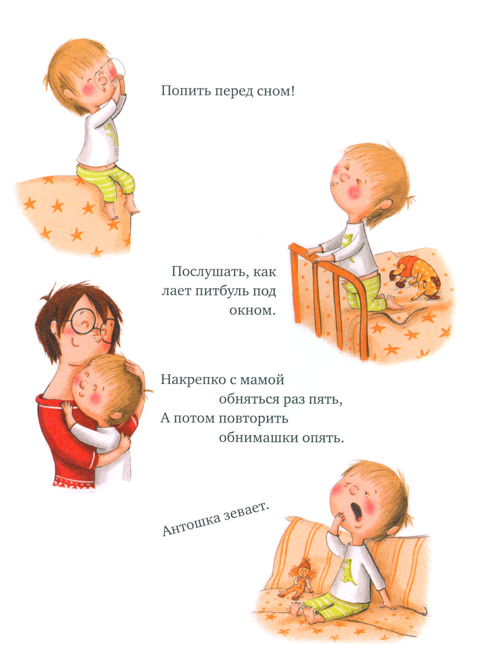 Сколько же дел перед сном у малыша Антошки: попить воды, поиграть в машинки, послушать собачий лай... Спать совершенно некогда! А чем занята в это время мама? Сейчас Антошка выяснит! Добрая и невероятно смешная история о том, что веселые занятия можно найти для себя где угодно!| Издательство | Клевер-Медиа-Групп |