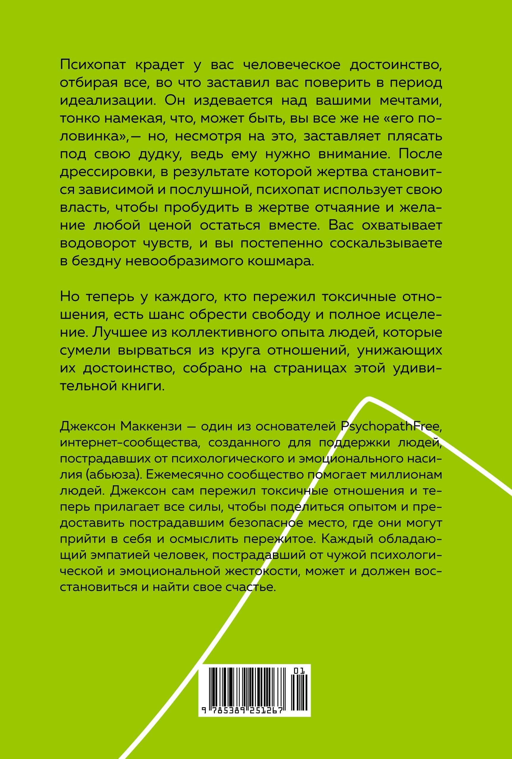 "Что же такое психопат? А нарцисс? Социопат? Они - манипуляторы, напрочь лишенные способности сочувствовать. Они намеренно причиняют боль другим людям и при этом не ощущают никакой вины и не считают себя ответственными. Между тремя этими типами есть некоторая разница, но главное - то, что их отношения с другими людьми развиваются по абсолютно предсказуемому циклу: "идеализировать - обесценить - выкинуть на помойку". Я не могу помочь вам исправить токсичные отношения, поскольку токсичные люди не меняются. Но вы получите стартовую площадку, где сможете начать все сначала. И могу обещать, что вы снова сможете радоваться. Вы научитесь доверять своей интуиции. Вы обретете мудрость пережившего катастрофу и способность мечтателя кротко изумляться жизни". Международный бестселлер Джексона Маккензи - это первое руководство для тех, кто желает бесповоротно выйти из токсичных отношений, созданное пережившей опыт абьюза жертвой. Книга рассказывает, как преодолеть основные психологические проблемы, восстановиться после горького опыта общения с психопатами и другими разновидностями манипуляторов и построить свою жизнь заново.| Издательство | Азбука-Аттикус Издат.группа ООО |