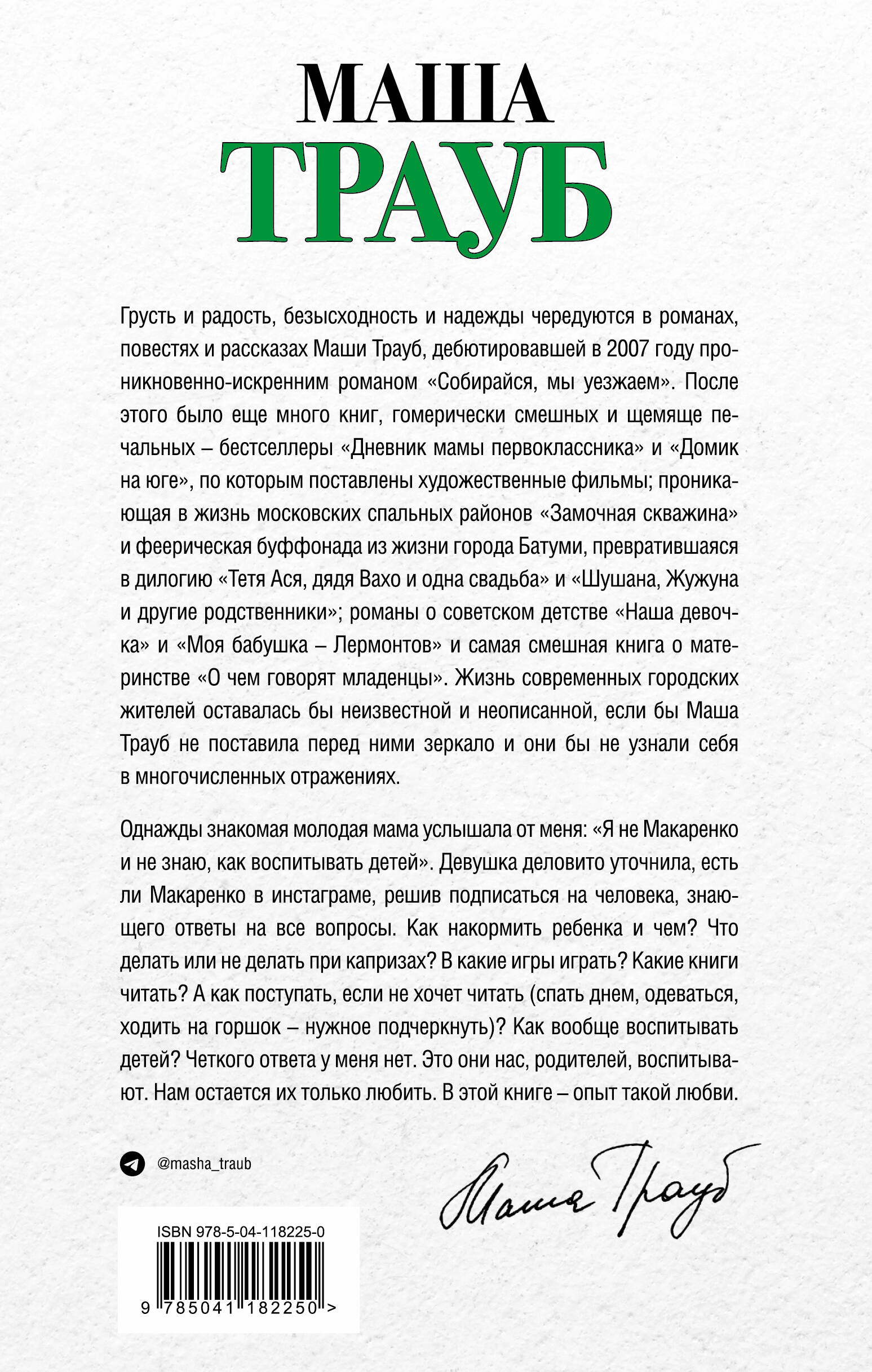 От Спока до Макаренко. Этот путь прошли все родители старшего поколения. Нынешние искренне считают, что на Макаренко можно подписаться в Инстаграме. Маша Трауб решила помочь тем, кто сомневается в своих родительских способностях, и собрала весь свой солидный родительский опыт в этой книге. А поскольку она не только мать двоих детей, но и колумнист, писатель и журналист, то получилось весело и живо. Эта книга - инструкция по пользованию детьми от 0 и до старшего школьного возраста. Все как в жизни - сначала чем кормить и лечить, потом - как учить, терпеть, не раздражаться. Не удивляться. И - любить.| Издательство | ООО "Издательство "Эксмо" |