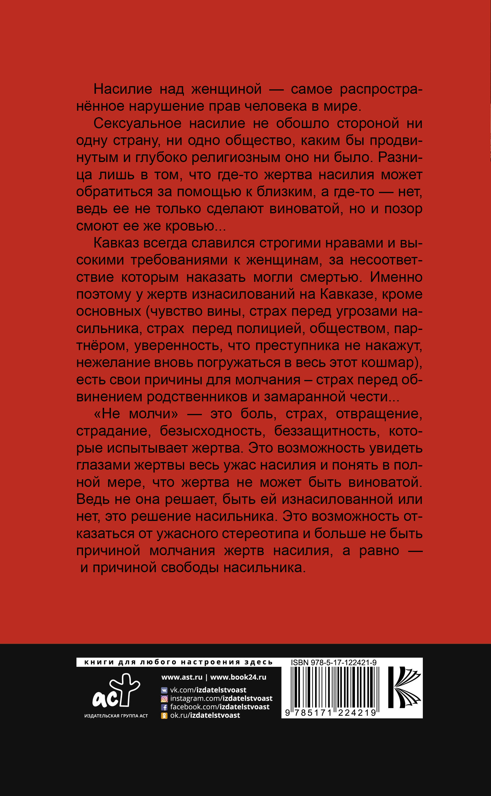 Марьям Алиева - популярный блогер, открыто говорящий о проблеме сексуального насилия по всему миру и активно помогающий его жертвам. Ежемесячно Марьям Алиеву ищут 328 тыс. человек на Яндексе. Здесь нет придуманных историй. Только факты. Иногда страшные и шокирующие. Истории, которые написала сама жизнь, и прокомментировал психолог. Эта книга ДЛЯ ТЕХ, кто хочет узнать: * Как правильно дать отпор насильнику; * Как перестать быть жертвой; * Куда обращаться, если ты или твои близкие подверглись насилию.| Издательство | ИЗДАТЕЛЬСТВО "АСТ" |