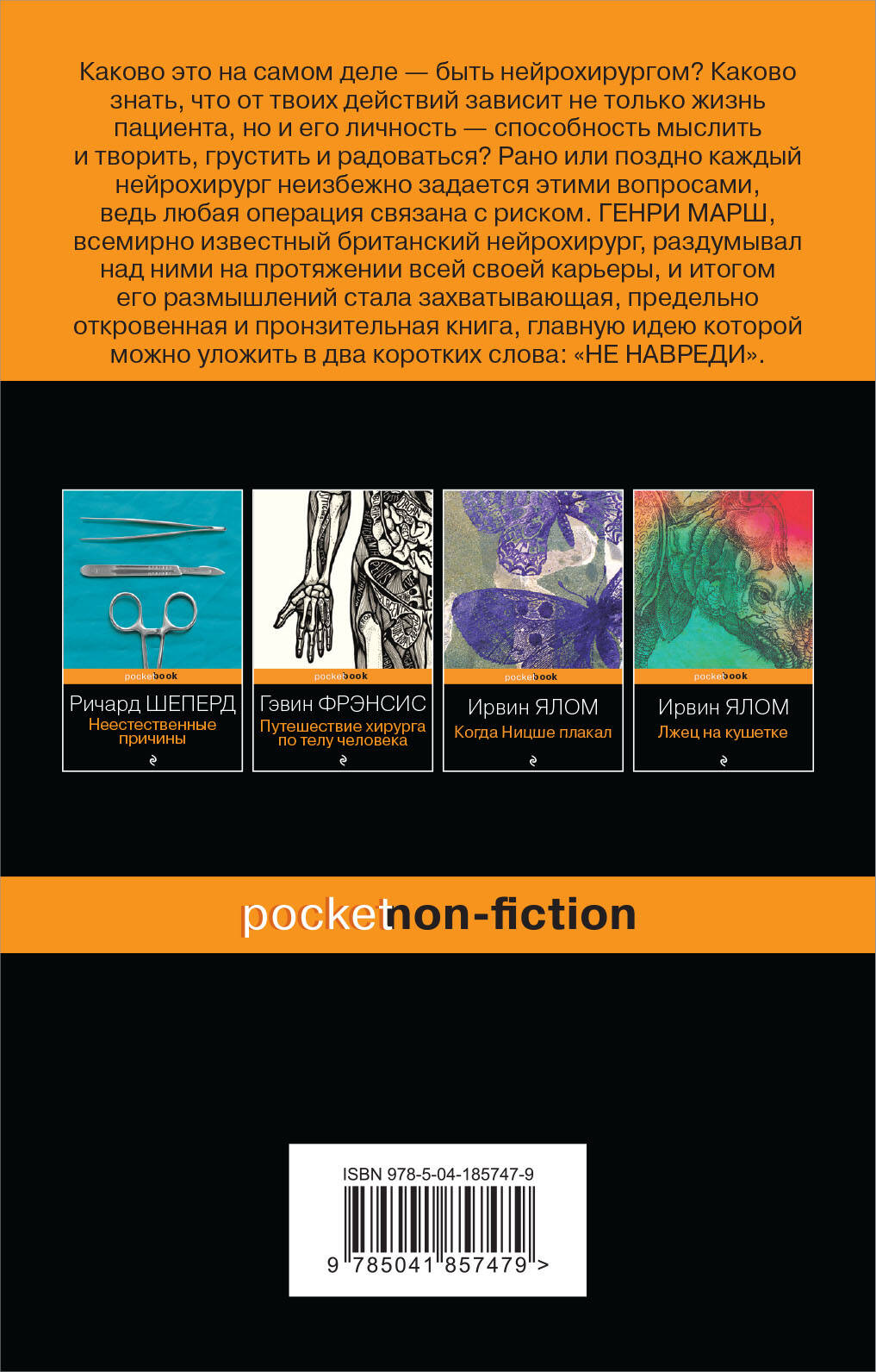 Об авторе: Генри Марш - всемирно известный британский ПРАКТИКУЮЩИЙ нейрохирург, оперирует пациентов с наиболее тяжелыми случаями. Профессор, научный руководитель и основатель Международного центра нейрохирургии на Украине (Киев), совместно с Игорем Курельцом. Особенности книги: - Переведена на 17 языков! - Вошла в список бестселлеров New York Times, становилась лауреатом или попадала в шортлист нескольких премий! - В 2007 году вышел документальный фильм «Английский хирург», в котором мы можем наблюдать за работой Генри Марша во время проведения настоящей операции. О чем эта книга: Книга - о буднях нейрохирурга, его работе, его выборе, за кого из пациентов бороться, а кого отпустить. Конечно, не хотелось бы попасть к нему на прием, но иногда это случается. И хочется, чтобы врач делал свою работу хорошо. Но все мы забываем, что нейрохирурги тоже люди, со своими заботами, обидами, недосыпом... головной болью, наконец. Каково это - быть ответственным за жизнь и здоровье человека? Где черпают силы люди, от которых зависит так много? Продолжающаяся серия «Медицина без границ». Книги о тех, кто спасает жизни, - книги о работе медперсонала.| Издательство | ООО "Издательство "Эксмо" |