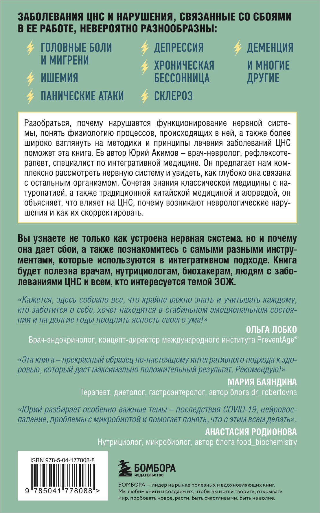 Нервная система настолько сложна, что для понимания ее устройства и функций требуются знания из самых разных областей классической медицины - анатомии, биохимии, иммунологии и др. Также и заболевания ЦНС невероятно разнообразны - от головных болей и панических атак до рассеянного склероза и инсульта. Разобраться, почему нарушается функционирование нервной системы, понять физиологию процессов, происходящих в ней, а также более широко взглянуть на методики и принципы лечения заболеваний ЦНС поможет эта книга. В ней врач-невролог, рефлексотерапевт, специалист по интегративной медицине Юрий Акимов предлагает расширить свои представления о способах профилактики и терапии неврологических нарушений, дает множество советов и на наглядных примерах показывает, как хороший сон, контроль уровня стресса, сбалансированное питание и другие довольно простые изменения в образе жизни помогают добиться прогресса в лечении сложных заболеваний. Вы узнаете: · Как устроена нервная система и какими особенностями она обладает. · Как влияют на ЦНС состояние кишечника, микробиота и патогены. · Как работают нейромедиаторы и для чего они нужны. · Что такое нейропластичность. · В чем преимущества фитотерапии, йоготерапии и практик традиционной восточной медицины при лечении заболеваний ЦНС. · Почему коррекция питания и режима сна, контроль стресса, прием витаминов и физическая активность - это важные инструменты в восстановлении ЦНС. Книга доктора Акимова раскроет секреты сбалансированного подхода к поддержанию стабильности нервной системы, а также подскажет, как гармонично интегрировать в лечение восточные медицинские практики для достижения наилучшего результата и оздоровления всего организма в целом. Подойдет как тем, кто ищет универсальное средство для комплексного решения проблем с работой различных систем организма, так и специалистам, формирующим более широкий взгляд на возможности и пути лечения своих пациентов.| Издательство | ООО "Издательство "Эксмо" |