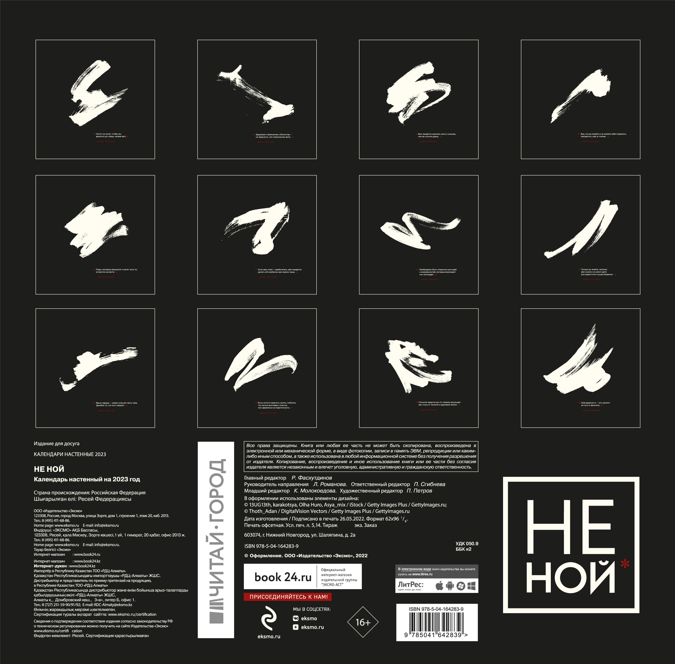 О серии: Наши настенные календари отличаются высоким качеством исполнения! Тщательно подобранные иллюстрации, напечатанные на глянцевой бумаге высочайшего качества, станут настоящим украшением дома, а в календарной сетке найдется место для ваших планов: большие клетки позволят делать записи и организовать свой год! В календаре также отмечены все государственные праздники. В серии настенных календарей издательства «ЭКСМО» каждый найдет тему по вкусу: великие художники, великолепные подборки с самыми знаменитыми произведениями искусства, легендарные кинематографические саги и игры, главные книжные авторы и бестселлеры, фотографии и иллюстрации любимых животных и многое-многое другое! О календаре: Минималистичный стильный календарь с мотивирующими цитатами из бестселлера Джен Синсеро «НЕ НОЙ». Для кого: Высокое качество полиграфического исполнения прекрасно дополняют цитаты из бестселлера Джен Синсеро «НЕ НОЙ», которые будут мотивировать каждый день. Технические параметры: - Тип календаря - настенный перекидной. - Год - 2023. - Календарная сетка - с разбивкой по месяцам. - Вид скрепления - скрепка. - Ширина - 30 см. - Высота - 30 см. - Внутренний блок - мелованная бумага 150 г/м2. - Подложка - плотный гофрокартон для поддержания формы. - Индивидуальная упаковка в плотный целлофановый пакет.| Издательство | Эксмо |