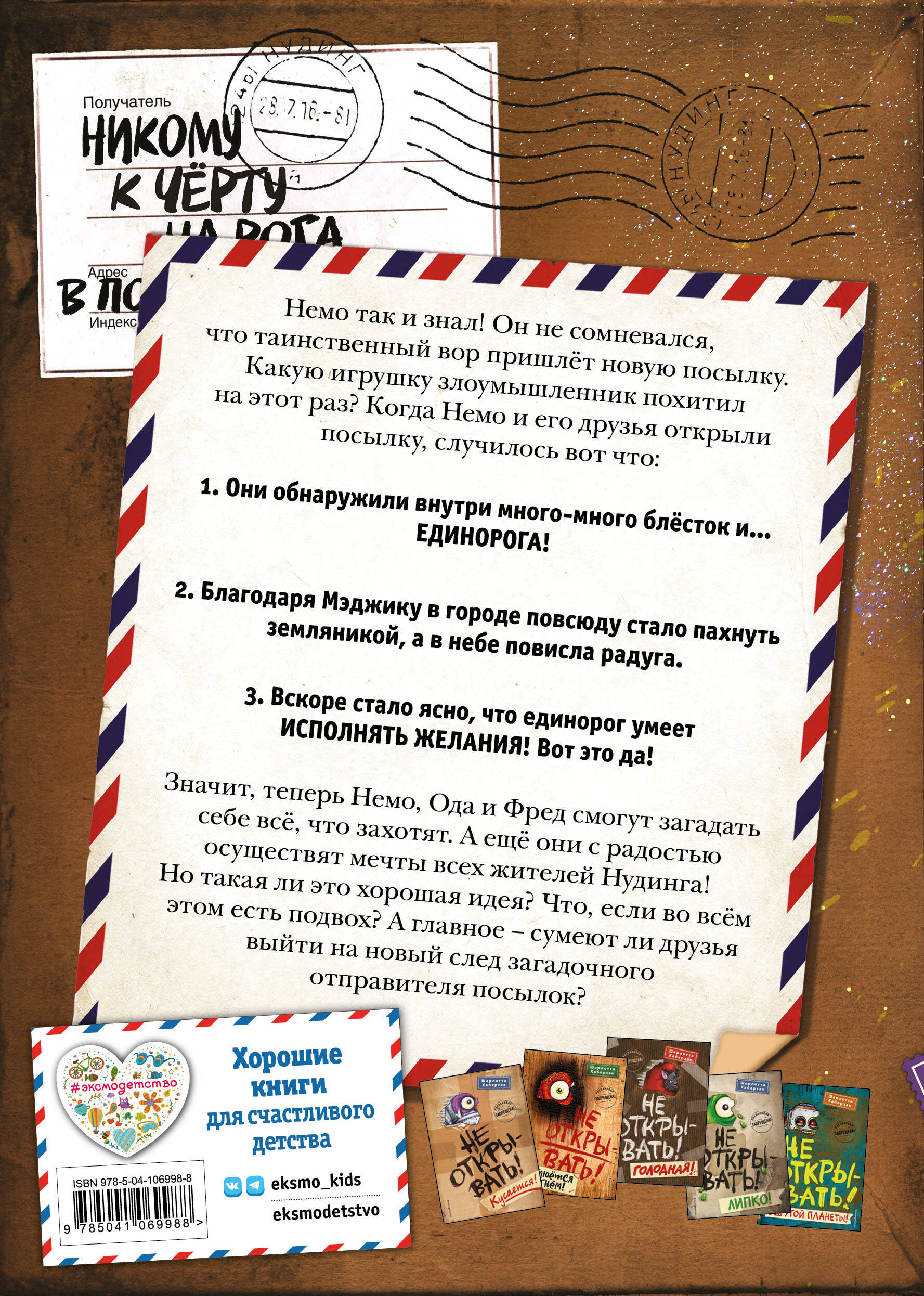 Новая посылка уже здесь! Немо, Ода и Фред так и знали, что таинственный вор объявится снова! На этот раз он прислал посылку, усыпанную блёстками. Когда друзья открыли её, они обнаружили внутри живого ЕДИНОРОГА! У Мэджика разноцветная чёлка, из-за него в городе повсюду стало пахнуть земляникой, а ещё он легко исполняет желания! Ребята не могут поверить своему счастью: неужели им наконец повезло и ожившая игрушка не доставит никаких неприятностей?! Теперь они смогут пожелать себе что угодно! Но что, если во всём этом есть подвох? Может быть, Мэджик не так прост, как кажется? И получится ли у Немо и его друзей выйти на след отправителя посылок? Это книга-сюрприз! Ведь под обложкой, в которой есть «дырка», прячется кое-кто волшебный. А внутри вас ждёт много классных иллюстраций! Бестселлер престижного немецкого журнала Spiegel. «Здесь есть всё, что нужно хорошей детской книге: дружба, веселье, приключения и даже первая влюбленность». - Журнал о книгах Buchmedia Magazin| Издательство | ООО "Издательство "Эксмо" |