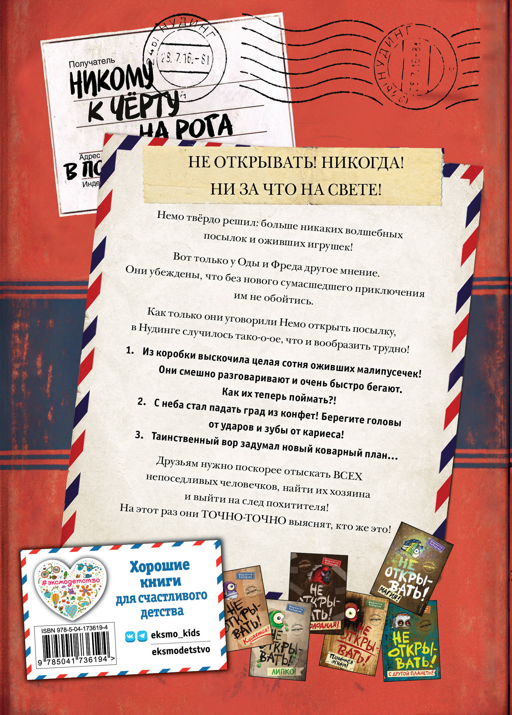 Новая книга-посылка доставлена! Абсолютный бестселлер в России, который помог уже сотням тысяч детей полюбить читать! Здесь есть всё, что нужно хорошей детской книге: юмор, тайны, дружба и приключения. Чёрно-белые иллюстрации и сразу несколько дырок в обложке, из которых выглядывают самые смешные существа на свете! А ещё из новой книги читатель наконец узнает, кто же этот таинственный вор, посылающий волшебные посылки! Похититель разоблачён! Немо твёрдо решил: он ни за что не откроет новую посылку! Однако Ода и Фред оказались слишком любопытными. Это из-за них Немо всё же пришлось открыть крышку коробки, и из неё выпрыгнули ужасно смешные и шустрые малипусечки! А в Нудинге пошёл град из конфет. ОЧЕНЬ БОЛЬШИХ КОНФЕТ! Как же теперь поймать сбежавших человечков и вернуть их хозяину? А отправитель посылок уже плетёт новый коварный план…| Издательство | ООО "Издательство "Эксмо" |