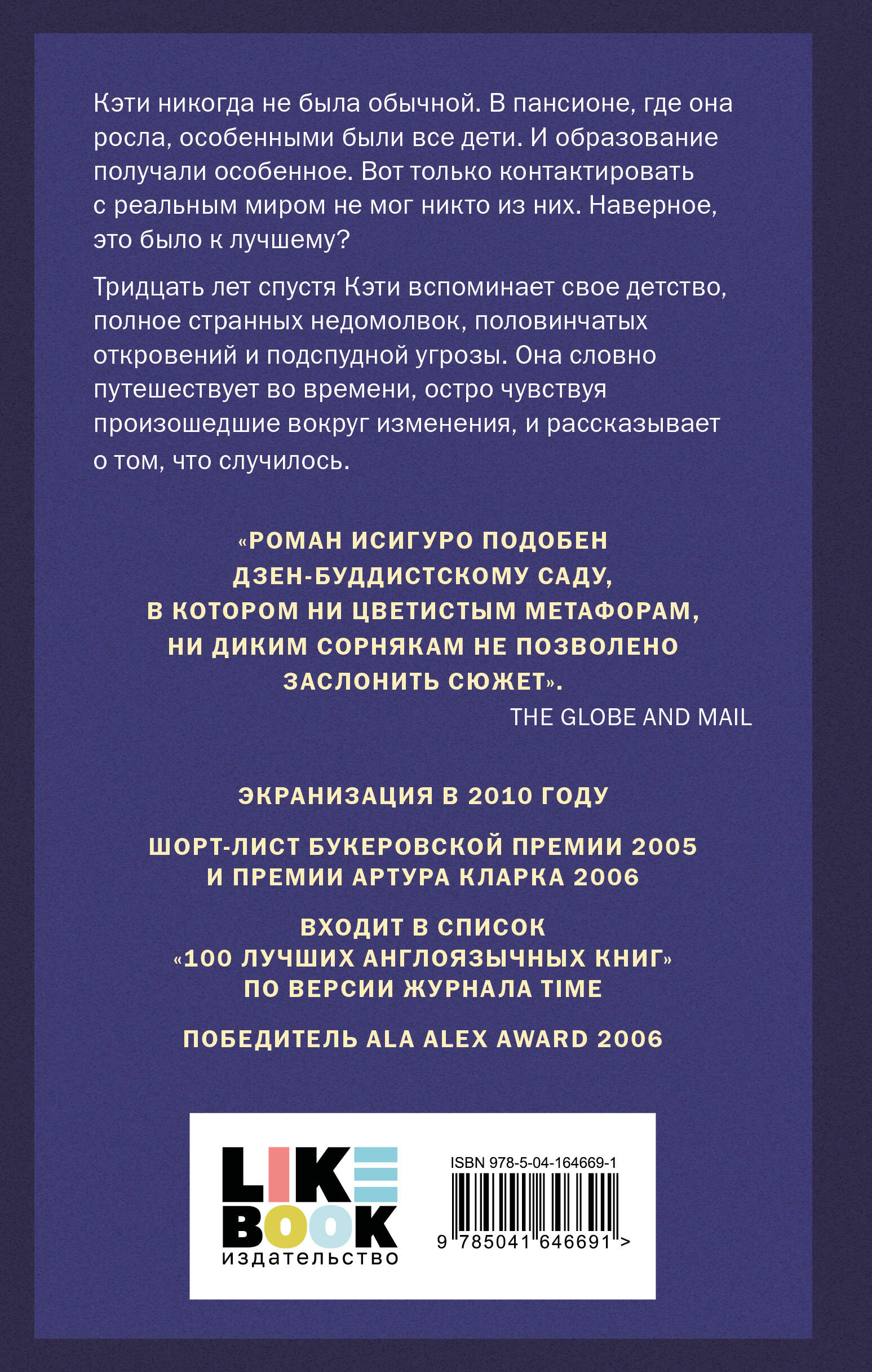 НОВИНКА В СЕРИИ «YOUNG ADULT. НОВЫЙ МИР». Переиздание легендарного романа «Не отпускай меня» Кадзуо Исигуро. Пронзительная книга, которая по праву входит в список 100 лучших английских романов всех времен по версии журнала «Time». Это роман-притча. Это история любви, дружбы и памяти. Это предельное овеществление метафоры «служить всей жизнью». Кэти никогда не была обычной. В пансионе, где она росла, особенными были все дети. И образование получали особенное. Вот только контактировать с реальным миром не мог никто из них. Наверное, это было к лучшему? Тридцать лет спустя Кэти вспоминает свое детство, полное странных недомолвок, половинчатых откровений и подспудной угрозы. Она словно путешествует во времени, остро чувствуя произошедшие вокруг изменения, и рассказывает о том, что случилось. О КНИГЕ • Входит в список «100 лучших англоязычных книг» по версии журнала Time. • Четвертое место в списке 100 лучших книг 21-го века по версии The Guardian. • Шорт-лист Букеровской премии 2005 и Премии Артура Кларка 2006. • Победитель ALA Alex Award 2006. • Экранизация в 2010 году. В главных ролях Кэри Маллиган, Эндрю Гарфилд и Кира Найтли. • Мировой бестселлер. ОТЗЫВЫ «Исигуро - один из самых блестящих стилистов нашего времени». - Майкл Ондатже, автор «Английского пациента» «Роман Исигуро подобен дзен-буддистскому саду, в котором ни цветистым метафорам, ни диким сорнякам не позволено заслонить сюжет». - The Globe and Mail «Исигуро - вдохновенный певец утраты. К своим персонажам он относится с бесконечной теплотой, как бы те ни заблуждались или попадали впросак». - The Guardian| Издательство | ООО "Издательство "Эксмо" |