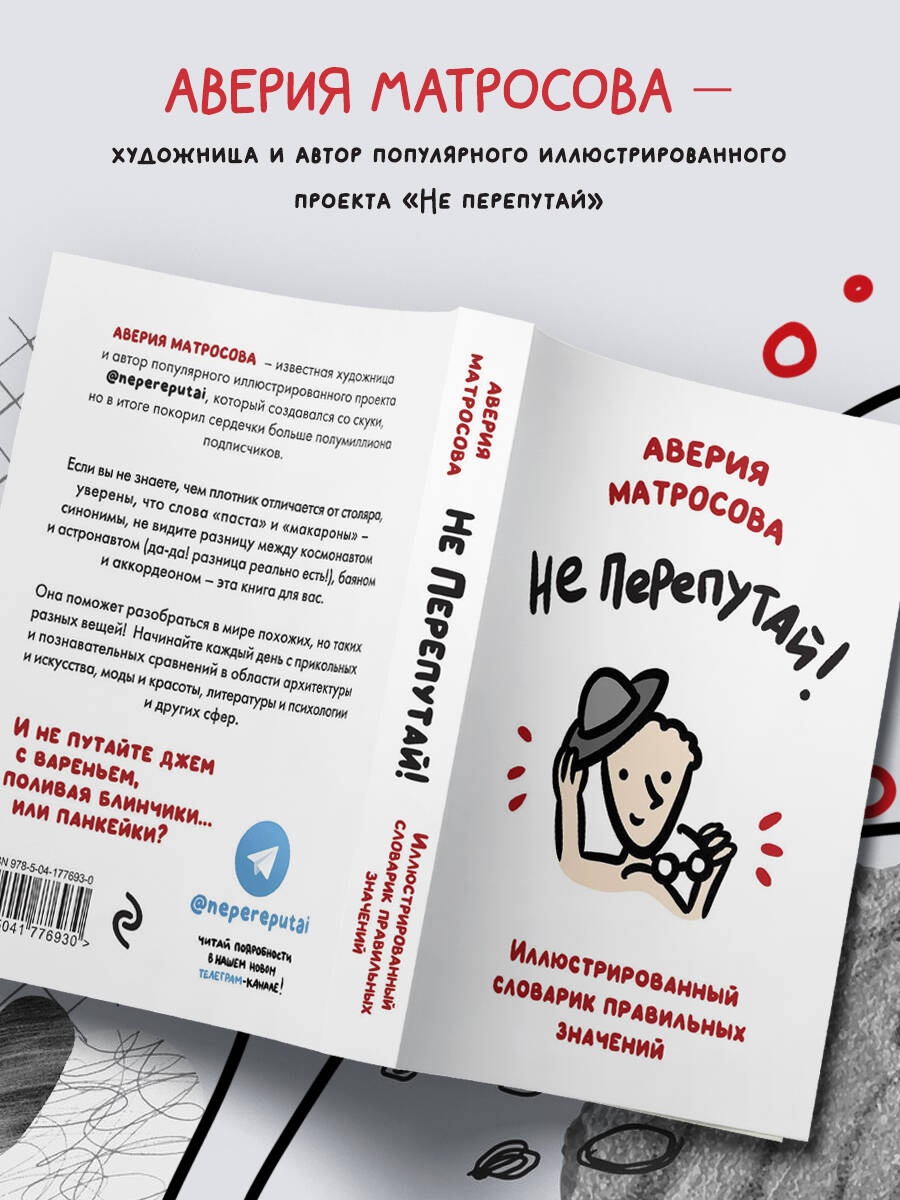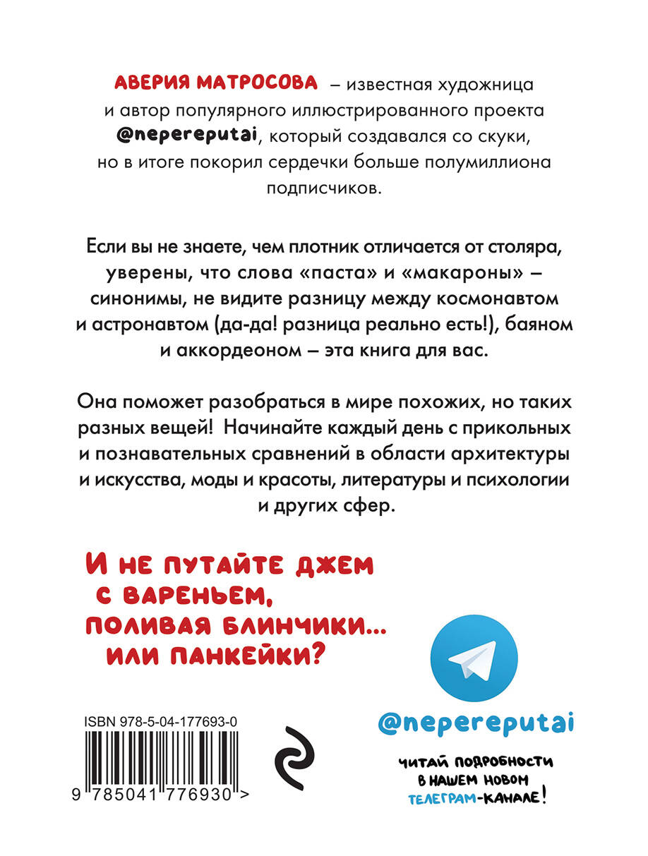 Если вы не знаете, чем плотник отличается от столяра, уверены, что слова «паста» и «макароны» - синонимы, не видите разницу между космонавтом и астронавтом (да-да! разница реально есть!), баяном и аккордеоном - эта книга для вас. Она поможет разобраться в мире похожих, но таких разных вещей! Начинайте каждый день с прикольных и познавательных сравнений в области архитектуры, искусства, моды и красоты, литературы и психологии, и других сфер. Аверия Матросова - известная художница и автор популярного иллюстрированного проекта «Не перепутай», который создавался со скуки, но в итоге покорил сердечки больше полумиллиона подписчиков.| Издательство | ООО "Издательство "Эксмо" |