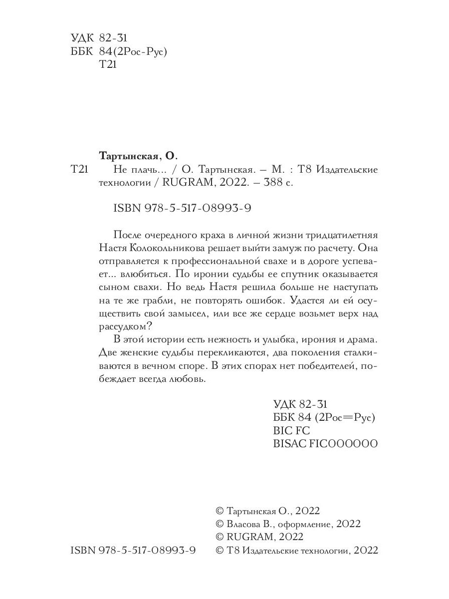 После очередного краха в личной жизни тридцатилетняя Настя Колокольникова решает выйти замуж по расчету. Она отправляется к профессиональной свахе и в дороге успевает… влюбиться. По иронии судьбы ее спутник оказывается сыном свахи. Но ведь Настя решила больше не наступать на те же грабли, не повторять ошибок. Удастся ли ей осуществить свой замысел, или все же сердце возьмет верх над рассудком? В этой истории есть нежность и улыбка, ирония и драма. Две женские судьбы перекликаются, два поколения сталкиваются в вечном споре. В этих спорах нет победителей, побеждает всегда любовь.| Издательство | Т8 RUGRAM |