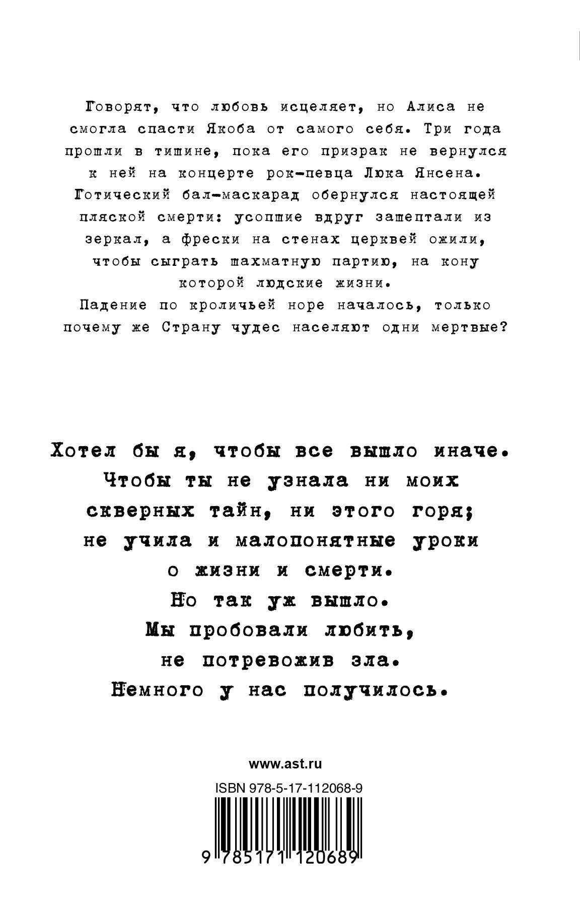 Говорят, что любовь исцеляет, но Алиса не смогла спасти Якоба от самого себя. Три года прошли в тишине, пока его призрак не вернулся к ней на концерте рок-певца Люка Янсена. Готический бал-маскарад обернулся настоящей пляской смерти: усопшие вдруг зашептали из зеркал, а фрески на стенах церквей ожили, чтобы сыграть шахматную партию, на кону которой людские жизни. Падение по кроличьей норе началось, только почему же Страну чудес населяют одни мертвые?| Издательство | ИЗДАТЕЛЬСТВО "АСТ" |
