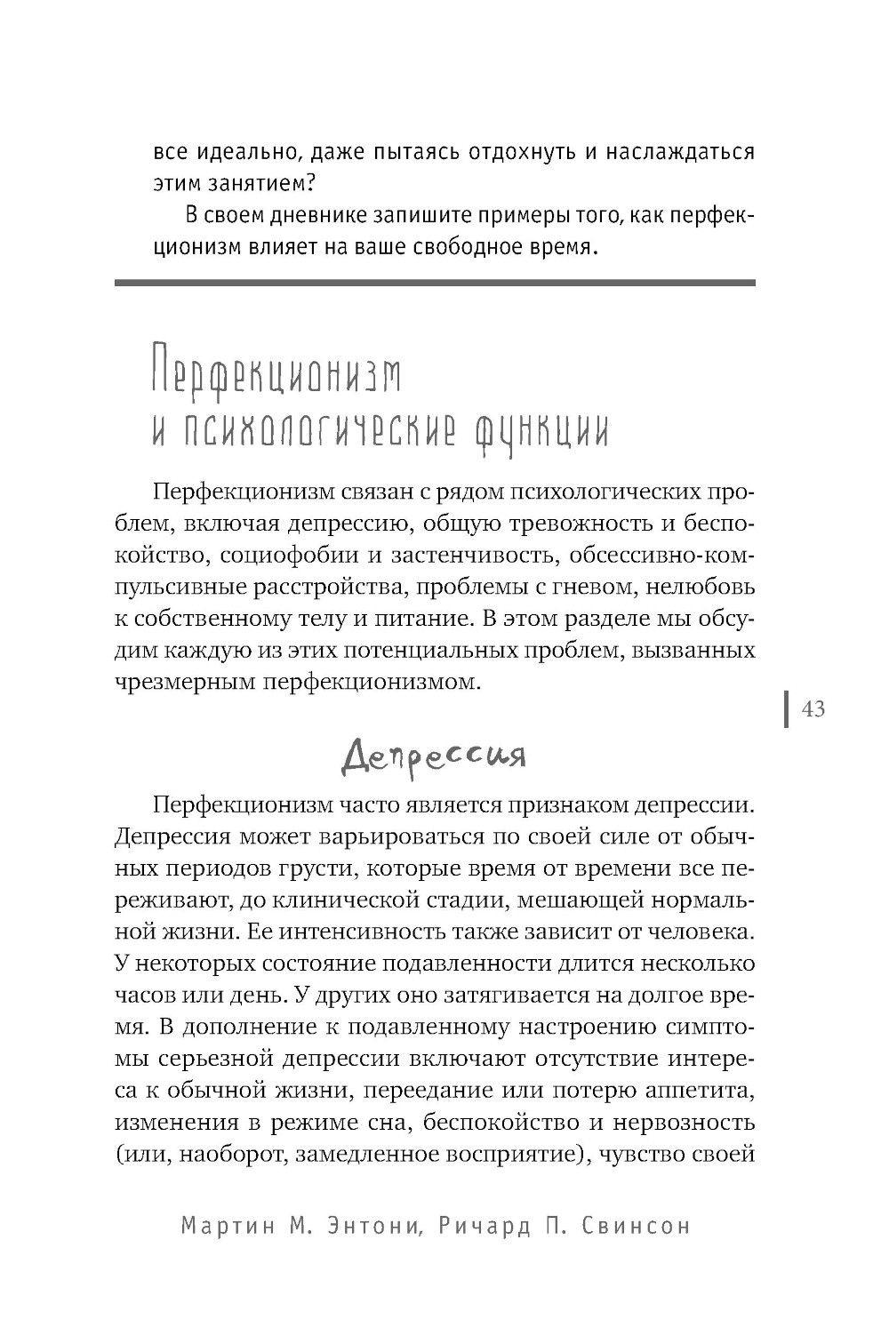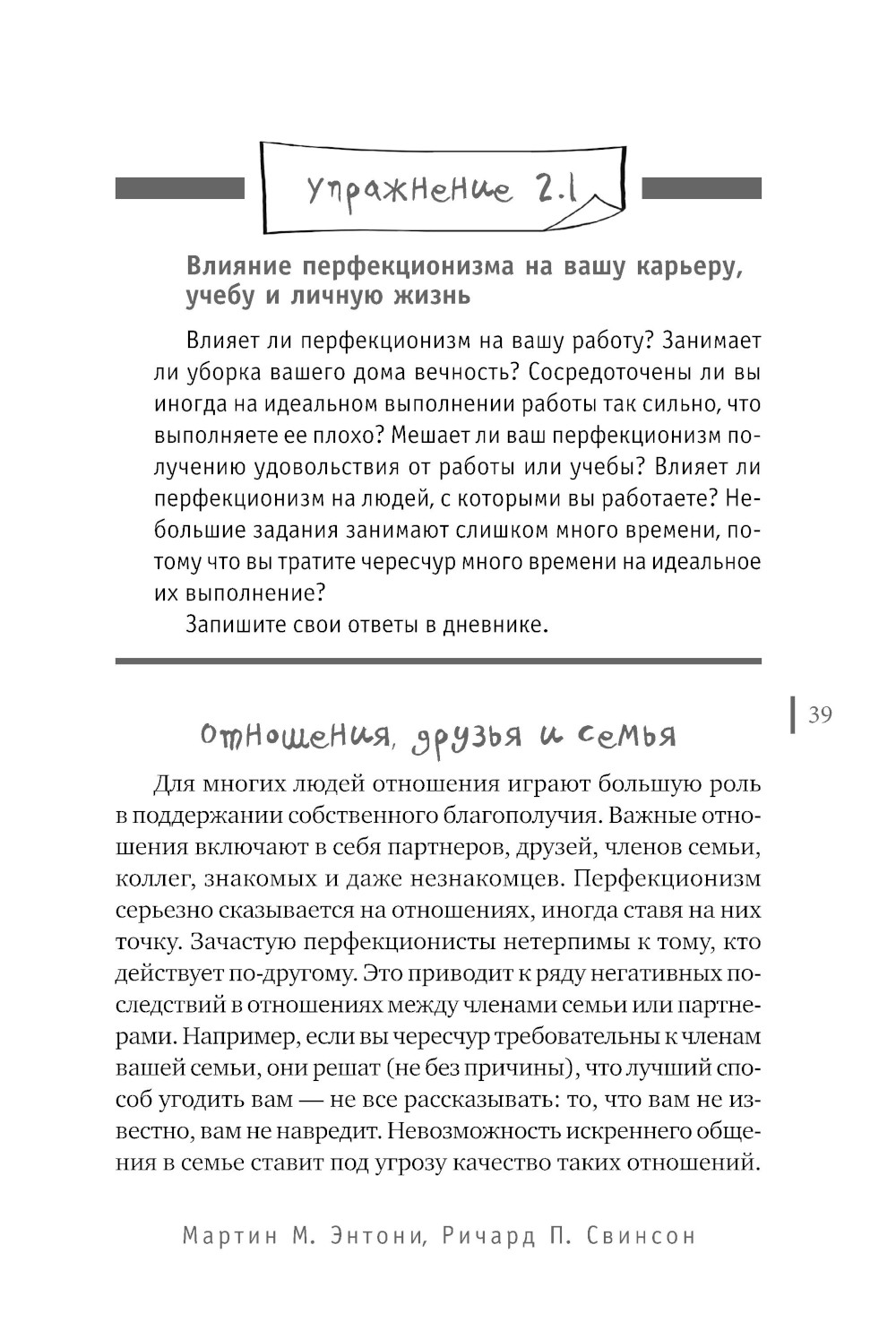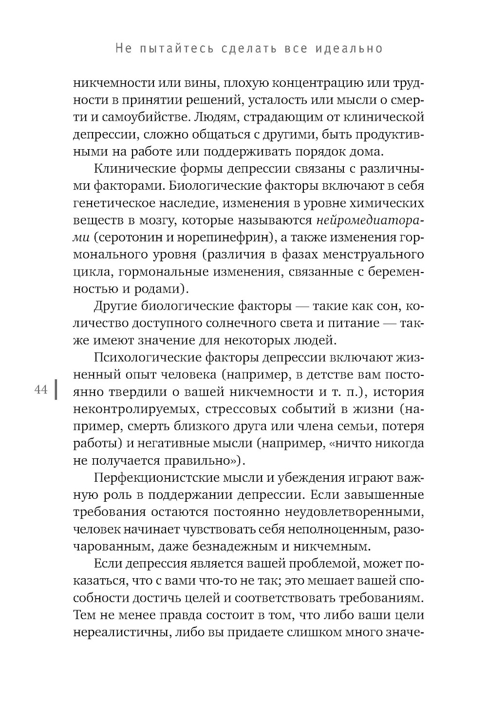 Многие считают перфекционизм главной трудовой добродетелью. «Я перфекционист» - эти слова люди обычно произносят с гордостью. Казалось бы, привычка постоянно находить в себе и своей работе недочёты необходима для личностного и профессионального развития. Но авторы этой книги считают иначе. Они изучали проблему перфекционизма более 20 лет (да и сами в прошлом стремились к «нездоровому совершенству») и убедились: перфекционизм токсичен. Иными словами, перфекционист постоянно себя унижает и заставляет испытывать стресс. Это, в свою очередь, приводит к эмоциональному выгоранию и серьезным заболеваниям. Но обуздать это стремление к сверх-совершенству - очень трудно.