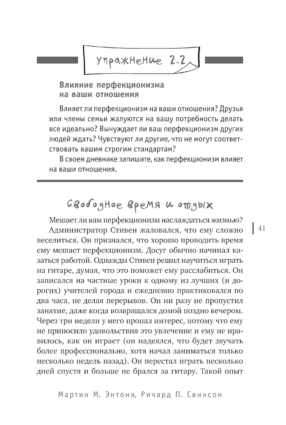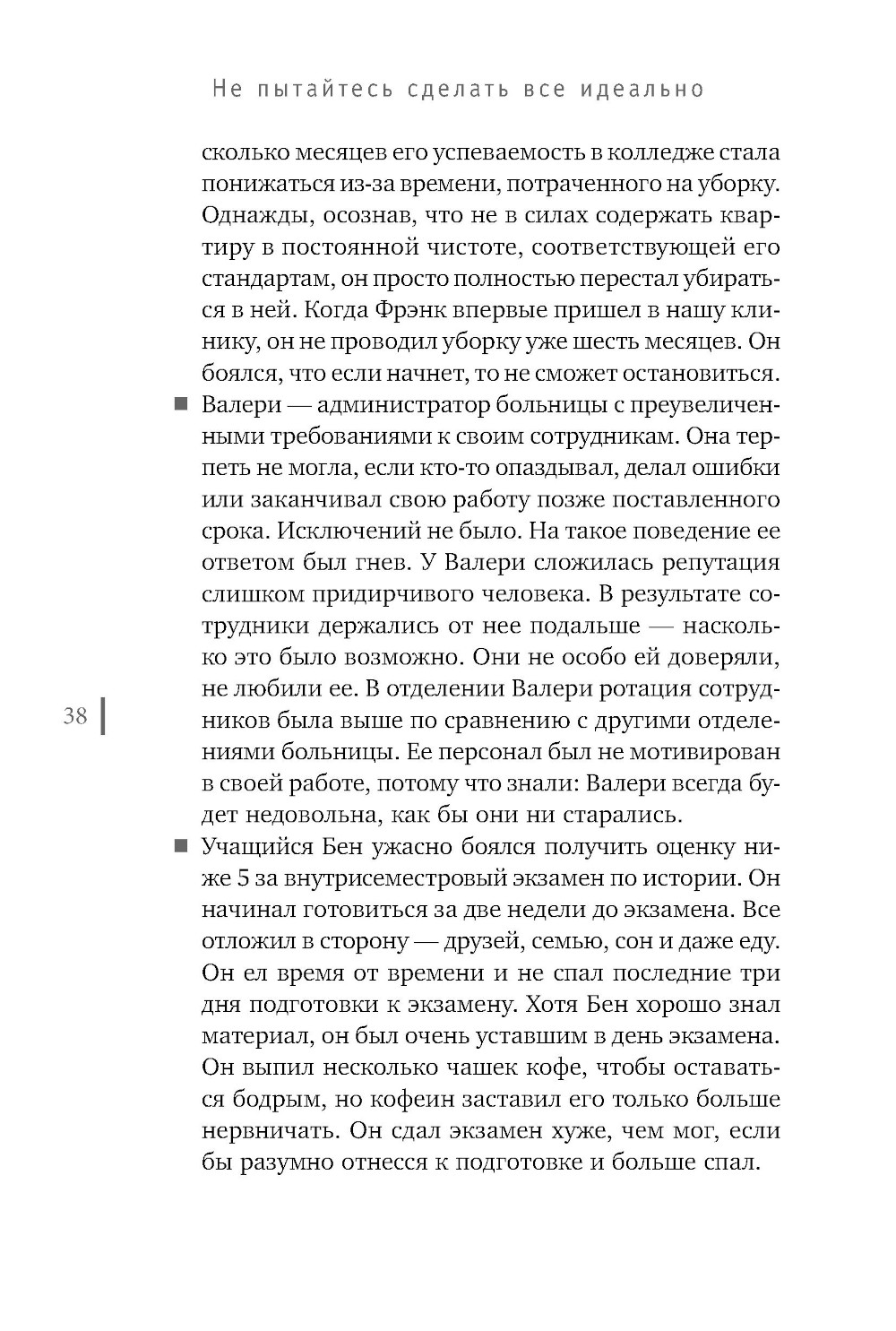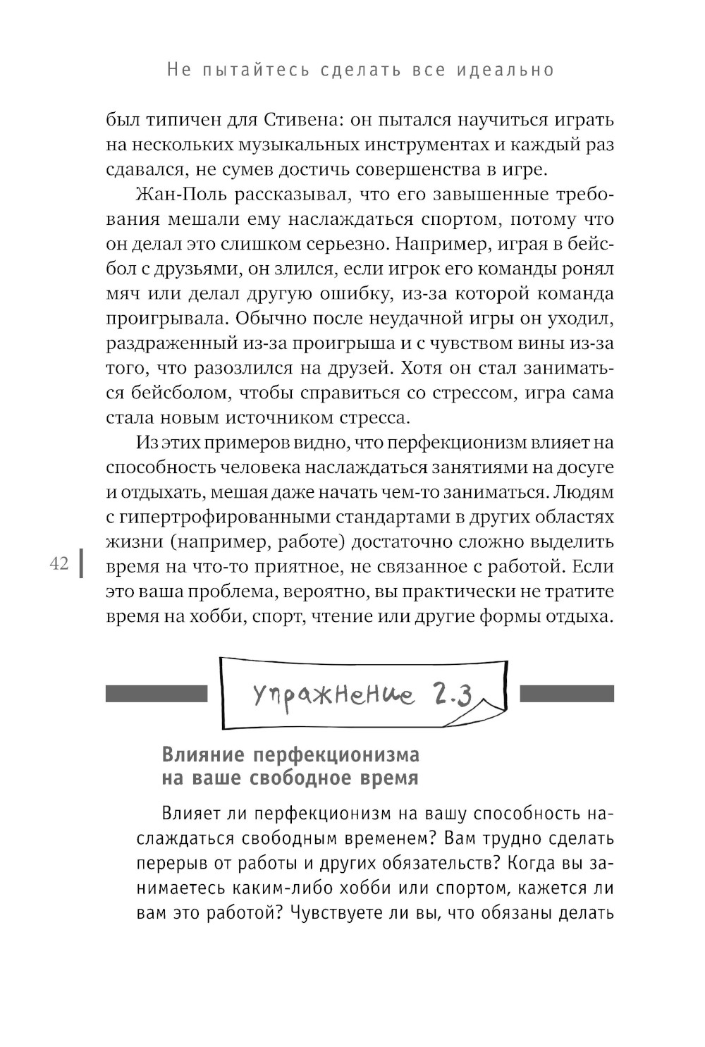 В этой книге вы найдете более 50 практик, которые избавят вас от чрезмерного перфекционизма: помогут лучше распоряжаться своим временем, фокусироваться на важном, научиться «жить с ошибками». Авторы разрабатывали их в течение многих лет и опробовали на себе. Выберите технику, которая подойдет вам лучше всего, и практикуйте не менее двух недель. Предупреждение: даже в этом случае не пытайтесь сделать все идеально. И помните главную фразу анти-перфекциониста: «На сегодня достаточно».