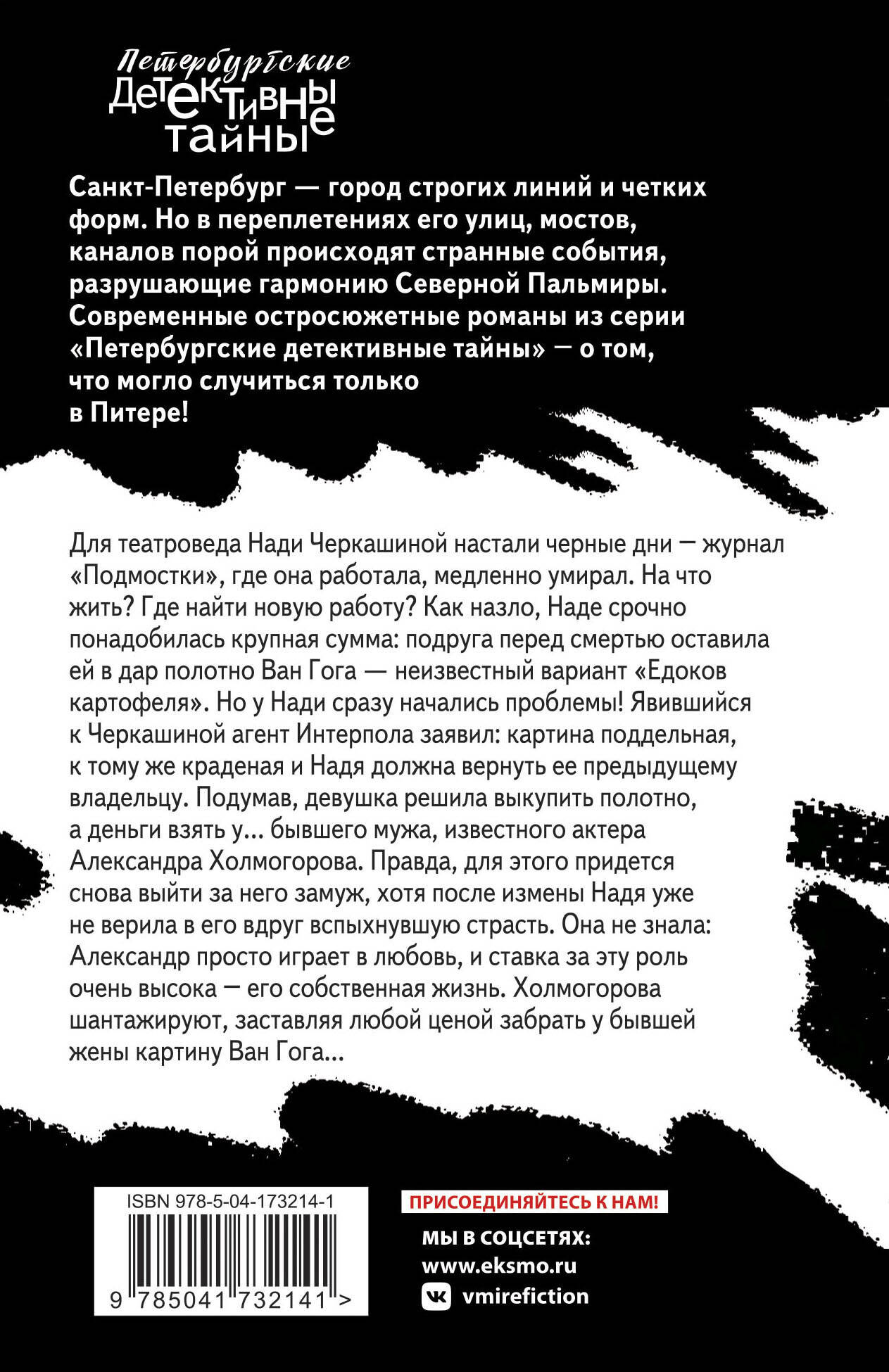 Для театроведа Нади Черкашиной настали черные дни - журнал «Подмостки», где она работала, медленно умирал. На что жить? Где найти новую работу? Как назло, Наде срочно понадобилась крупная сумма: подруга перед смертью оставила ей в дар полотно Ван Гога - неизвестный вариант «Едоков картофеля». Но у Нади сразу начались проблемы! Явившийся к Черкашиной агент Интерпола заявил: картина поддельная, к тому же краденая, и Надя должна вернуть ее предыдущему владельцу. Подумав, девушка решила выкупить полотно, а деньги взять у… бывшего мужа, известного актера Александра Холмогорова. Правда, для этого придется снова выйти за него замуж, хотя после измены Надя уже не верила в его вдруг вспыхнувшую страсть. Она не знала: Александр просто играет в любовь, и ставка за эту роль очень высока - его собственная жизнь. Холмогорова шантажируют, заставляя любой ценой забрать у бывшей жены картину Ван Гога... Татьяна Устинова рекомендует: «Островская играет жизнями, тасует героев, заставляет их совершать неожиданные и странные поступки, а читателя - с замиранием сердца следить за ними и гадать: сработает, не сработает, выберутся, не выберутся!.. Сюжет то и дело поворачивает в какую-то другую сторону и на полной скорости несется дальше. Это почти невозможно, но ей удается удержаться на этих виражах!.. И очень хочется, чтобы у героев все получилось!.. И финал! Он всегда феерический, во всех отношениях».| Издательство | ООО "Издательство "Эксмо" |