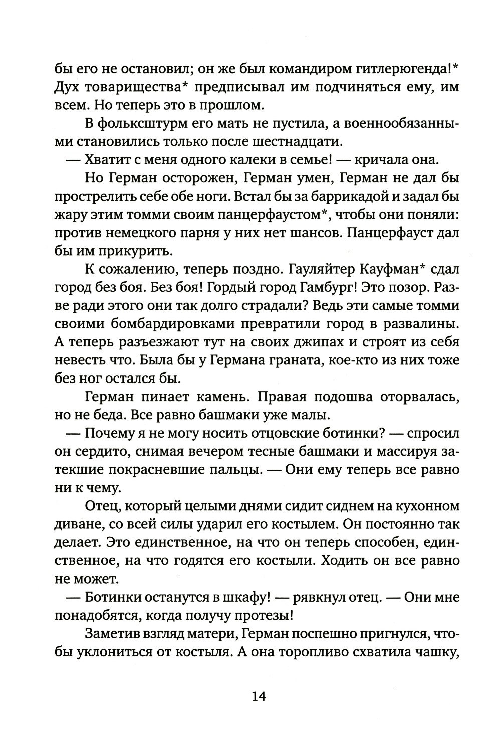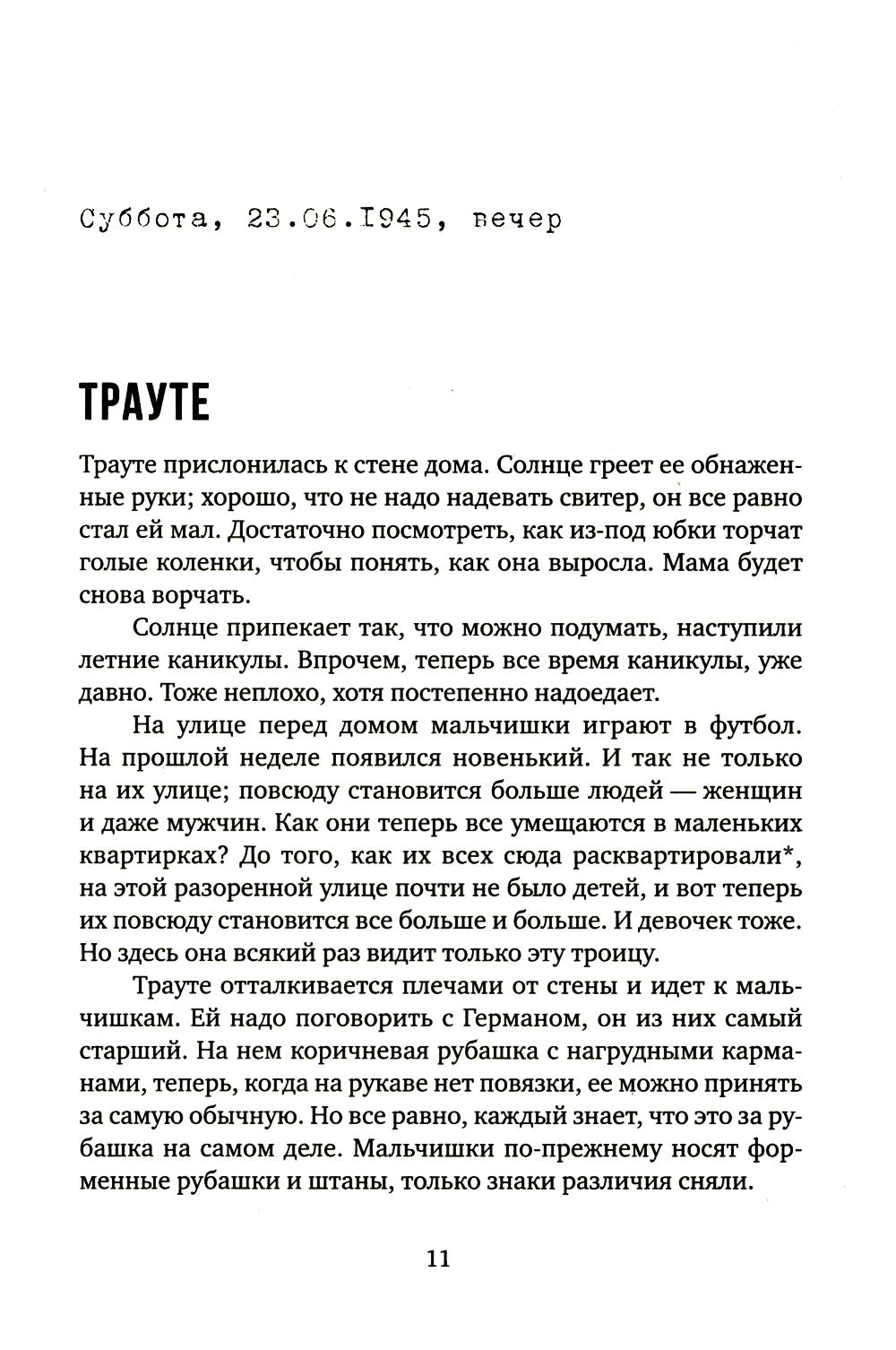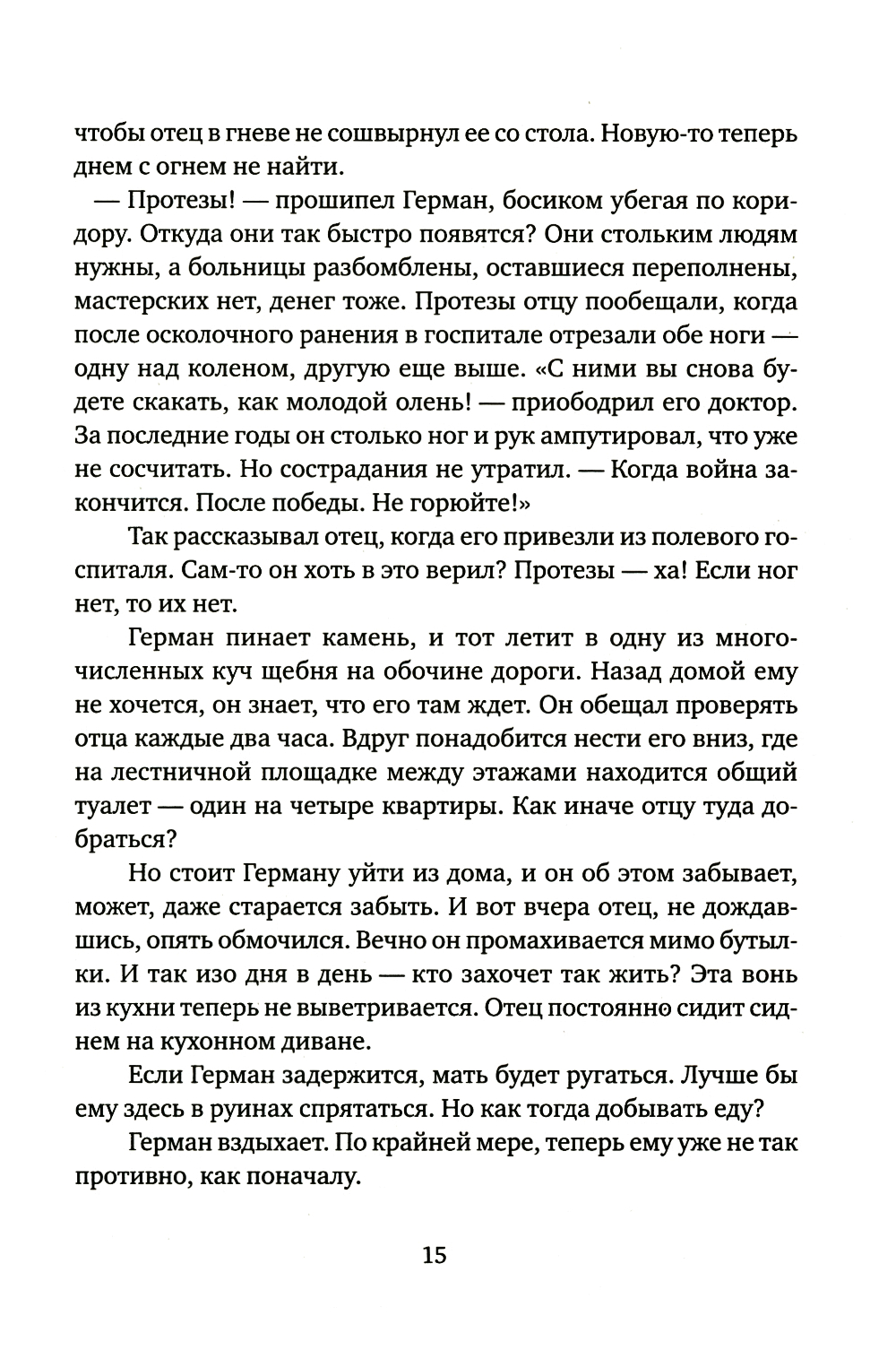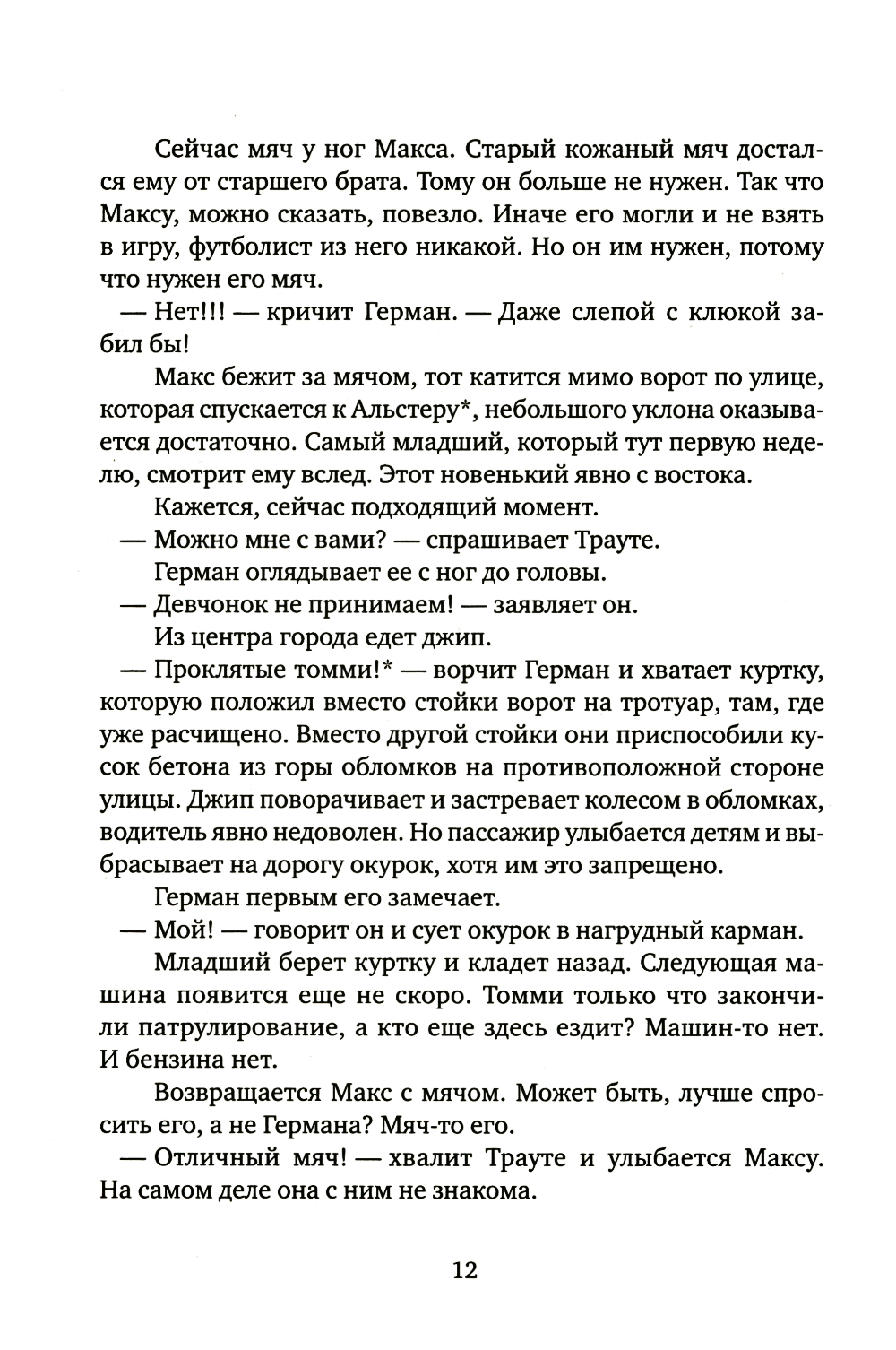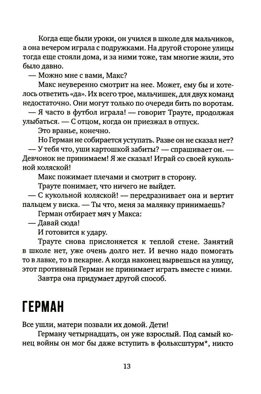 Июнь 1945 года, полуразрушенный Гамбург оккупирован британскими войсками. Среди руин, в голоде и тоске, подростки Якоб, Трауте и Герман с разным жизненным опытом учатся дружить и помогать ближнему, отличать правду от пропаганды, переживать потери и находят в себе силы верить в будущее. Кирстен Бойе (р. 1950) - известная немецкая писательница, автор более 100 книг для детей и юношества, отмечена многочисленными литературными премиями и наградами. В ее родном Гамбурге учреждена Премия имени Кирстен Бойе за лучшую рукопись для детей 8-11 лет.| Издательство | Самокат |