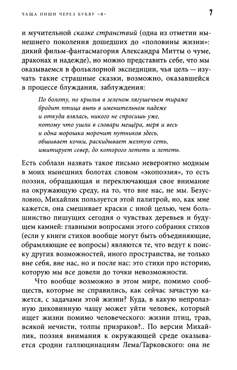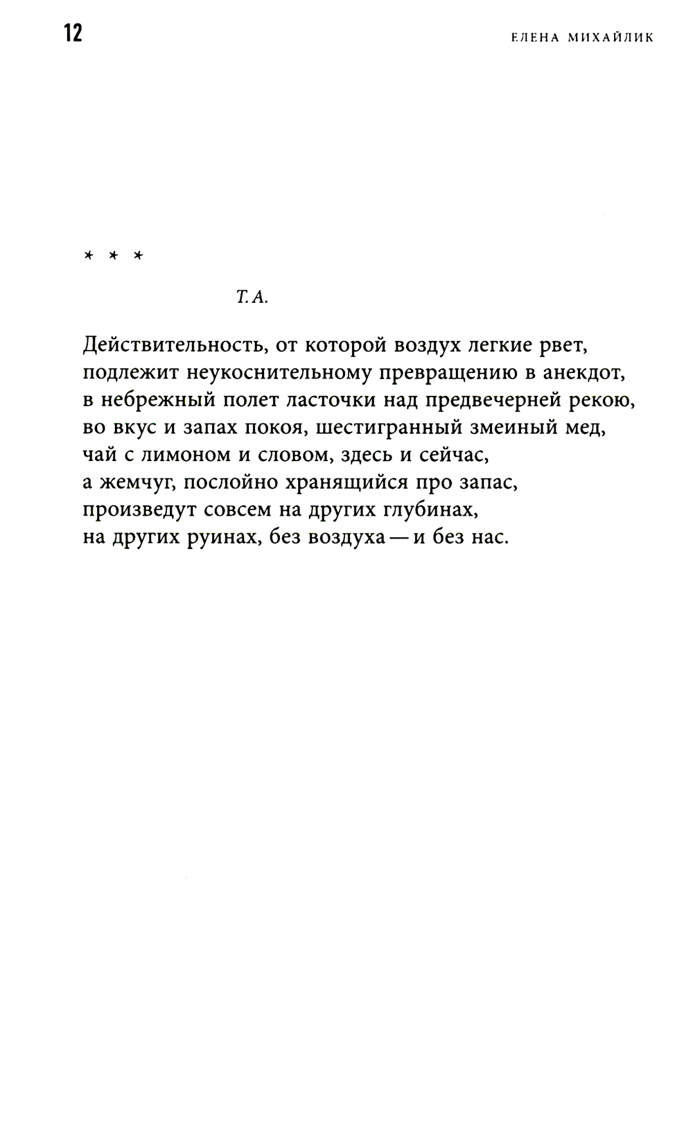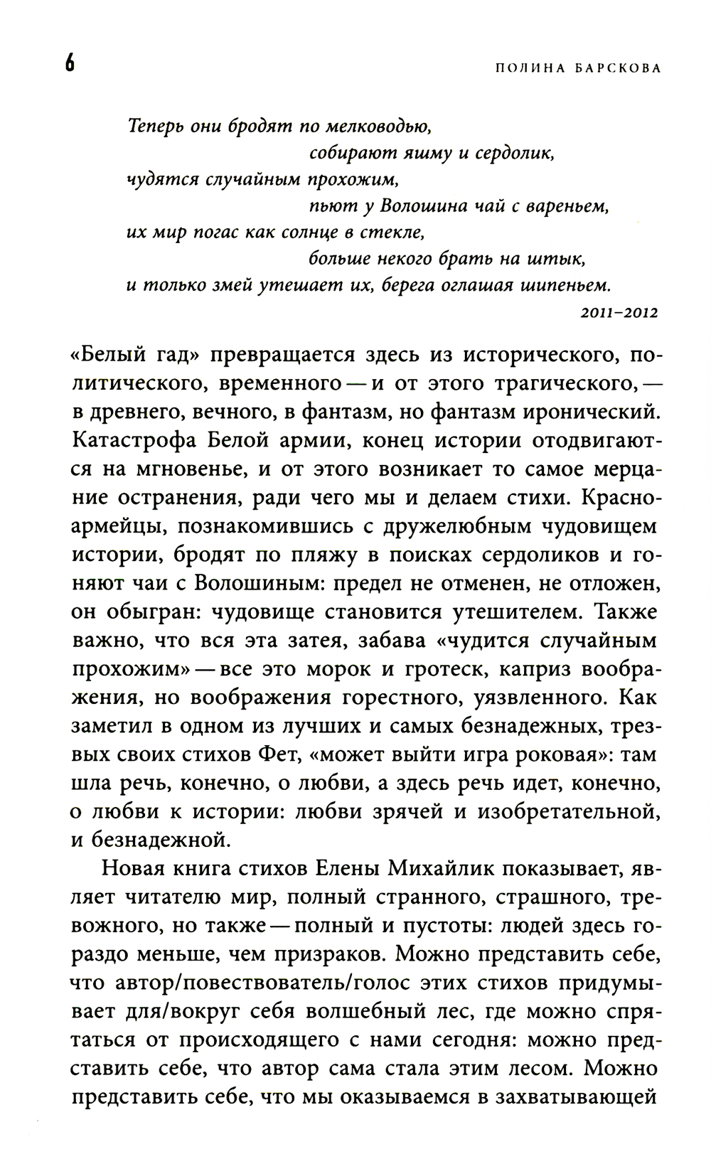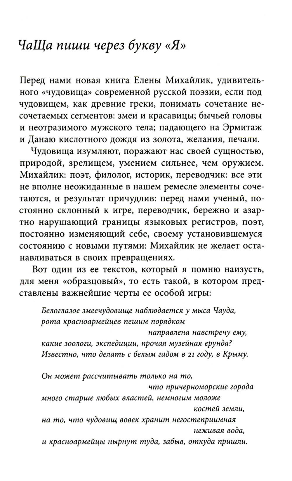 Ученый, постоянно склонный к игре, переводчик, бережно и азартно нарушающий границы языковых регистров, поэт, постоянно меняющийся и не желающий останавливаться в своих превращениях, Елена Михайлик являет читателю мир, полный странного, страшного и тревожного. Это мир-фантасмагория захватывающей и мучительной сказки странствий и одновременно фольклорной экспедиции, цель которой - изучать такие страшные сказки, но которая сама оказалась в процессе блуждания и, возможно, заблуждения. Елена Михайлик родилась в Одессе, окончила филологический факультет ОГУ. С 1993 года живет в Сиднее, преподает в университете Нового Южного Уэльса. Доктор философии. Стихи и статьи публиковались в антологии «Освобожденный Улисс», журналах «Арион», «Воздух», «Дети Ра», «Новый мир», «Новое литературное обозрение». Премия Андрея Белого в номинации «Гуманитарные исследования» (2019) за монографию, посвященную творчеству Варлама Шаламова. Автор трех книг стихов: «Ни сном, ни облаком» (Арго-Риск, 2008), «Экспедиция» (Литература без границ, 2019), «Рыба сказала "да"» (Кабинетный ученый, 2021).