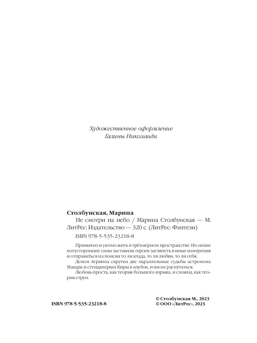 Привычно и уютно жить в трёхмерном пространстве. Но некие потусторонние силы заставили героев заглянуть в иные измерения и отправиться на поиски то ли клада, то ли любви, то ли себя. Демон Агриппа скрутил две параллельные судьбы астронома Макара и стендаперши Киры в клубок, и им не распутаться. Любовь проста, как теория большого взрыва, и сложна, как теория струн.| Издательство | Т8 RUGRAM |