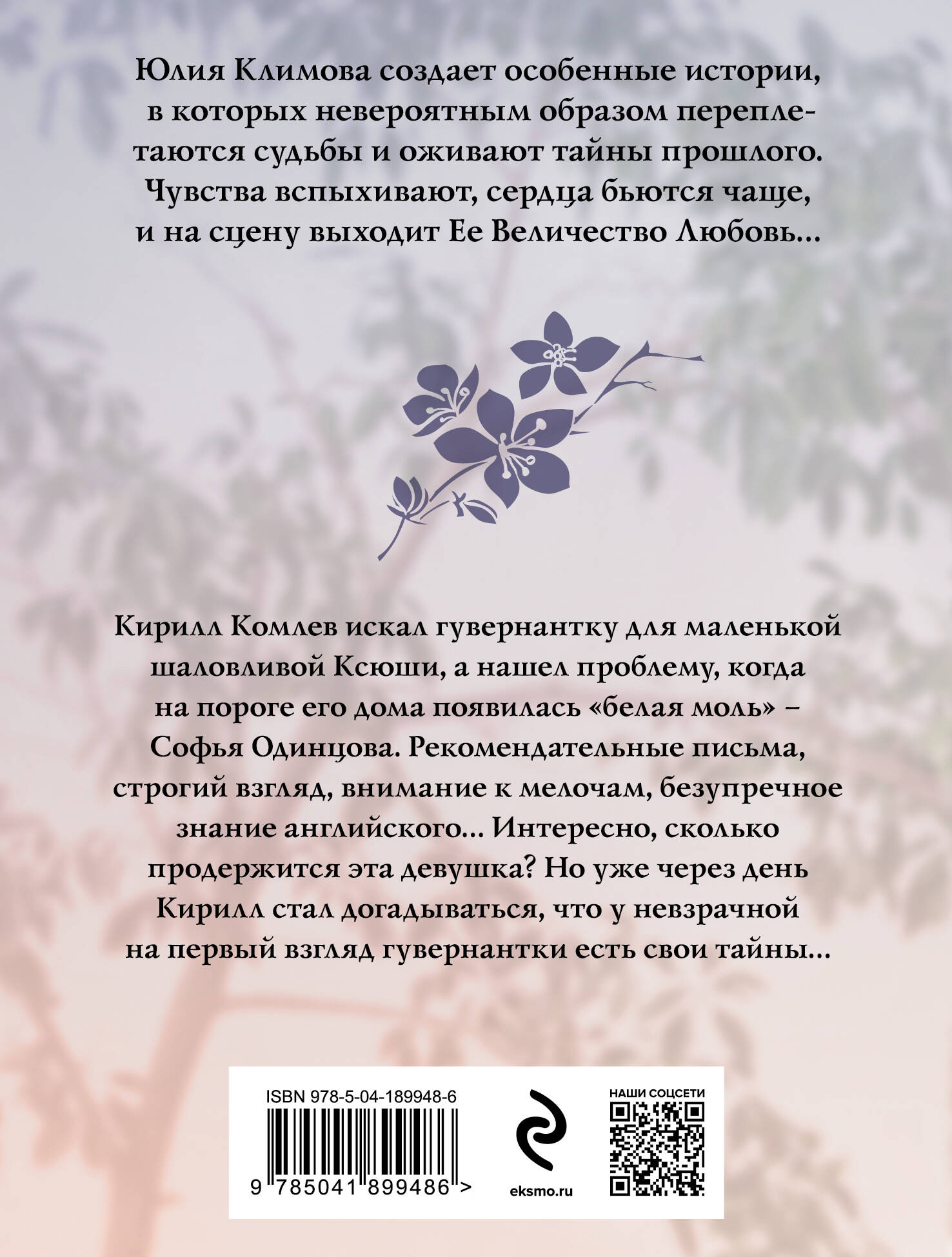Истории Юлии Климовой - самые уютные и добрые романы о любви. Кирилл Комлев искал гувернантку для маленькой шаловливой Ксюши, а нашел проблему, когда на пороге его дома появилась «белая моль» - Софья Одинцова. Рекомендательные письма, строгий взгляд, внимание к мелочам, безупречное знание английского… Интересно, сколько продержится эта девушка? Но уже через день Кирилл стал догадываться, что у невзрачной на первый взгляд гувернантки есть свои тайны…