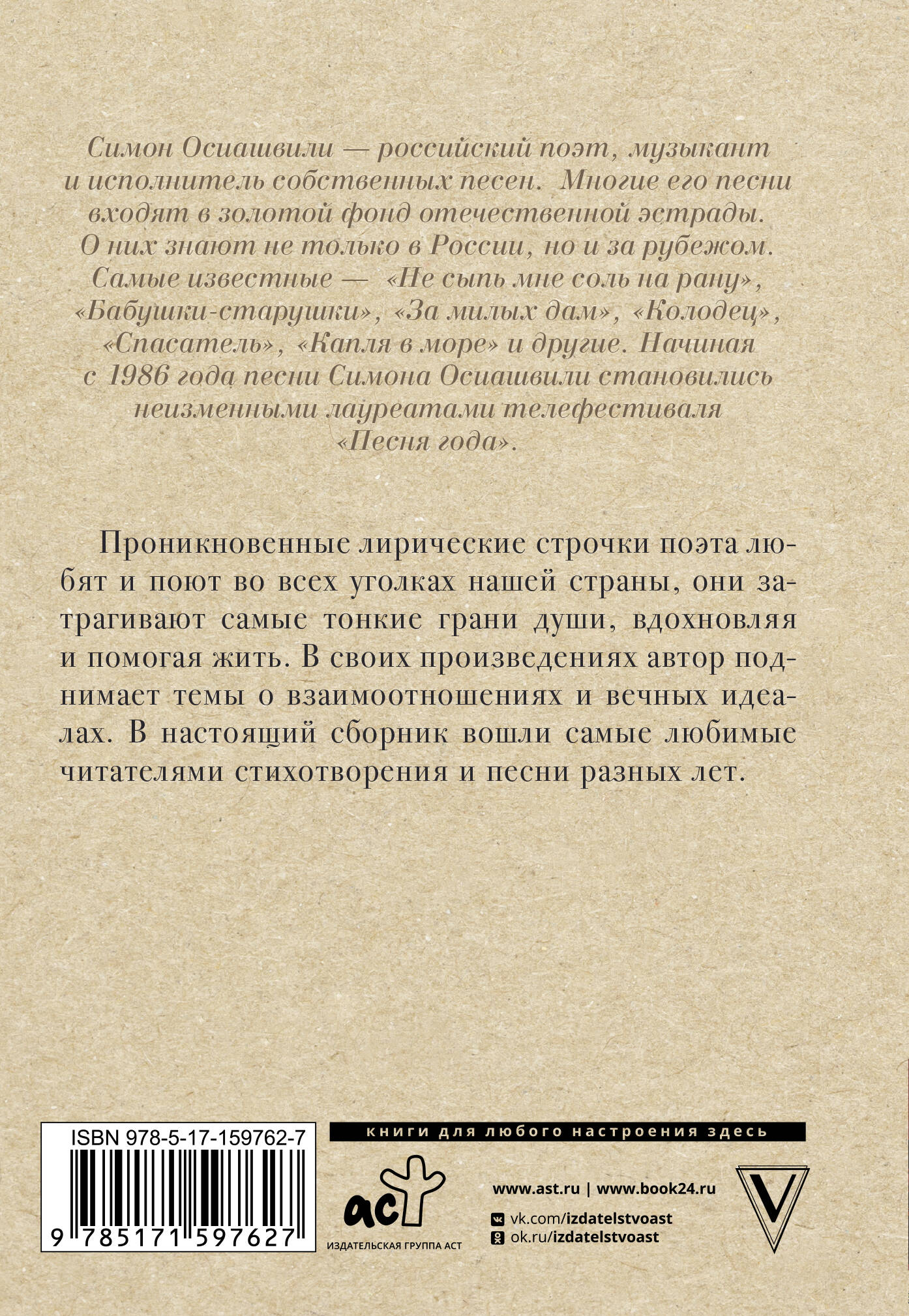Симон Осиашвили - российский поэт, музыкант и исполнитель собственных песен. Многие его песни входят в золотой фонд отечественной эстрады. О них знают не только в России, но и за рубежом. Самые известные - "Не сыпь мне соль на рану", "Бабушки-старушки", "За милых дам", "Колодец", "Спасатель", "Капля в море" и другие. Начиная с 1986 года песни Симона Осиашвили становились неизменными лауреатами телефестиваля "Песня года". Проникновенные лирические строчки поэта любят и поют во всех уголках нашей страны, они затрагивают самые тонкие грани души, вдохновляя и помогая жить. В своих произведениях автор поднимает темы о взаимоотношениях и вечных идеалах. В настоящий сборник вошли самые любимые читателями стихотворения и песни разных лет.| Издательство | Издательство "АСТ" |