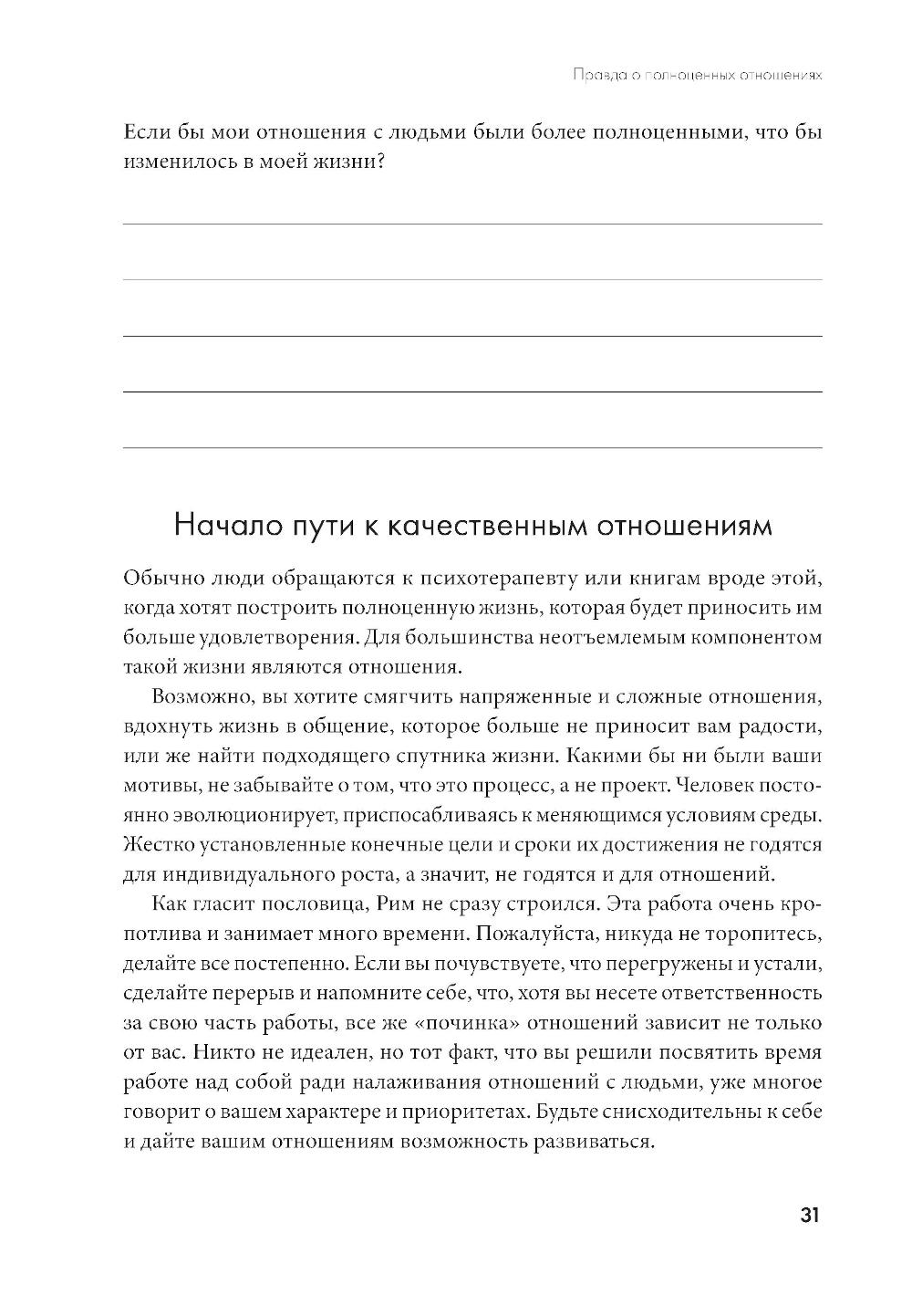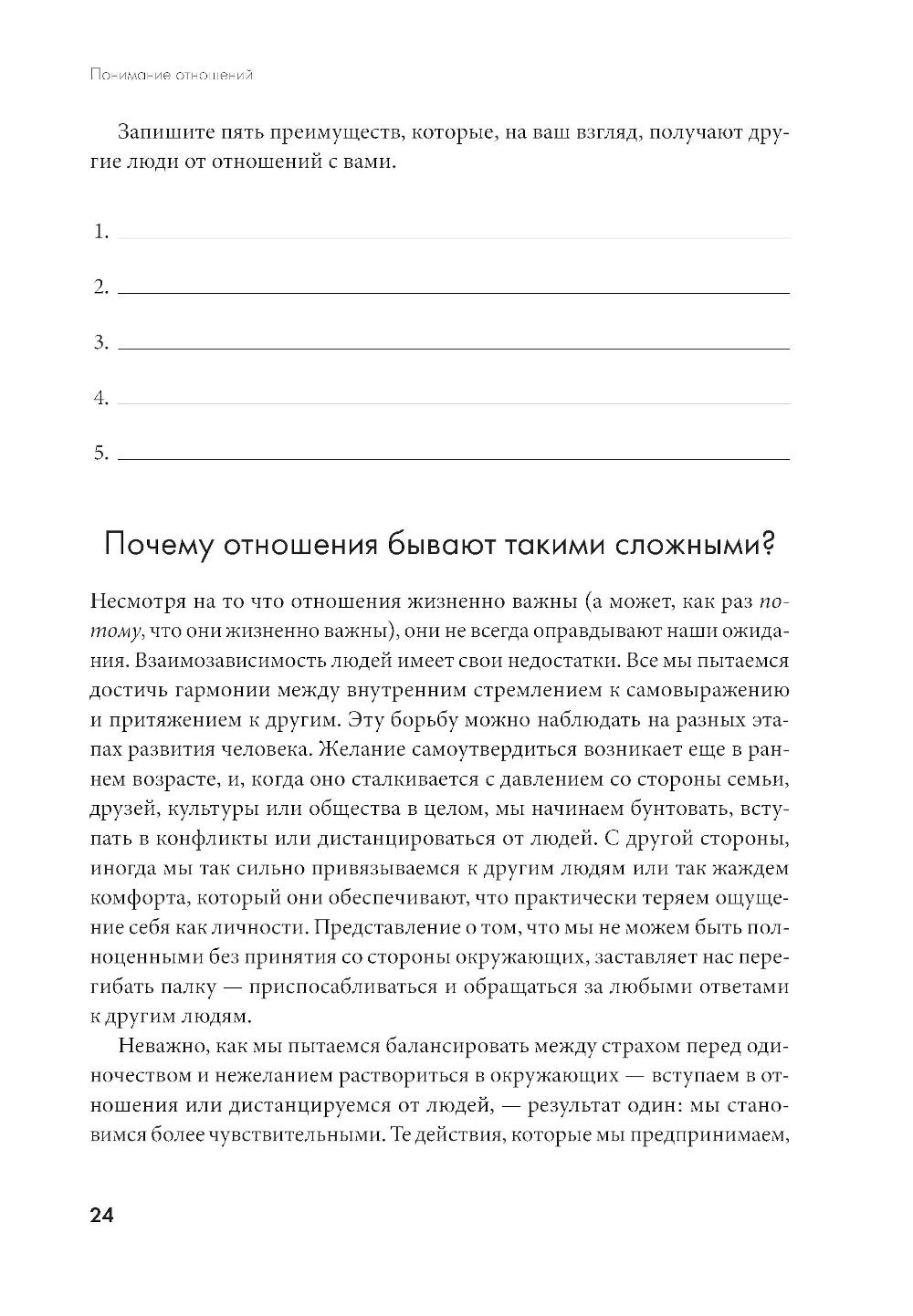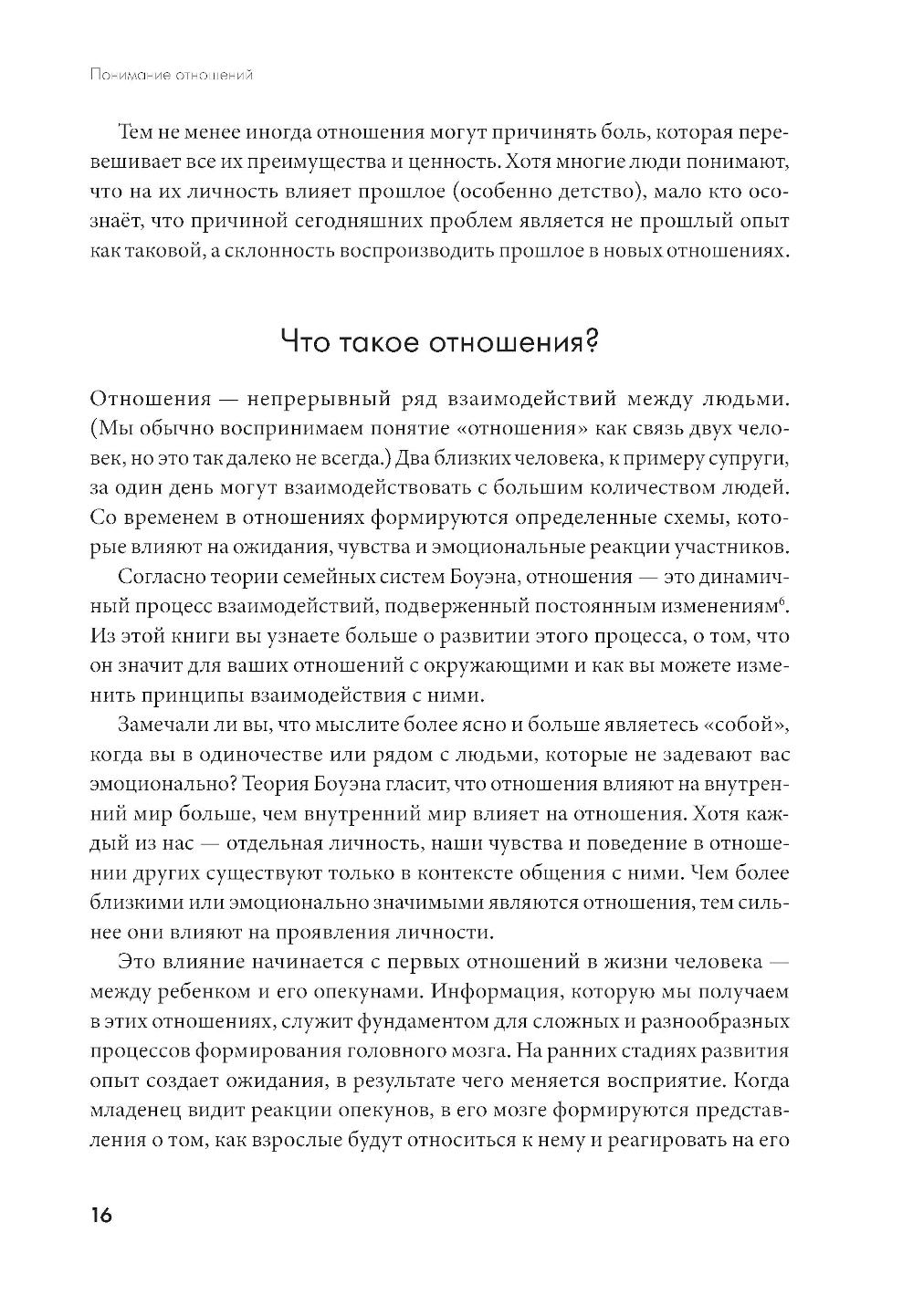 Книга психотерапевтов Айлин Коэн и Эдрики Ричардсон - это руководство по построению здоровых отношений с людьми и с самим собой. Опираясь на научные данные и результаты социологических исследований, иллюстрируя свои выводы живыми примерами из практики, авторы изучают природу отношений между людьми, объясняют, почему крепкие связи с окружающими важны для каждого человека, и анализируют шесть этапов движения к полноценным отношениям. В книге много доступных каждому упражнений, выполняя которые, вы поработаете с семейной историей, узнаете, какова роль самоопределения в отношениях, что такое треугольники и чем полезна уязвимость, научитесь эффективной коммуникации и освоите навык самоанализа. Все это поможет вам, развиваясь и совершенствуя себя, улучшить отношения с людьми.