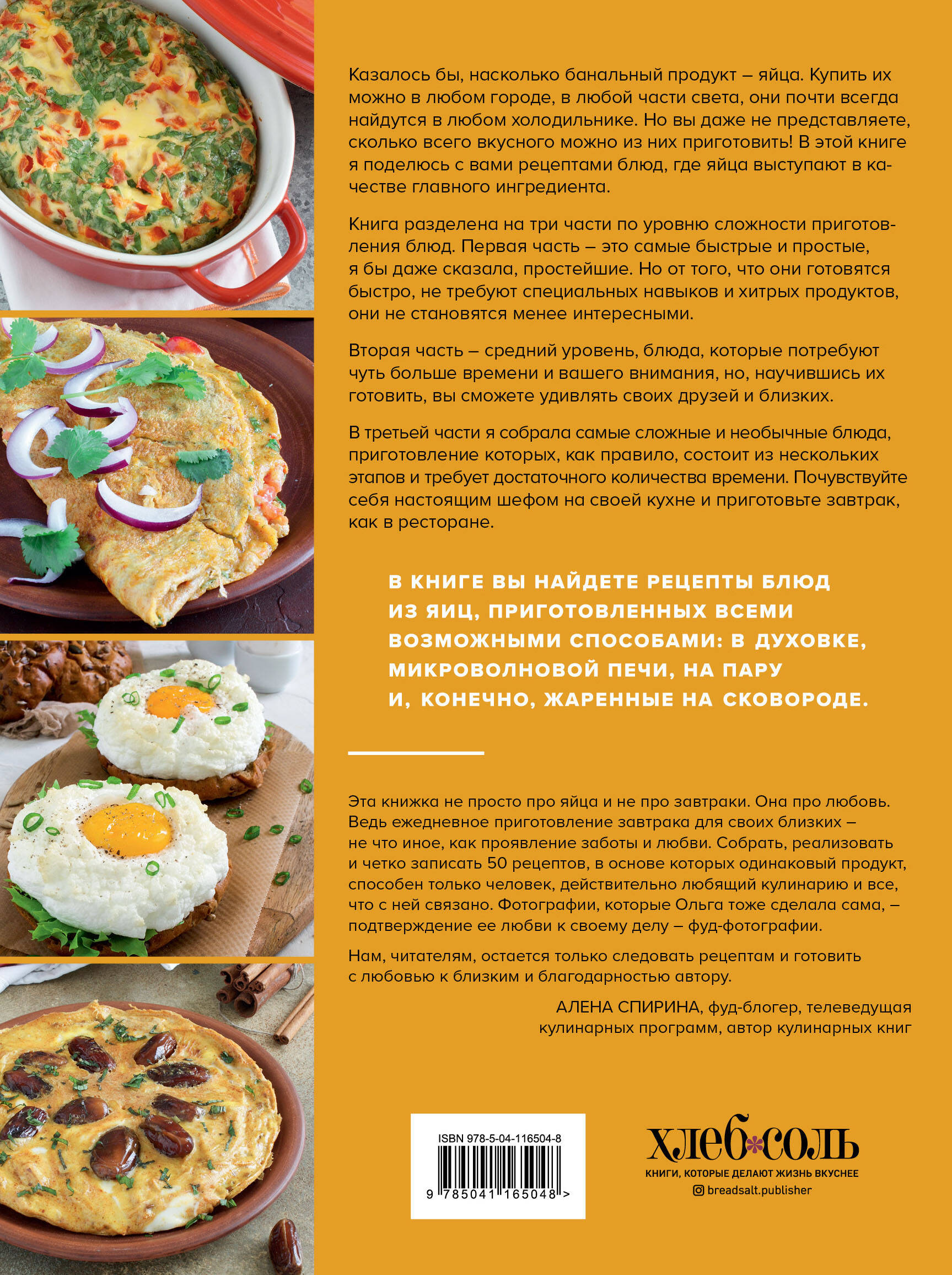 Что может быть банальнее яиц на завтрак? Простой омлет, яичница, пашот... Впрочем, на этом банальности заканчиваются, потому что обыкновенные яйца скрывают в себе огромный потенциал! Ольга Эрбис, автор кулинарного блога @erbisolga, собрала в своей книге 50 ярких завтраков, в которых главную роль играют именно яйца. Жарьте их на сковороде, запекайте в духовке, готовьте на пару или в микроволновке! Спешите или не хотите заморачиваться? Приготовьте моментальный омлет за 20 секунд по методике Джулии Чайлд, традиционный английский завтрак или яйца по-мексикански. Есть немного лишнего времени? Попробуйте оригинальные яичные роллы, яйца по-турецки с йогуртом, зеленый жюльен с яйцами. Готовы на кулинарные подвиги? Отлично! Побалуйте себя бургером с омлетом, сыром и овощами, суши томогояки или яйцами бенедикт, ставшими новой классикой. С бодрым утром!
