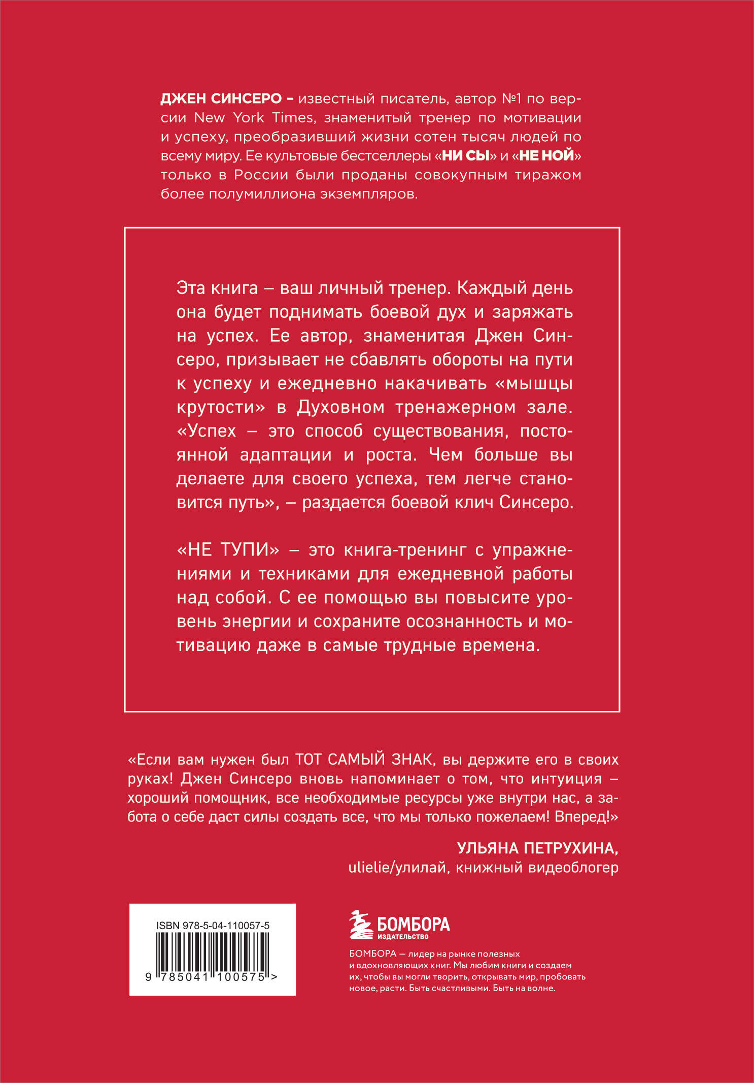 Эта книга - ваш личный тренер. Каждый день она будет поднимать боевой дух и заряжать на успех. Ее автор, знаменитая Джен Синсеро, призывает не сбавлять обороты на пути к успеху и ежедневно накачивать «мышцы крутости» в Духовном тренажерном зале. «Успех - это способ существования, постоянной адаптации и роста. Чем больше вы делаете для своего успеха, тем легче становится путь», - раздается боевой клич Синсеро. «НЕ ТУПИ» - это книга-тренинг с упражнениями и техниками для ежедневной работы над собой. С его помощью вы повысите уровень энергии и сохраните осознанность и мотивацию даже в самые трудные времена. 5 причин купить «НЕ ТУПИ»: 1. Книга написана знаменитой Джен Синсеро, которая лично прошла путь от унылой неудачницы до автора № 1 по версии New York Times. 2. «НЕ ТУПИ» - это продолжение культовых бестселлеров «НИ СЫ» и «НЕ НОЙ». 3. Для этой книги Джен Синсеро отобрала из множества техник по преображению жизни только самые действенные. 4. Все техники проверены лично автором и ее учениками. 5. Фирменный авторский юмор, подкупающая дерзость, искренняя самоирония создают самую мощную и антипафосную книгу-тренинг по саморазвитию.