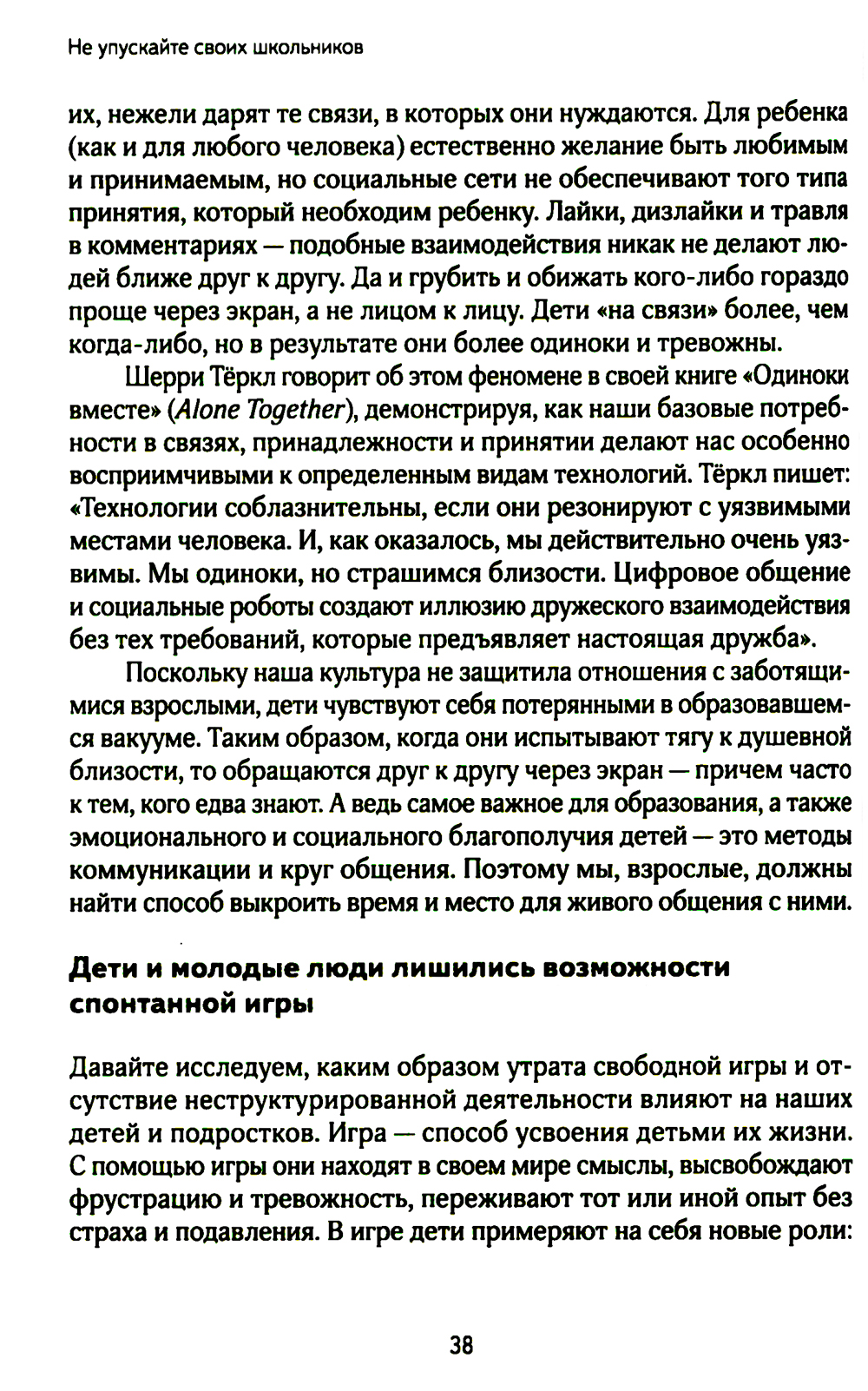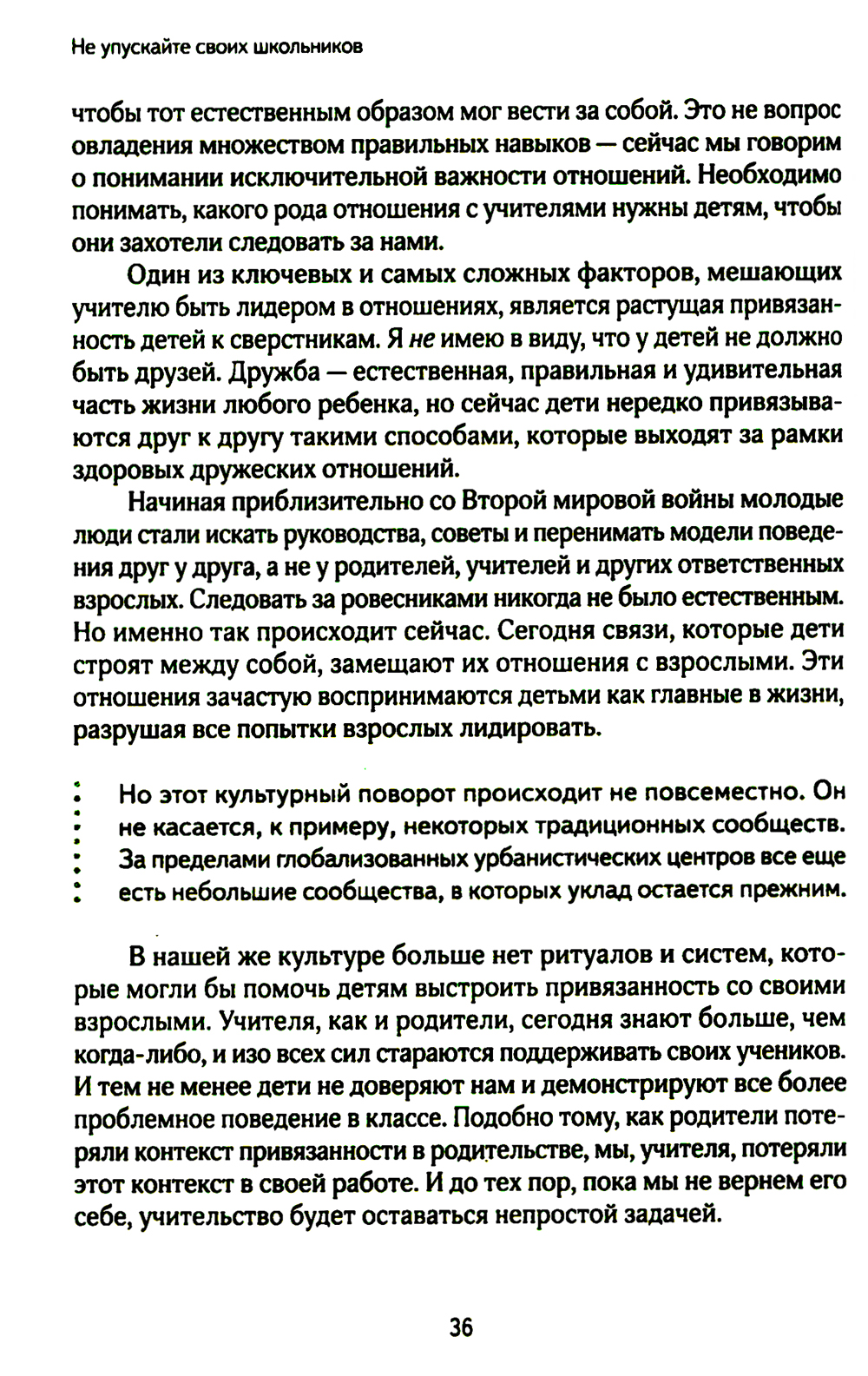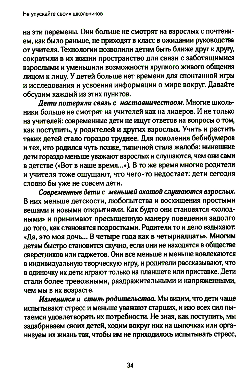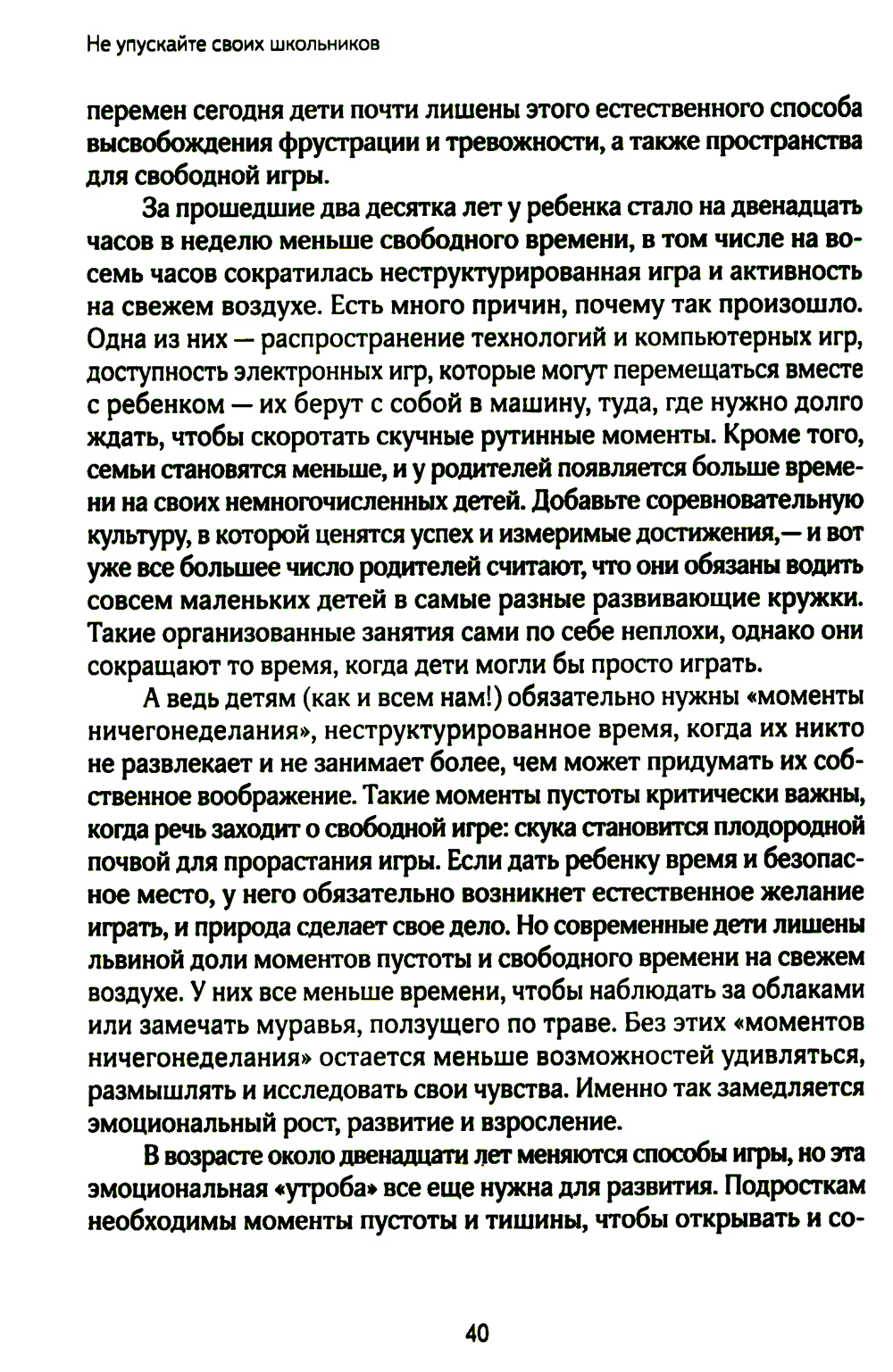 Дети нуждаются в том, чтобы чувствовать себя в безопасности рядом с взрослыми. Это важно для эмоционального благополучия ребенка, успешного обучения дома или в школе, комфортного взаимодействия с одноклассниками. Как стать для школьников таким лидером, на которого они согласятся ориентироваться, за которым захотят идти, у которого будут учиться радостно и успешно? Основой, точкой отсчета на пути к эмоциональному благополучию и эффективному обучению являются отношения, утверждают авторы. Именно тому, как добиться доверия детей, завоевать у них авторитет без фамильярности и панибратства, посвящена книга «Не упускайте своих школьников» Ханны Бич и Тамары Нью-фелд Страйджек. Она окажет неоценимую поддержку и родителям и учителям, когда они сталкиваются с проблемным поведением и сложностями в обучении. Научившись понимать причины такого поведения и эмоциональные потребности каждого ребенка, вы сами удивитесь, насколько легче будет работать в атмосфере дружелюбия и взаимопонимания, по-новому взглянете на свое призвание и обретете второе дыхание.| Издательство | Ресурс |
