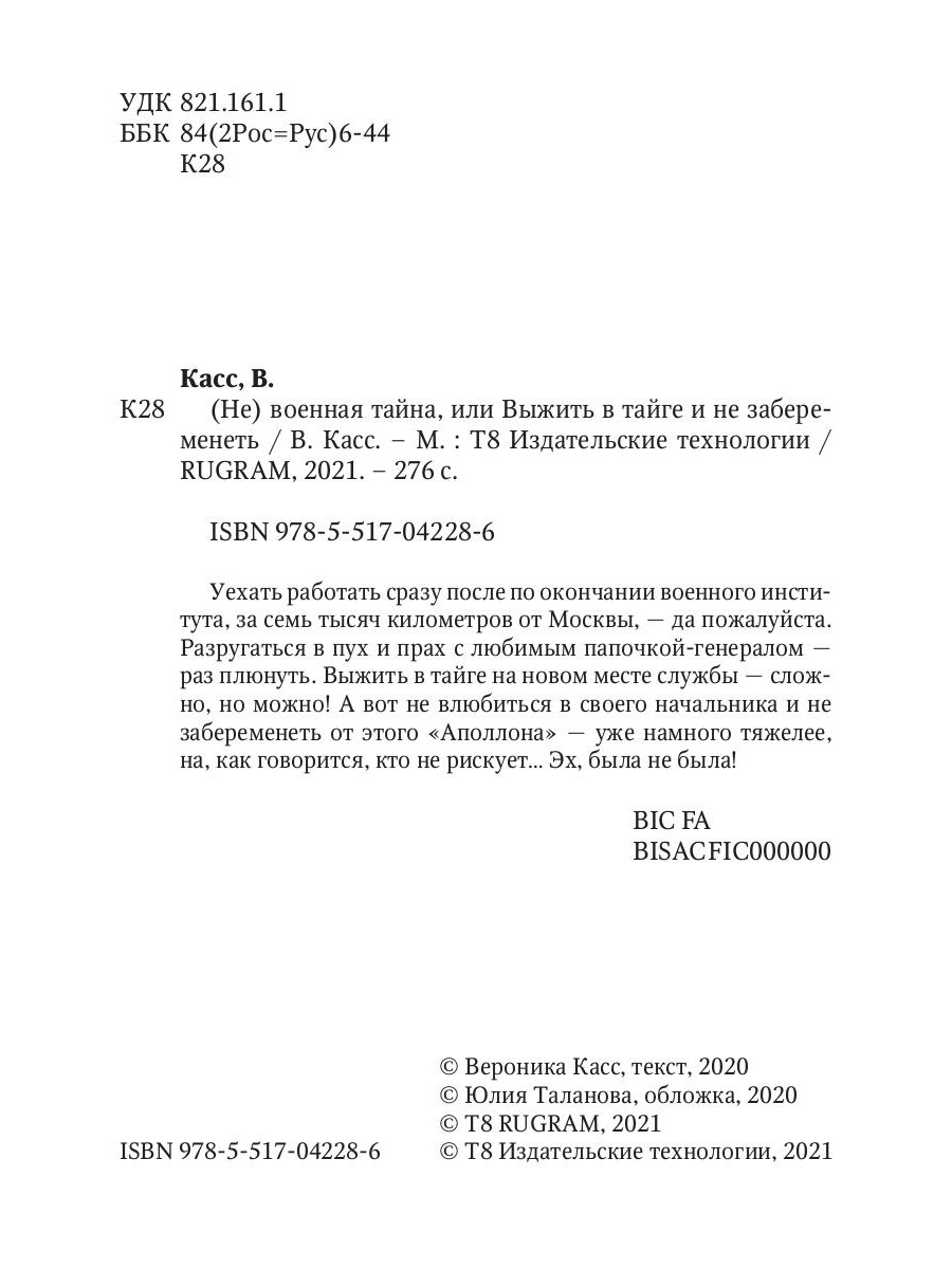 Уехать работать сразу после по окончании военного института, за семь тысяч километров от Москвы, - да пожалуйста. Разругаться в пух и прах с любимым папочкой-генералом - раз плюнуть. Выжить в тайге на новом месте службы - сложно, но можно! А вот не влюбиться в своего начальника и не забеременеть от этого «Аполлона» - уже намного тяжелее, на, как говорится, кто не рискует… Эх, была не была!| Издательство | Т8 RUGRAM |