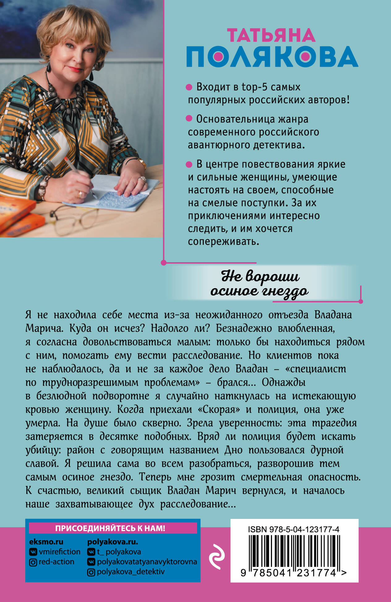Я не находила себе места из-за неожиданного отъезда Владана Марича. Куда он исчез? Надолго ли? Безнадежно влюбленная, я согласна довольствоваться малым: только бы находиться рядом с ним, помогать ему вести расследование. Но клиентов пока не наблюдалось, да и не за каждое дело Владан - «специалист по трудно разрешимым проблемам» - брался… Однажды в безлюдной подворотне я случайно наткнулась на истекающую кровью женщину. Когда приехала «Скорая» и полиция, она уже умерла. На душе было скверно. Зрела уверенность: эта трагедия затеряется в десятке подобных. Вряд ли полиция будет искать убийцу: район с говорящим названием Дно пользовался дурной славой. Я решила сама во всем разобраться, разворошив тем самым осиное гнездо. Теперь мне грозит смертельная опасность. К счастью, великий сыщик Владан Марич вернулся, и началось наше захватывающее дух расследование… Татьяна Полякова - один из самых популярных российских писателей в жанре детектива. За время писательской карьеры из-под ее пера вышло более 85 книг общим тиражом более 36 миллионов экземпляров. По свидетельствам читателей, романы Татьяны Поляковой - это «захватывающий сюжет и непредсказуемая развязка, обаятельные герои и невероятные приключения, легкий стиль и яркие диалоги».| Издательство | ООО "Издательство "Эксмо" |
