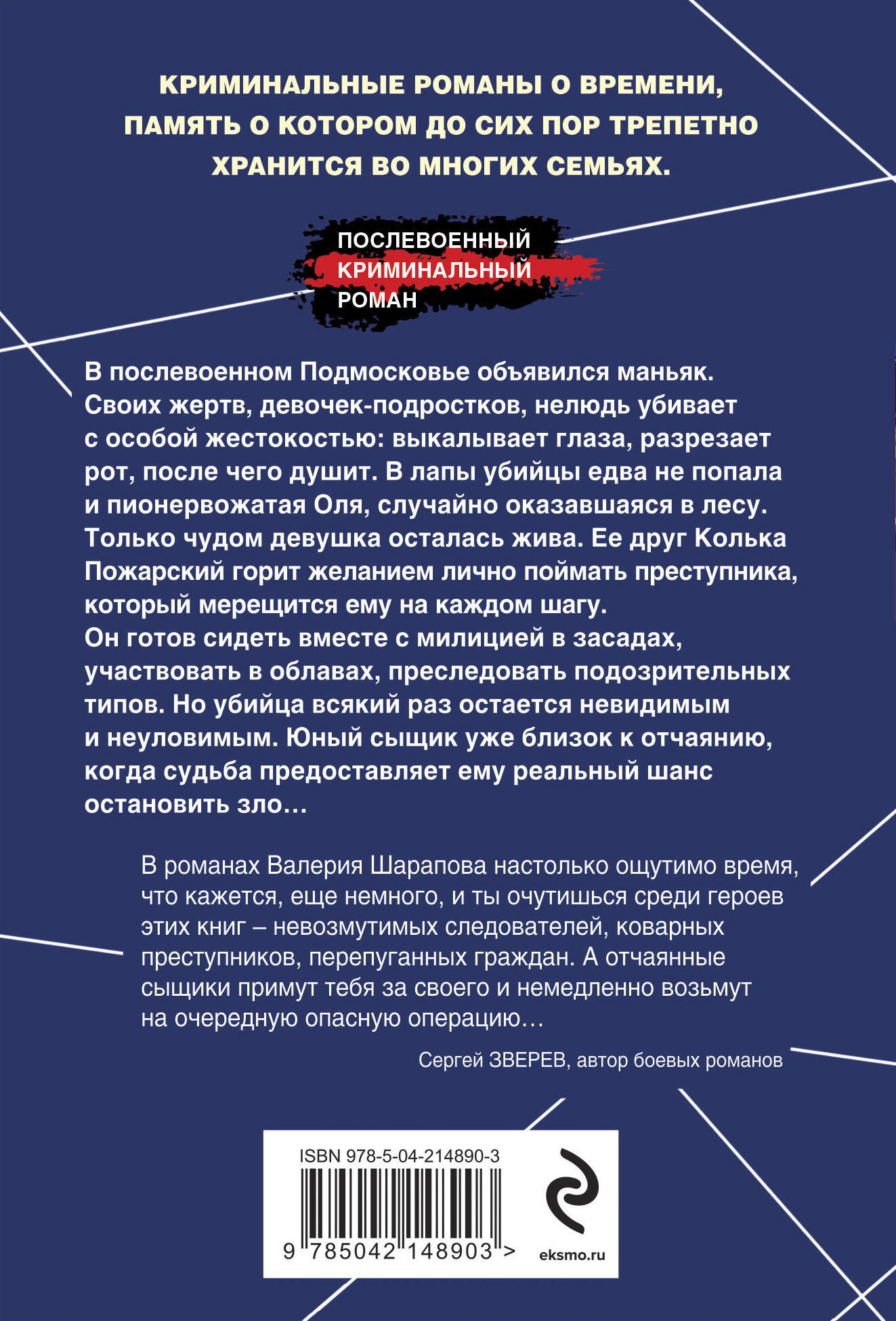 В послевоенном Подмосковье объявился маньяк. Своих жертв, девочек-подростков, нелюдь убивает с особой жестокостью: выкалывает глаза, разрезает рот, после чего душит. В лапы убийцы едва не попала и пионервожатая Оля, случайно оказавшаяся в лесу. Только чудом девушка осталась жива. Ее друг Колька Пожарский горит желанием лично поймать преступника, который мерещится ему на каждом шагу. Он готов сидеть вместе с милицией в засадах, участвовать в облавах, преследовать подозрительных типов. Но убийца всякий раз остается невидимым и неуловимым. Юный сыщик уже близок к отчаянию, когда судьба предоставляет ему реальный шанс остановить зло… Атмосфера становления послевоенного поколения, близкая многим читателям, когда пьянит дух молодости и свободы. Когда от «все можно» до «стой, стрелять буду» - один шаг. Криминальные романы о времени, память о котором до сих пор трепетно хранится во многих семьях. Персонажи, похожие на культовые образы фильма «Прощай, шпана замоскворецкая». ------------------------------ «В романах Валерия Шарапова настолько ощутимо время, что кажется, еще немного, и ты очутишься среди героев этих книг - невозмутимых следователей, коварных преступников, перепуганных граждан. А отчаянные сыщики примут тебя за своего и немедленно возьмут на очередную опасную операцию…» - Сергей ЗВЕРЕВ, автор боевых романов| Издательство | ООО "Издательство "Эксмо" |
