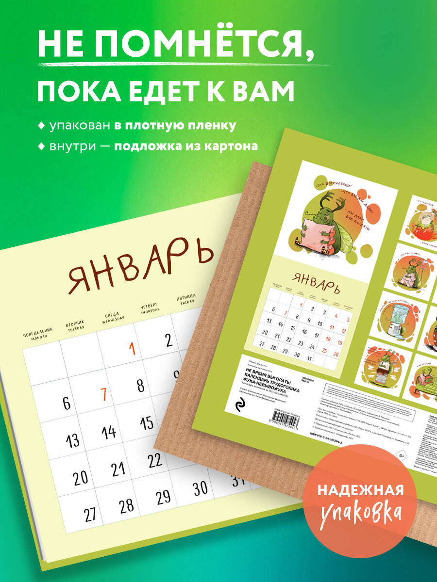 О серии: Наши настенные календари отличаются высоким качеством исполнения! Тщательно подобранные иллюстрации, напечатанные на матовой бумаге высочайшего качества, станут настоящим украшением дома, а в календарной сетке найдется место для ваших планов: большие клетки позволят делать записи и организовать свой год! В календаре также отмечены все государственные праздники. В серии настенных календарей издательства «ЭКСМО» каждый найдет тему по вкусу: великие художники, великолепные подборки с самыми знаменитыми произведениями искусства, легендарные кинематографические саги и игры, главные книжные авторы и бестселлеры, фотографии и иллюстрации любимых животных и многое-многое другое! О календаре: Календарь «Не время выгорать!» - это 12 ярких и смешных иллюстраций о жуке, который выгорел на работе и больше не вывозит… Он пытается выспаться, собраться с силами и обещает быть продуктивным в 2025 году! Для кого: Высокое качество полиграфического исполнения прекрасно дополняют забавные иллюстрации и смешные подписи к ним. Оценят настоящие трудоголики, которые близки к выгоранию и относятся к этому с юмором! Технические параметры: - Тип календаря - настенный перекидной. - Год - 2025. - Календарная сетка - с разбивкой по месяцам. - Вид скрепления - скрепка. - Ширина - 30 см. - Высота - 30 см. - Внутренний блок - мелованная бумага 115 г/м2. - Подложка - плотный гофрокартон для поддержания формы. - Индивидуальная упаковка в плотный целлофановый пакет.| Издательство | ООО "Издательство "Эксмо" |