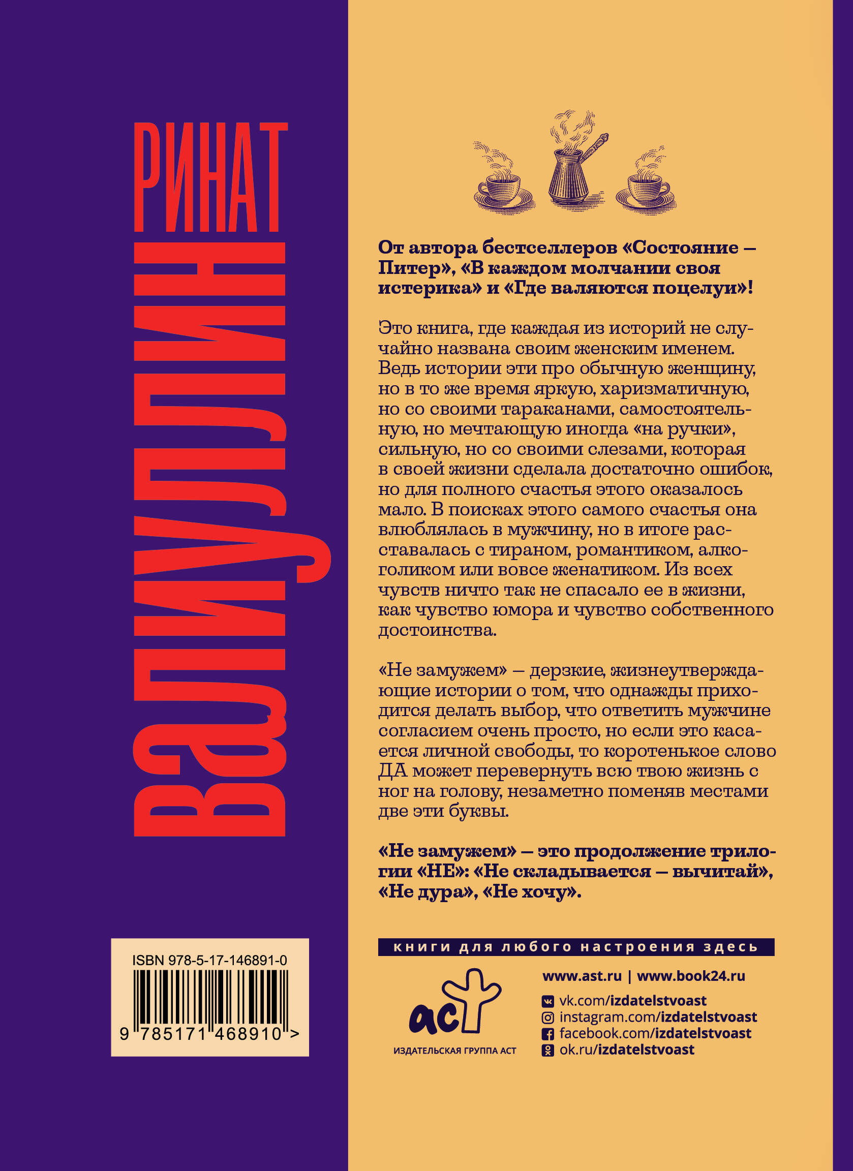 Ринат Валиуллин - писатель, поэт, автор бестселлеров «Состояние - Питер», «Где валяются поцелуи», «Легкомыслие» и многих других. Писатель завоевал сердца читателей благодаря тонкому психологическому чутью, фирменному литературному стилю, емким жизненным цитатам, которые применяют в своей практике даже психологи и коучи. Его новая книга «Не замужем» - продолжение популярной трилогии «НЕ», в которую вошли полюбившиеся десяткам тысяч читателей «Не складывается - вычитай», «Не дура» и «Не хочу». «Не замужем» - жизнеутверждающие истории о женщинах, которые ищут свое счастье, иногда ошибаются, но никогда - не сдаются. И помогают им в этом чувство юмора и чувство собственного достоинства! Книги Рината Валиуллина - это увлекательное путешествие в мир человеческих чувств, истории о настоящих людях. В книге авторские иллюстрации, специально отобранные для серии.| Издательство | АСТ |