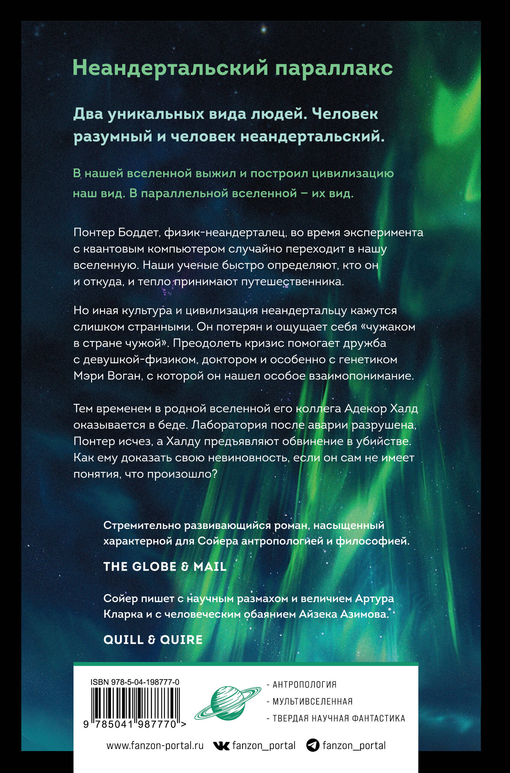 Лауреат премий «Хьюго» и «Аврора». Два уникальных человеческих вида. Человек разумный и человек неандертальский. Именно неандертальцы стали доминирующим видом в параллельном мире. Их цивилизация сравнима с нашей, наука и технология - более высокоразвиты, а культура, общество и философия - радикально иные. Понтер Боддет, неандертальский физик, случайно нарушает барьер между мирами и переносится в нашу вселенную. Почти сразу его признают неандертальцем, а лишь позже - ученым. Он оказывается на карантине, одинокий и растерянный, чужак в чужой стране. Но Понтеру удается подружиться с врачом и физиком, а особенно с канадским генетиком Мэри Воган, с которой у него возникает особое взаимопонимание. Коллега Понтера, Адекор Халд, сталкивается с хаосом в лаборатории, исчезновением тела, подозрением со стороны сородичей и взрывоопасным расследованием дела об убийстве. Как ему доказать свою невиновность, если он понятия не имеет, что на самом деле произошло с Понтером? Контакт между людьми и неандертальцами порождает отношения, чреватые конфликтами, философскими проблемами, угрозой существованию одного вида или другого - или обоих. Отношения в равной степени богатые безграничными возможностями для сотрудничества и роста на многих уровнях, от практического до эстетического, от научного до духовного. «Писатель безграничной уверенности и смелой научной интерпретации». ― The New York Times «Стремительно развивающийся роман, насыщенный характерной для Сойера антропологией и философией». - The Globe & Mail «Роман берет сложные палеоантропологические данные, передовую теоретическую физику и персонажей, которые согреют ваше сердце, и смешивает их в очаровательный, остроумный и провокационный роман. Лучшая антропологическая фантастика». - Майкл Гир «Сойер пишет с научным размахом и величием Артура Кларка и с человеческим обаянием Айзека Азимова». - Quill & Quire| Издательство | ООО "Издательство "Эксмо" |