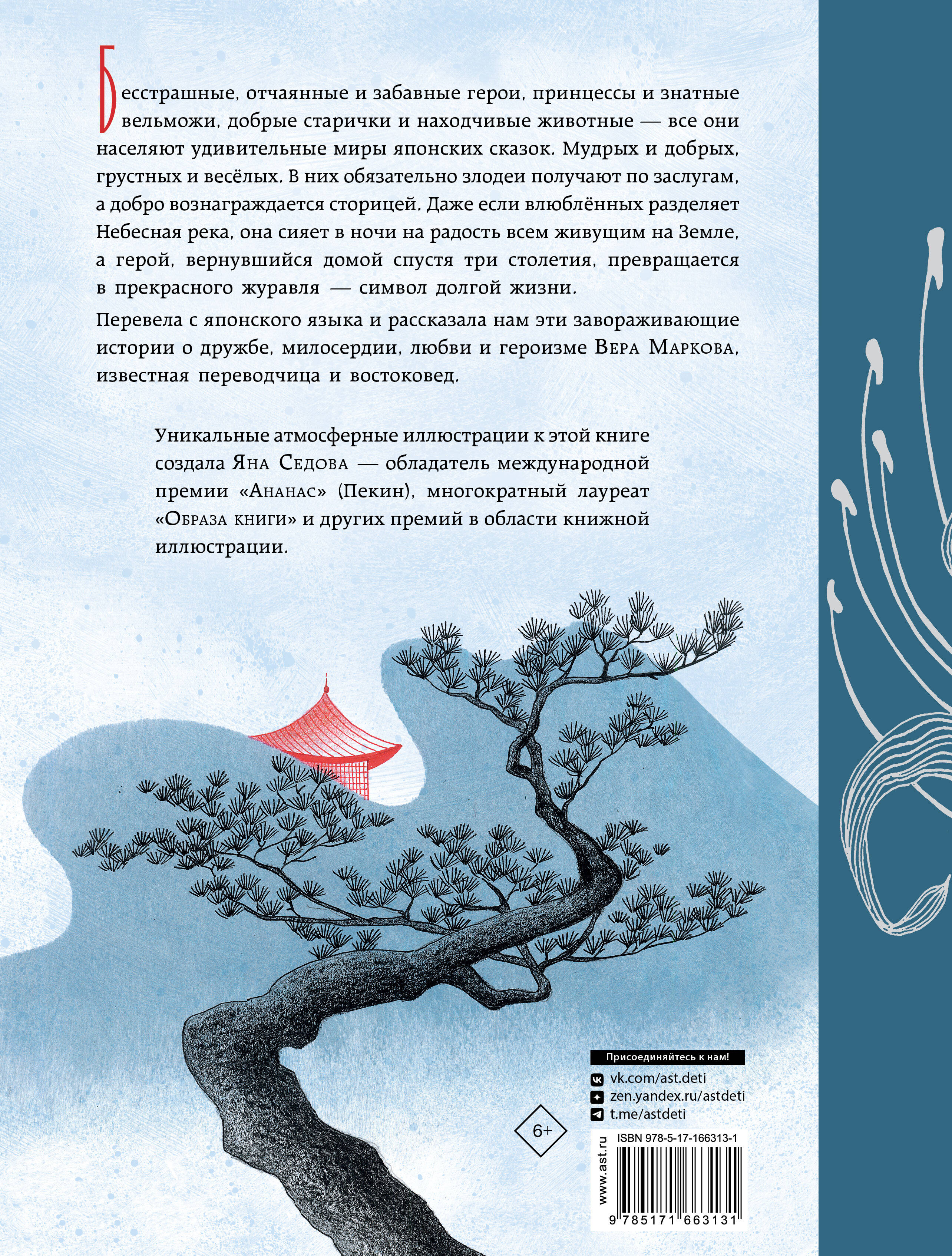 Бесстрашные, отчаянные и забавные герои, принцессы и знатные вельможи, добрые старички и находчивые животные - все они населяют удивительные миры японских сказок. Мудрых и добрых, грустных и весёлых. В них обязательно злодеи получают по заслугам, а добро вознаграждается сторицей. Даже если влюблённых разделяет Небесная река, она сияет в ночи на радость всем живущим на Земле, а герой, вернувшийся домой спустя три столетия, превращается в прекрасного журавля - символ долгой жизни. Перевела с японского языка и рассказала нам эти завораживающие истории о дружбе, милосердии, любви и героизме Вера Маркова, известная переводчица и востоковед. Уникальные атмосферные иллюстрации создала Яна Седова, многократный лауреат "Образа книги" и обладатель международной премии художников-иллюстраторов "Ананас" (Пекин).| Издательство | Издательство "АСТ" |