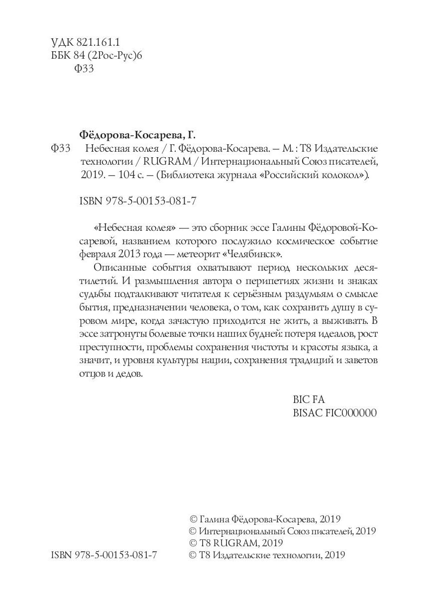 «Небесная колея» - это сборник эссе Галины Фёдоровой-Косаревой, названием которого послужило космическое событие февраля 2013 года - метеорит «Челябинск». Описанные события охватывают период нескольких десятилетий. И размышления автора о перипетиях жизни и знаках судьбы подталкивают читателя к серьёзным раздумьям о смысле бытия, предназначении человека, о том, как сохранить душу в суровом мире, когда зачастую приходится не жить, а выживать. В эссе затронуты болевые точки наших будней: потеря идеалов, рост преступности, проблемы сохранения чистоты и красоты языка, а значит, и уровня культуры нации, сохранения традиций и заветов отцов и дедов.| Издательство | Т8 RUGRAM |