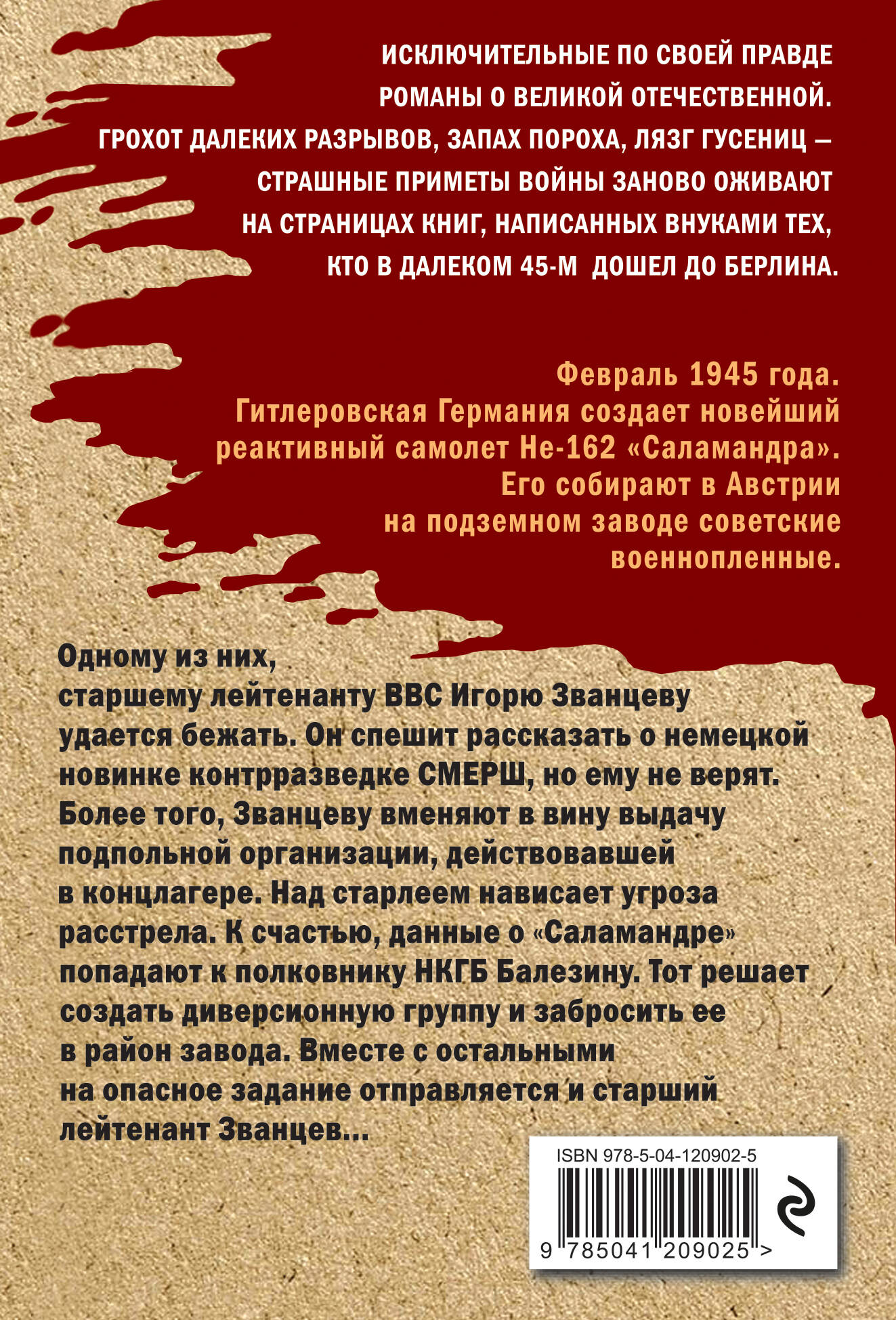 Исключительные по своей правде романы о Великой Отечественной. Грохот далеких разрывов, запах пороха, лязг гусениц - страшные приметы войны заново оживают на страницах книг, написанных внуками тех, кто в далеком 1945-м дошел до Берлина. Февраль 1945 года. Гитлеровская Германия создает новейший реактивный самолет Не-162 «Саламандра». Его собирают в Австрии на подземном заводе советские военнопленные. Одному из них, старшему лейтенанту ВВС Игорю Званцеву, удается бежать. Он спешит рассказать о немецкой новинке контрразведке СМЕРШ, но ему не верят. Более того, Званцеву вменяют в вину выдачу подпольной организации, действовавшей в концлагере. Над старлеем нависает угроза расстрела. К счастью, данные о «Саламандре» попадают к полковнику НКГБ Балезину. Тот решает создать диверсионную группу и забросить ее в район завода. Вместе с остальными на опасное задание отправляется и старший лейтенант Званцев…| Издательство | ООО "Издательство "Эксмо" |