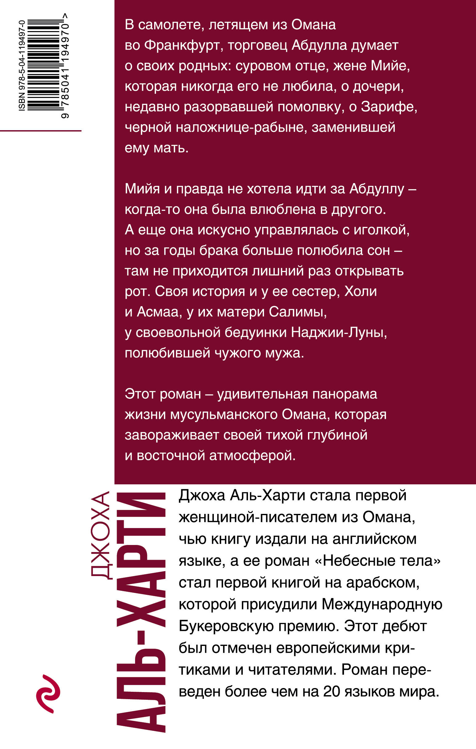 Джоха Аль-Харти стала первой писателем-женщиной из Омана, чью книгу перевели на английский язык, а ее роман «Небесные тела» стал первой книгой на арабском, которой присудили Международную Букеровскую премию. Этот дебют был отмечен европейскими критиками и читателями не без причины - Альхарти создает глубокую и очень личную панораму жизни одной вымышленной оманской деревушки, где строгие устои веры сплетаются с язычеством, рабство - с милосердием, где любовь идет рука об руку с жестокостью, где средневековые феодальные нравы на полной скорости сталкиваются с локомотивом современности. В аль-Авафи жизнь много лет идет заведенным порядком. Арабские семьи прорастают в этой пустынной земле корнями, поколение за поколением, существуя бок о бок с кочевниками-бедуинами и африканскими рабами, исполняющими среди дюн обряды зара. После обнаружения нефтяных месторождений и вмешательства британцев во внутреннюю политику Омана баланс сил и ритм традиционного уклада нарушается. В романе звучит полифония голосов меняющегося аль-Авафи - его женщин, мужчин, рабов, стариков, его отступников и бунтарей. Овеянная восточным колоритом - благовониями, сладкими финиками, узорами хной, крепким кофе, пустынными песками, - перед нами проходит запечатленная в памяти разных людей череда рождений, свадеб, смертей, череда надежд и разочарований. Словно небесные тела, их судьбы скользят по изменчивым орбитам, то сходясь, то, встретившись, отталкиваясь навсегда. В этом романе скрыта правда арабского мира во всей его многогранной сложности, его истинные достоинства и его проблемы - и о том, и о другом современный западный читатель понимает ничтожно мало.| Издательство | ООО "Издательство "Эксмо" |