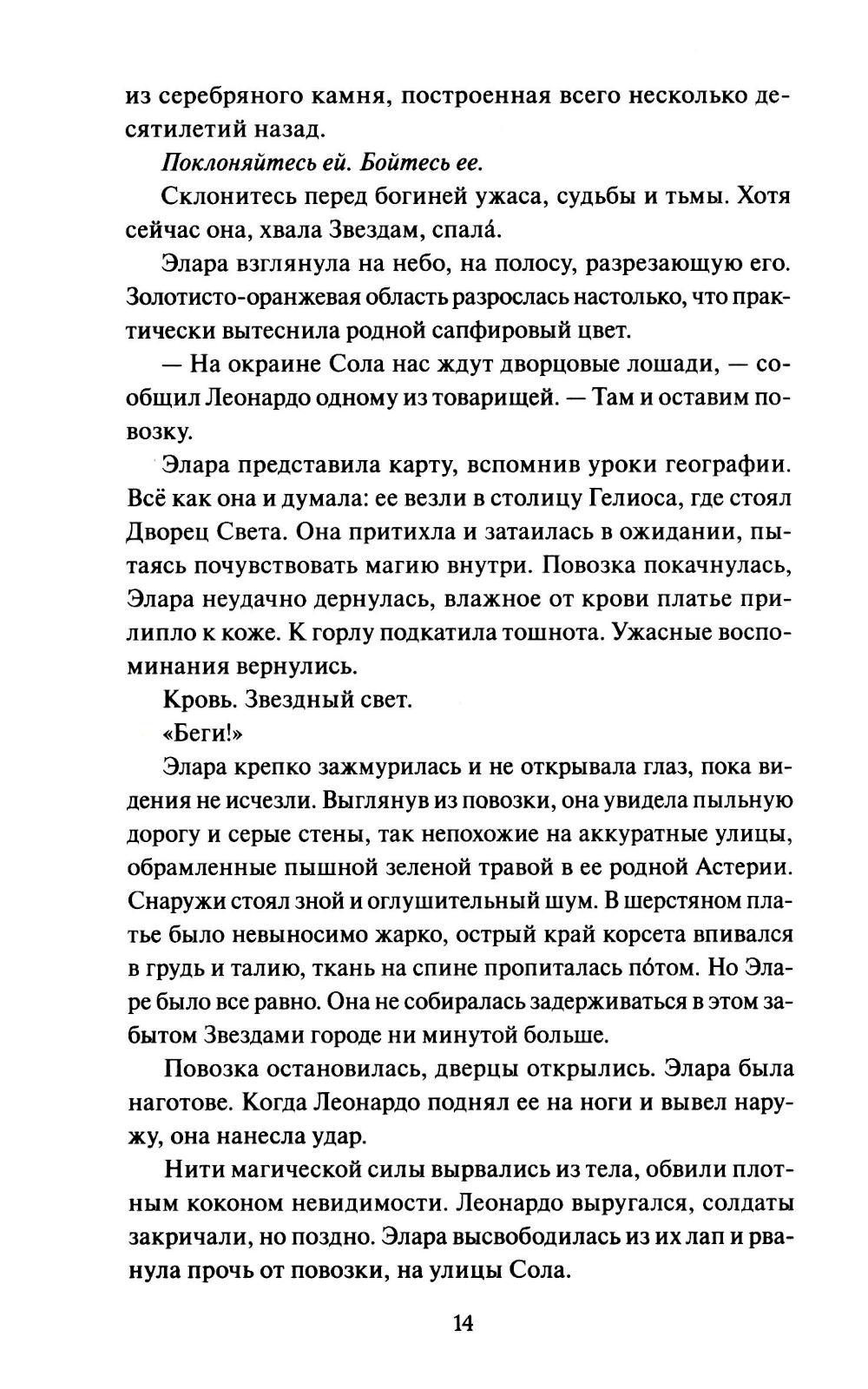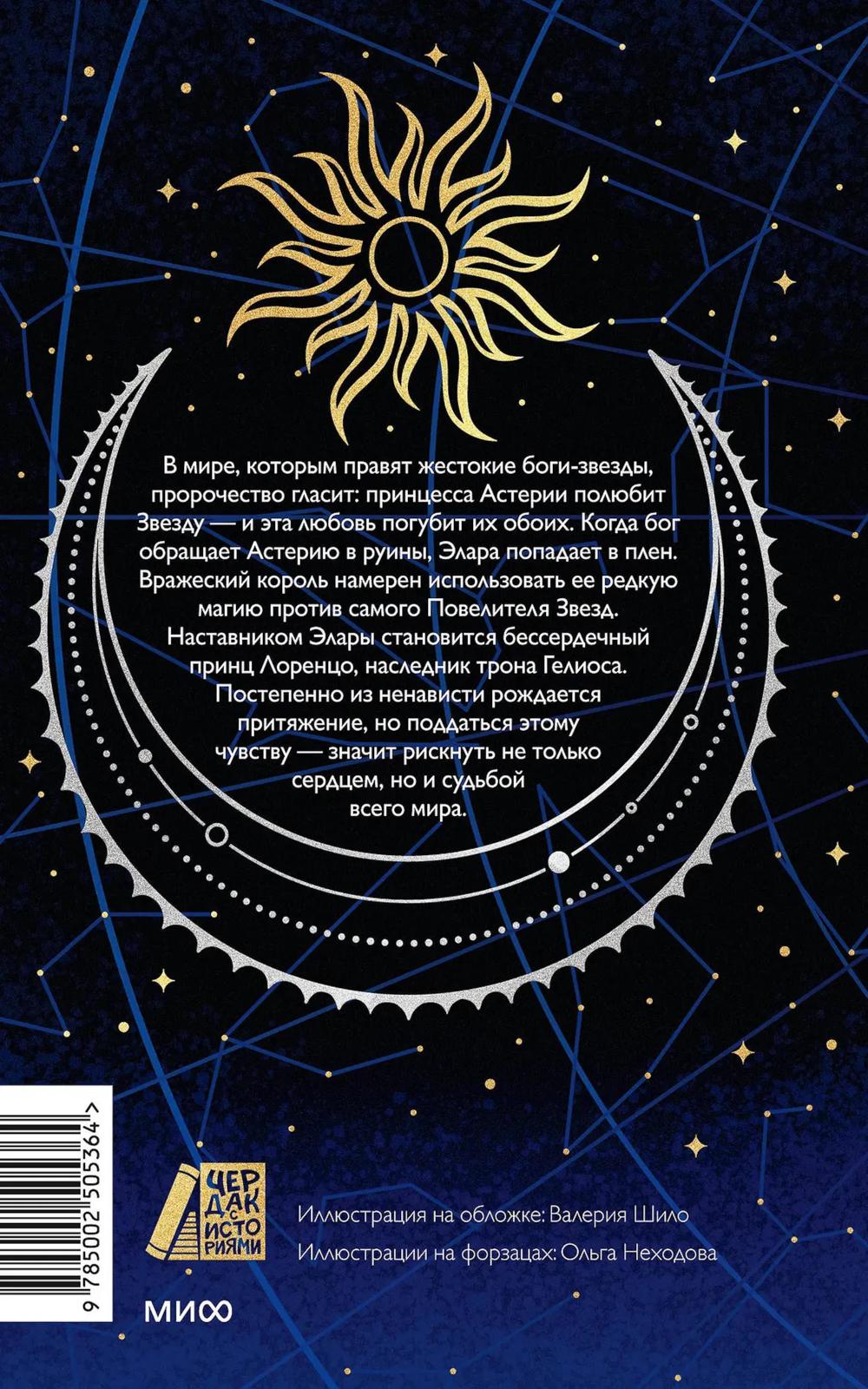В мире, которым правят жестокие боги-звезды, пророчество гласит: принцесса Астерии полюбит Звезду - и эта любовь погубит их обоих. Когда бог обращает Астерию в руины, Элара попадает в плен. Вражеский король намерен использовать ее редкую магию против самого Повелителя Звезд. Наставником Элары становится бессердечный принц Лоренцо, наследник трона Гелиоса. Постепенно из ненависти рождается притяжение, но поддаться этому чувству - значит рискнуть не только сердцем, но и судьбой всего мира.| Издательство | Манн, Иванов и Фербер |