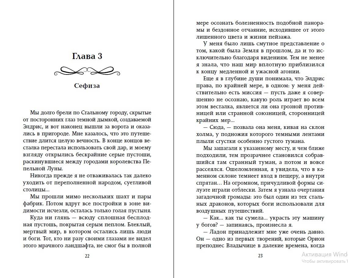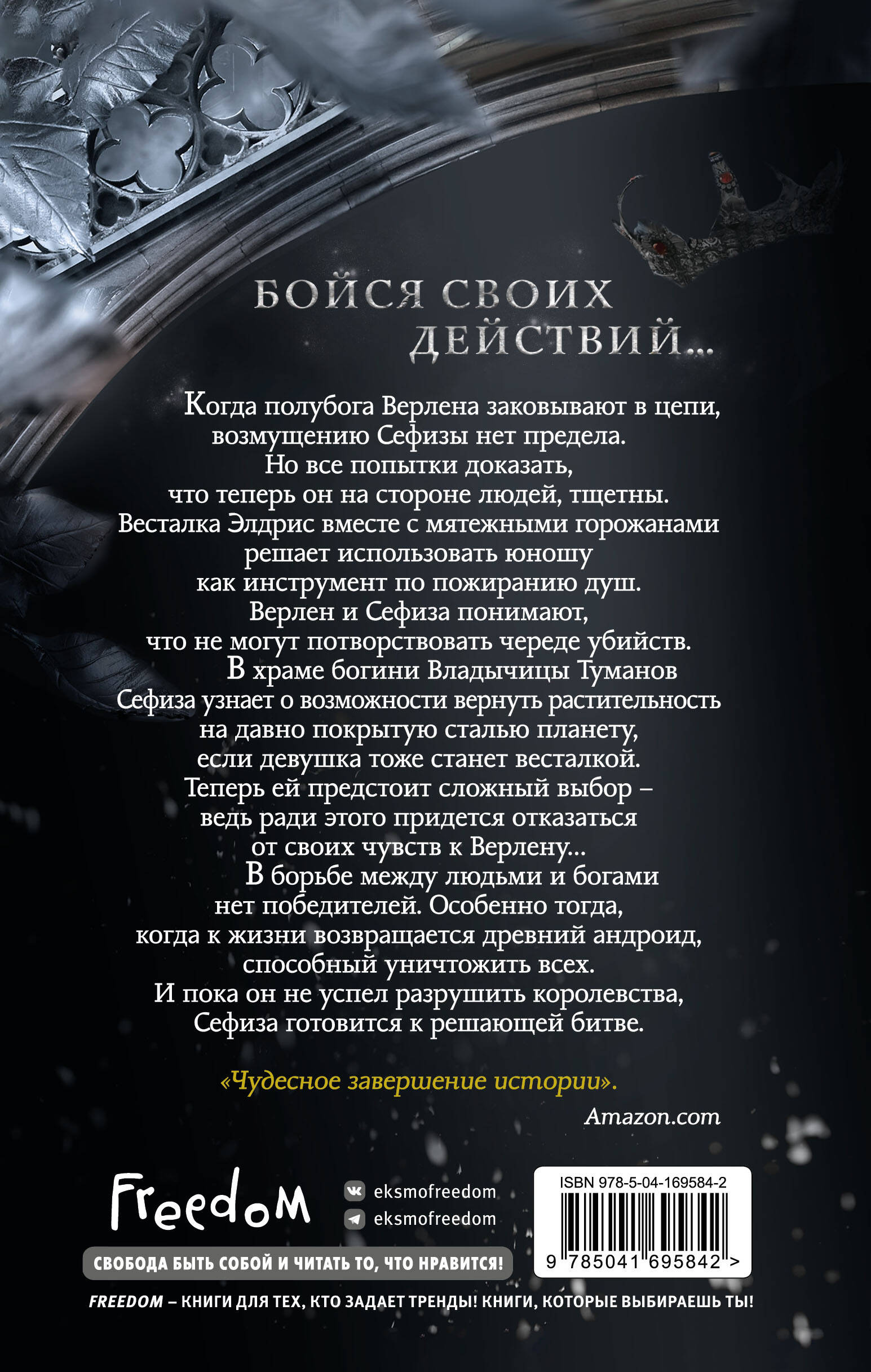 Ошеломляющая история в стиле стимпанк! Жестокие боги и люди с механическими телами на страницах этого мрачного фэнтези-романа. Стальной город, где нет ничего живого… и лишь пепел витает в воздухе! Интересное построение мира, неожиданный сюжет и неординарные характеры героев. Когда полубога Верлена заковывают в цепи, возмущению Сефизы нет предела. Но все попытки доказать, что теперь он на стороне людей, тщетны. Весталка Элдрис вместе с мятежными горожанами решает использовать юношу как инструмент по пожиранию душ. Верлен и Сефиза понимают, что не могут потворствовать череде убийств. В храме богини Владычицы Туманов Сефиза узнает о возможности вернуть растительность на давно покрытую сталью планету, если девушка тоже станет весталкой. Теперь ей предстоит сложный выбор - ведь ради этого придется отказаться от своих чувств к Верлену… В борьбе между людьми и богами нет победителей. Особенно тогда, когда к жизни возвращается древний андроид, способный уничтожить всех. И пока он не успел разрушить королевства, Сефиза готовится к решающей битве. «Чудесное завершение истории». - Amazon