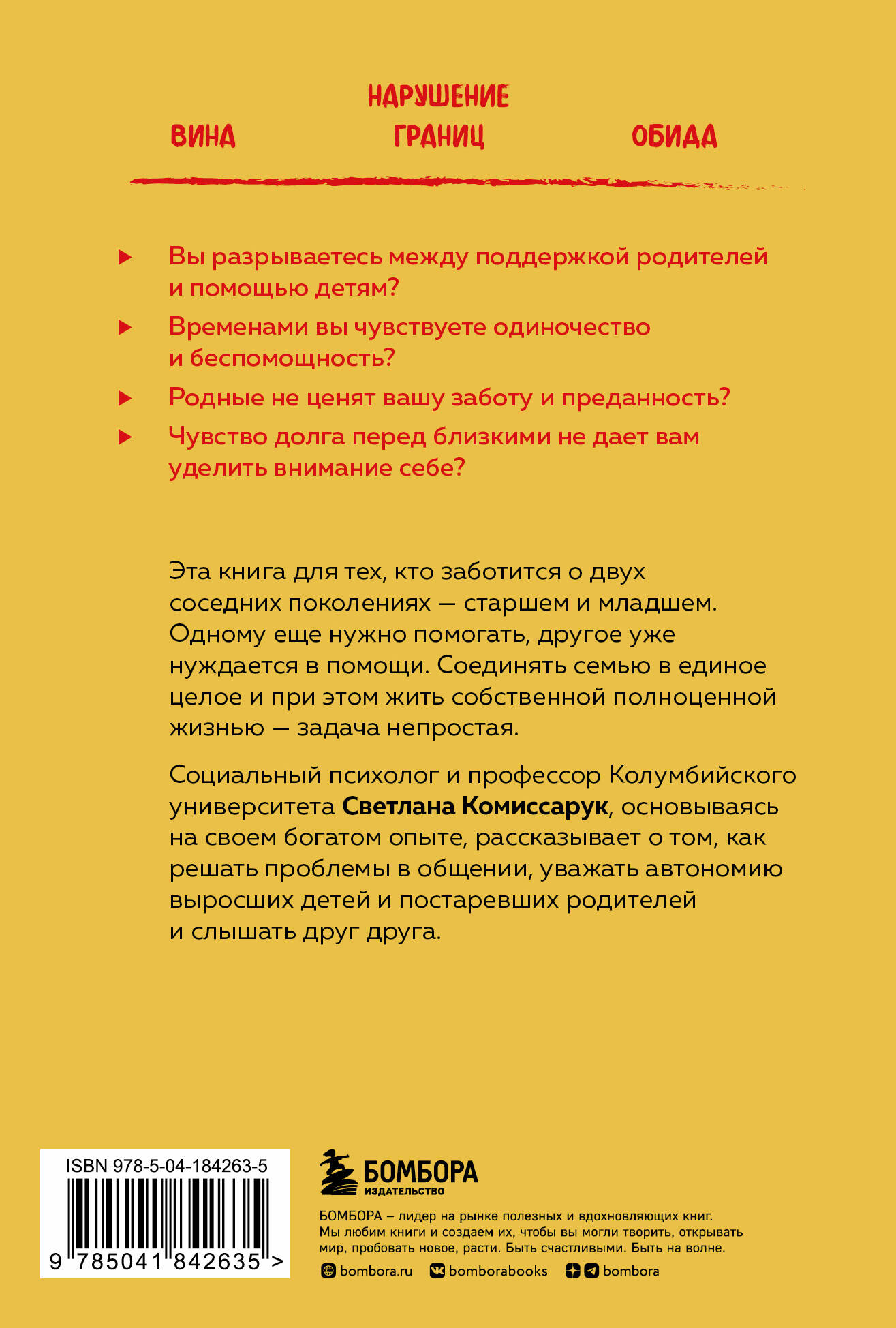 Эта книга для тех, кто находится между двух поколений, младшим и старшим. Одному еще надо помогать, другое уже нуждается в помощи. Соединять семью в единое целое и при этом жить собственной полноценной жизнью - задача непростая. Как решать проблемы в общении, уважать автономию выросших детей и постаревших родителей и слышать друг друга? Что делать, если родные не ценят вашу заботу, преданность, нарушают личные границы и упрекают? Ответы, которые вы найдете в книге Светланы Комиссарук, основаны на теориях и практиках современной психологии и богатом опыте психолога. ОБ АВТОРЕ Светлана Комиссарук - социальный психолог, профессор Колумбийского университета, исследователь в одной из лучших психологических лабораторий в мире - лаборатории профессора Тори Хиггинса, консультант в Международном Институте Адаптации. ДЛЯ КОГО КНИГА ● для тех, кто оказался между двумя поколениями, чтобы понимать и принимать своих близких и уметь наслаждаться возрастом счастья; ● для старшего поколения, представители которого любят вникать и познавать новое; ● для детей, которые лучше поймут родителей, прочитав об их культуре и нашем взгляде на мир; ● для психологов, коучей и групповых терапевтов, которым будут интересны теории и практики, предложенные в книге.| Издательство | ООО "Издательство "Эксмо" |